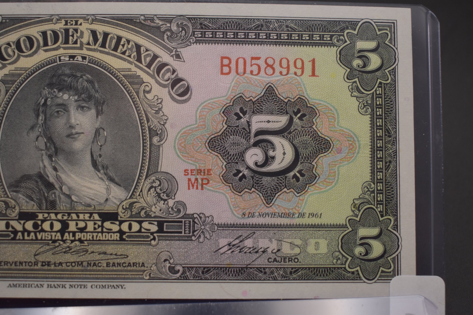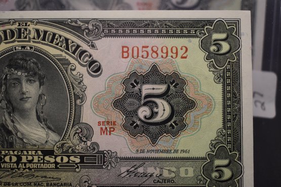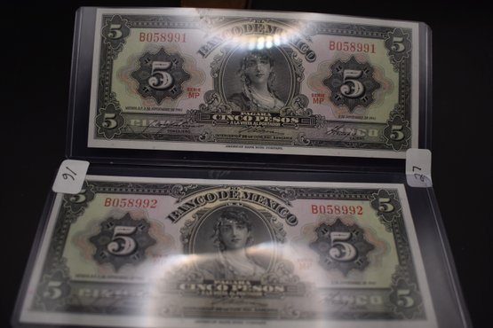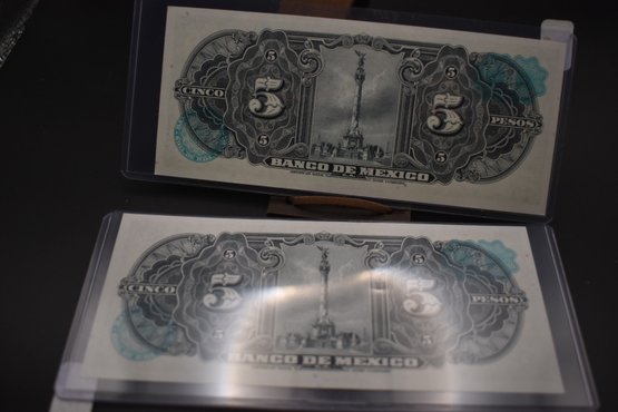 two 1961 5 Peso Uncirculated Consecutive Notes Bank of Mexico
