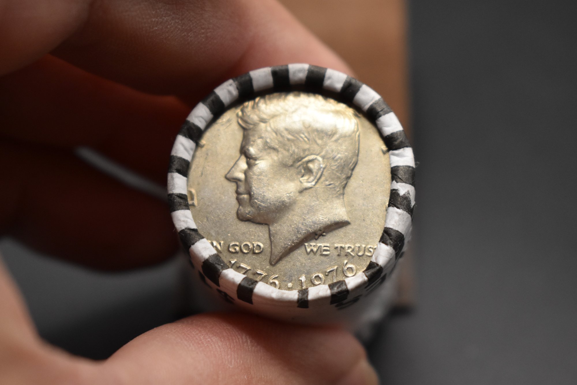 Unsearched Bank Roll of 50 cent Kennedy Half Dollar 1976 on one end
