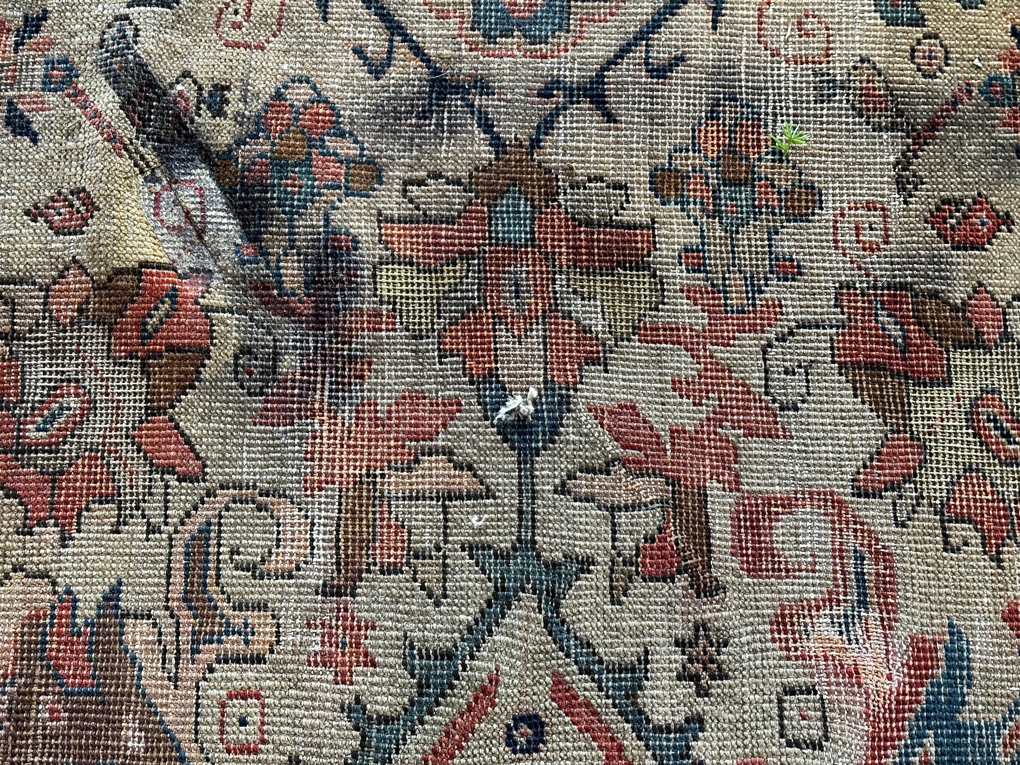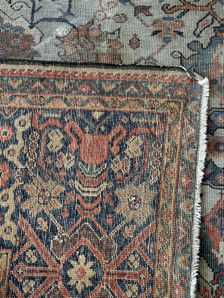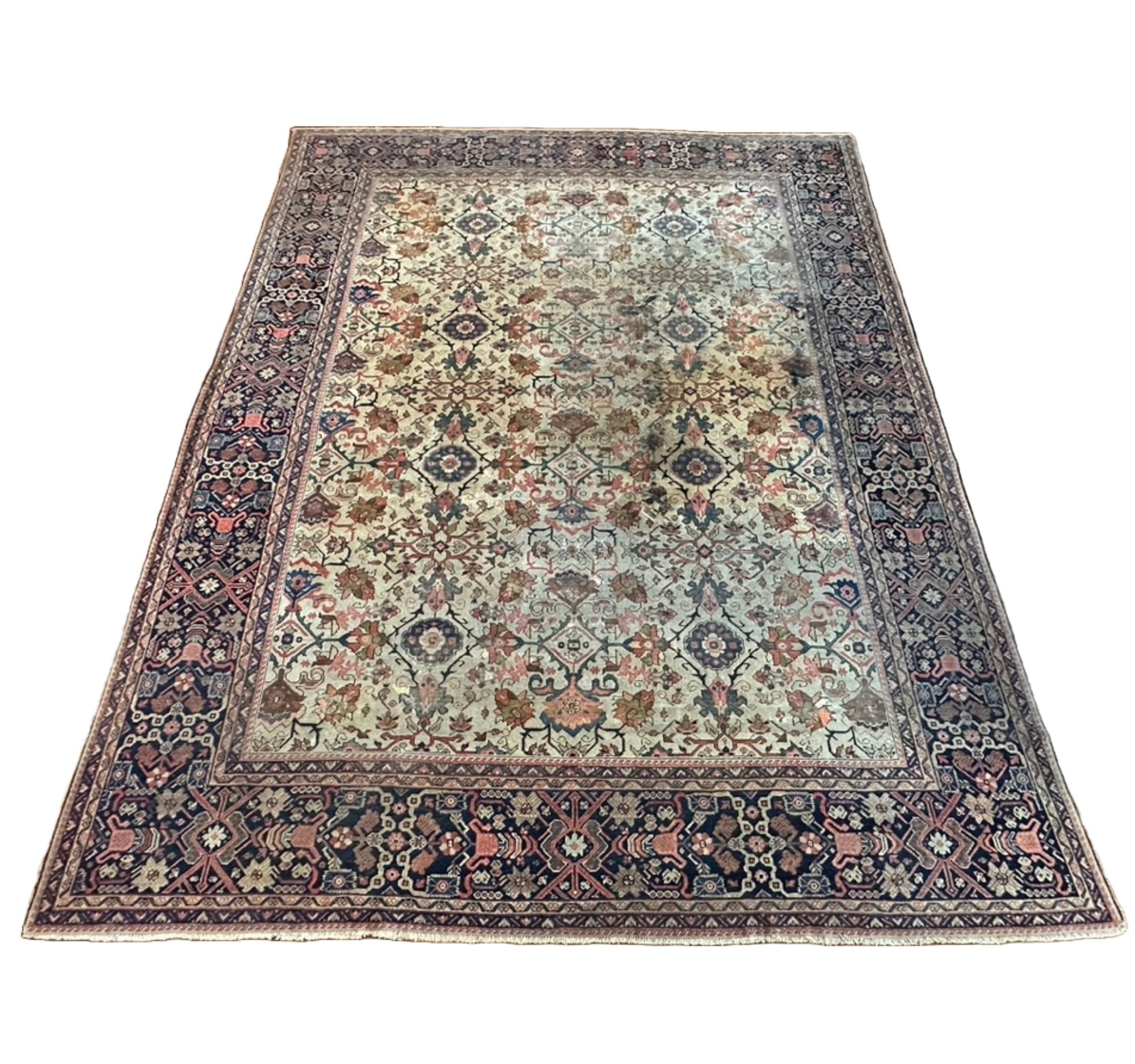 An open field ivory background with hues of reds and blues. Possibly a Ziegler Mahal or Fereghan type carpet. Circa 1900s.