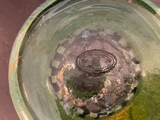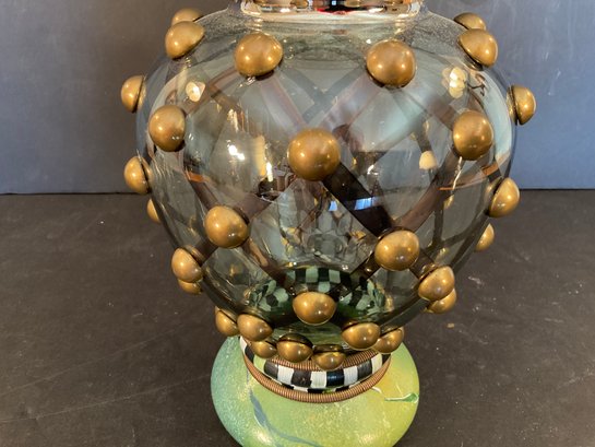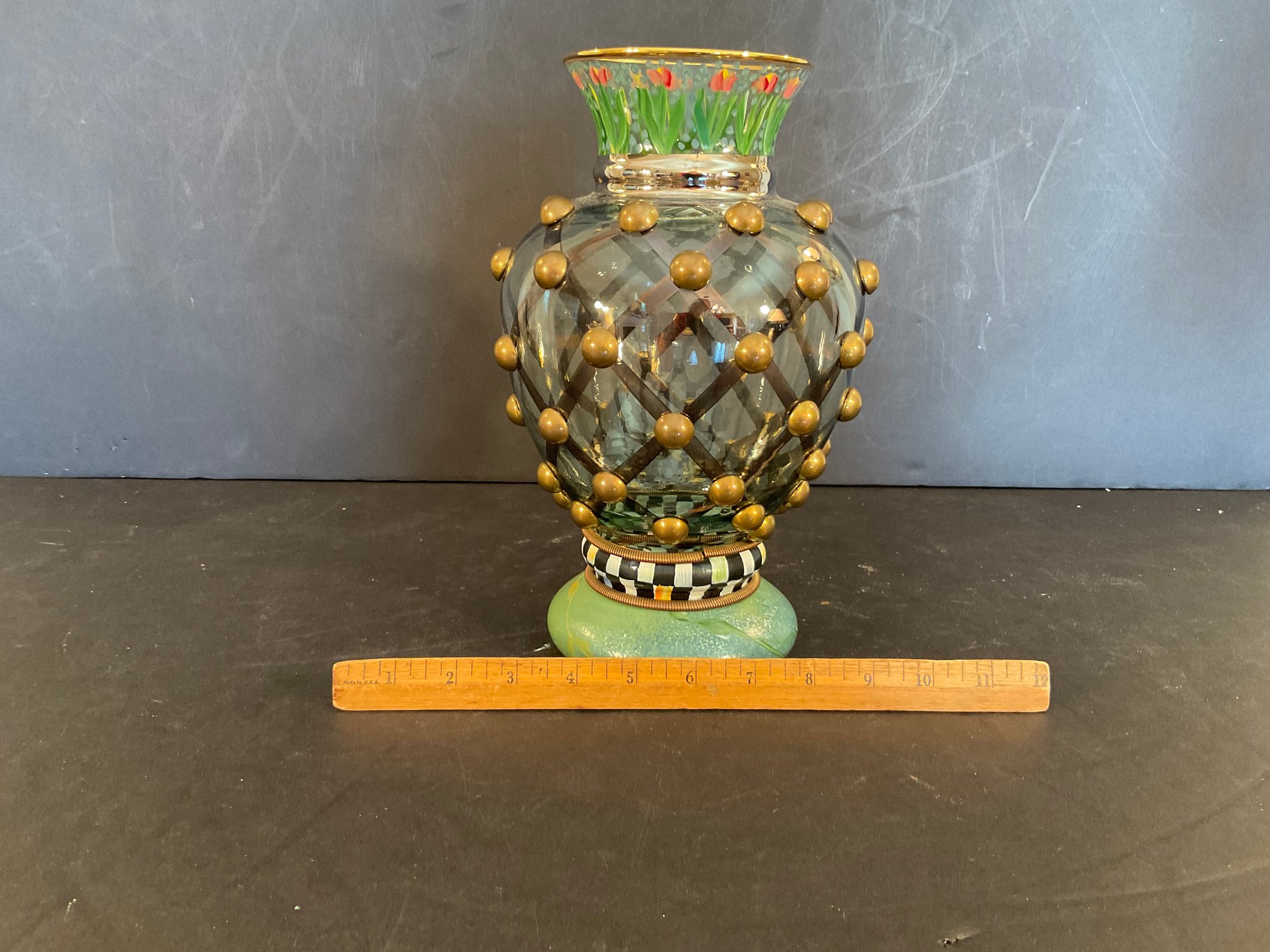 A large glass paint decorated vase in the "circus" pattern with lattice motif and gold buttons. Original sticker label on the bottom.
