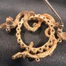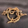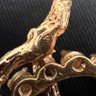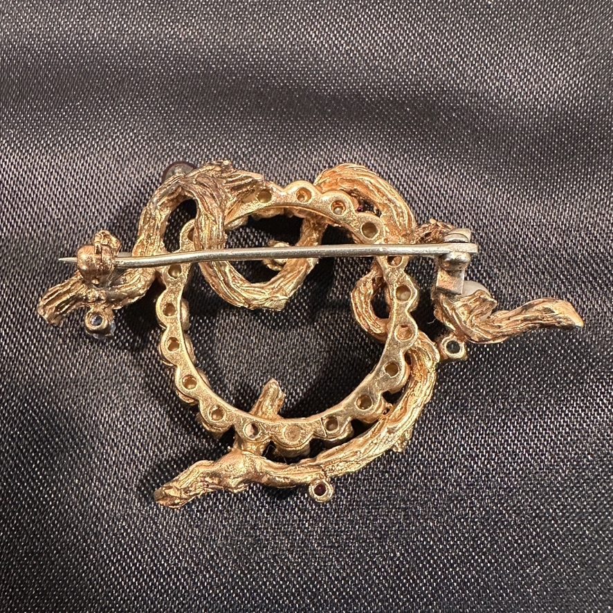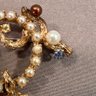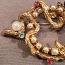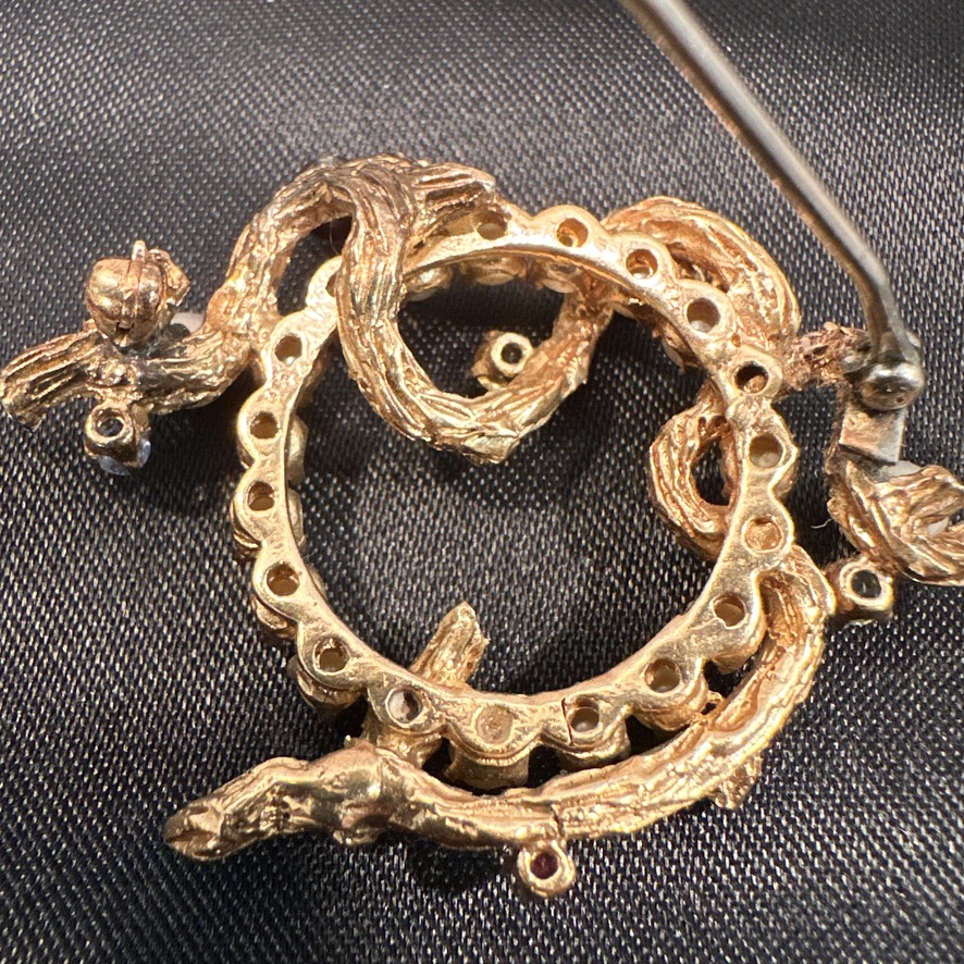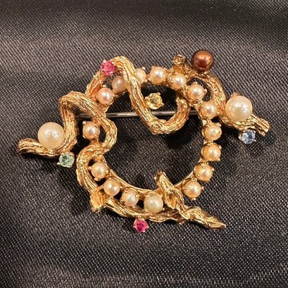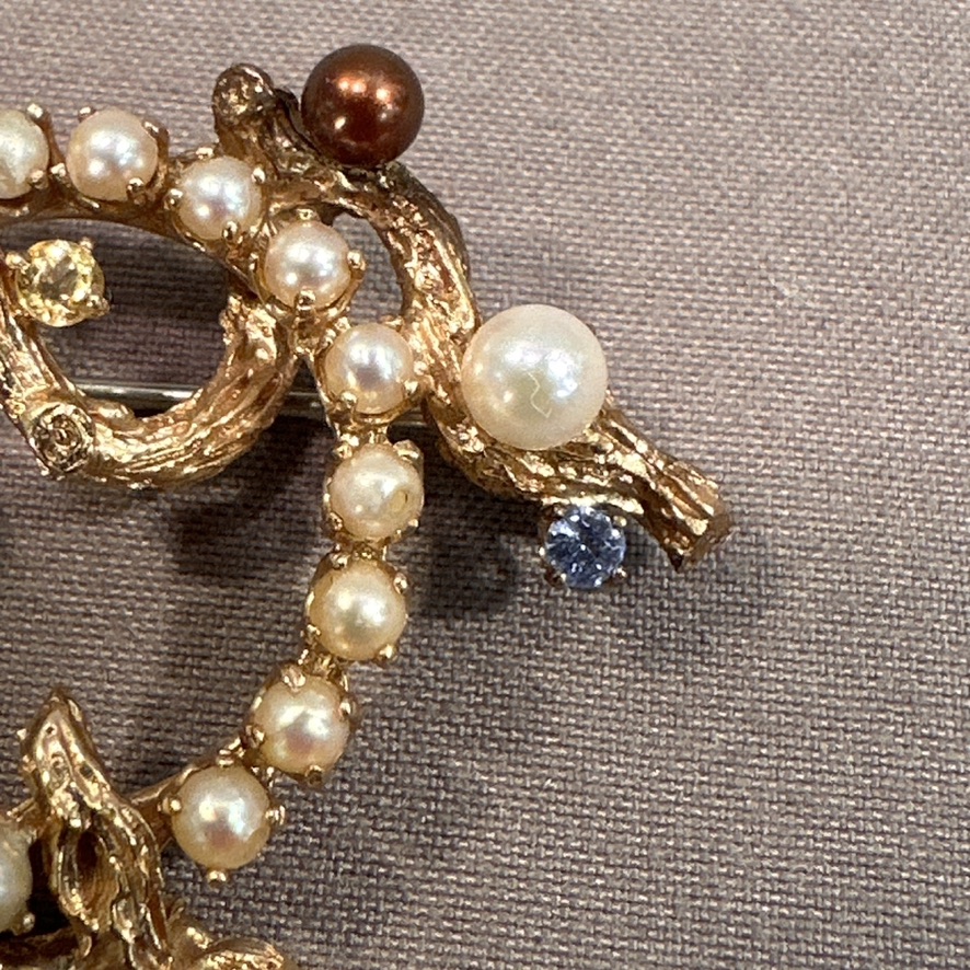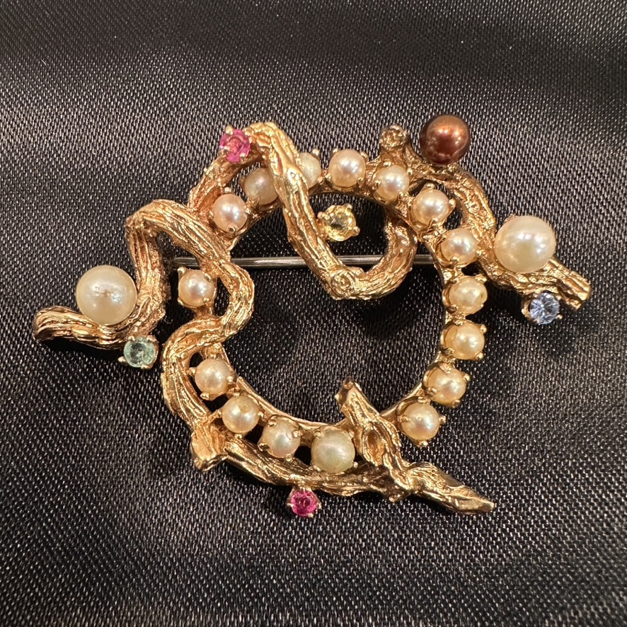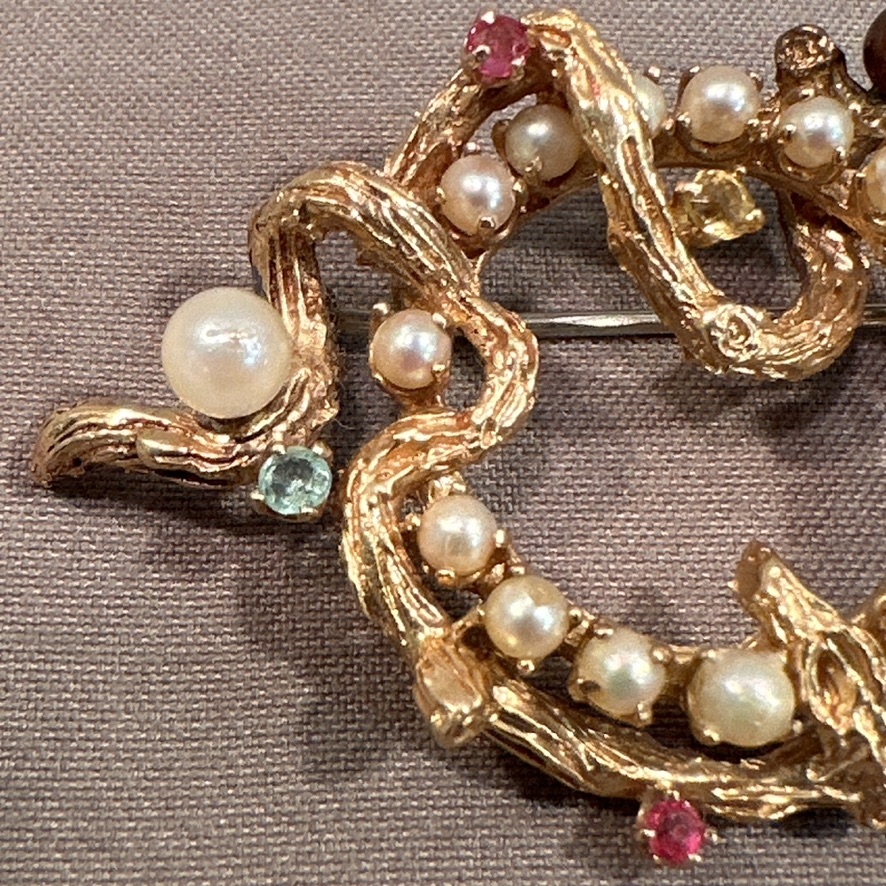 A circular shaped branch design with 19 pearls (1 bronze) and 5 precious stones (2 rubies, 1 citrine, 1 emerald, 1 sapphire). Stamped on the back 14k.