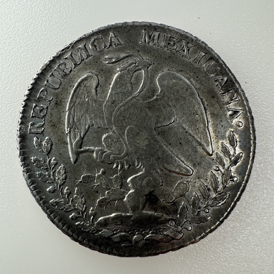 Marked 8 R.P. 1833. J.S.10Ds.20Gs. A collectible Mexican silver coin with nice detail.