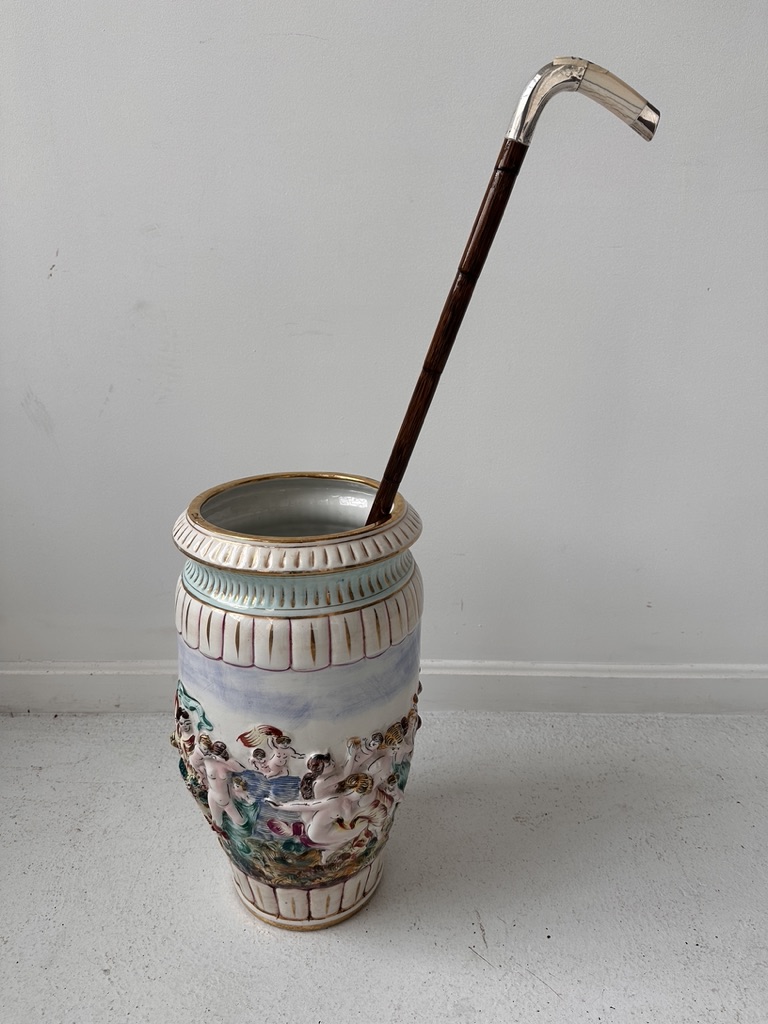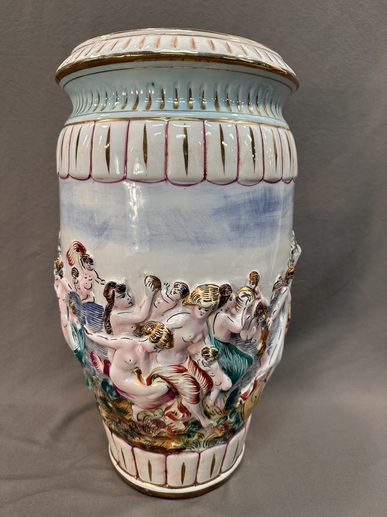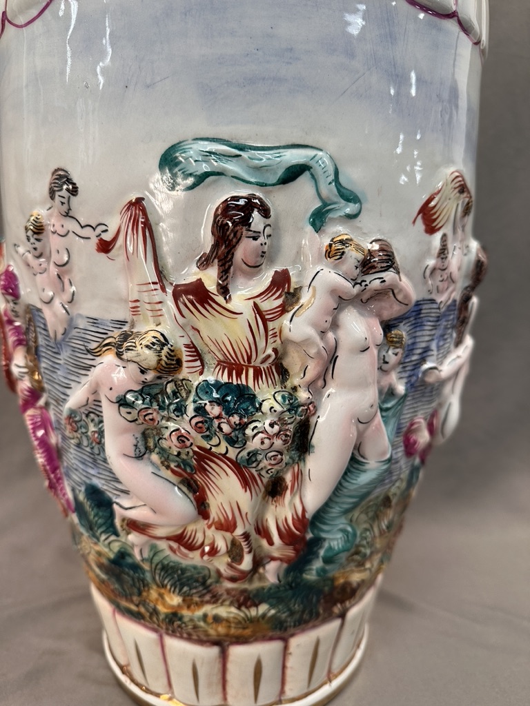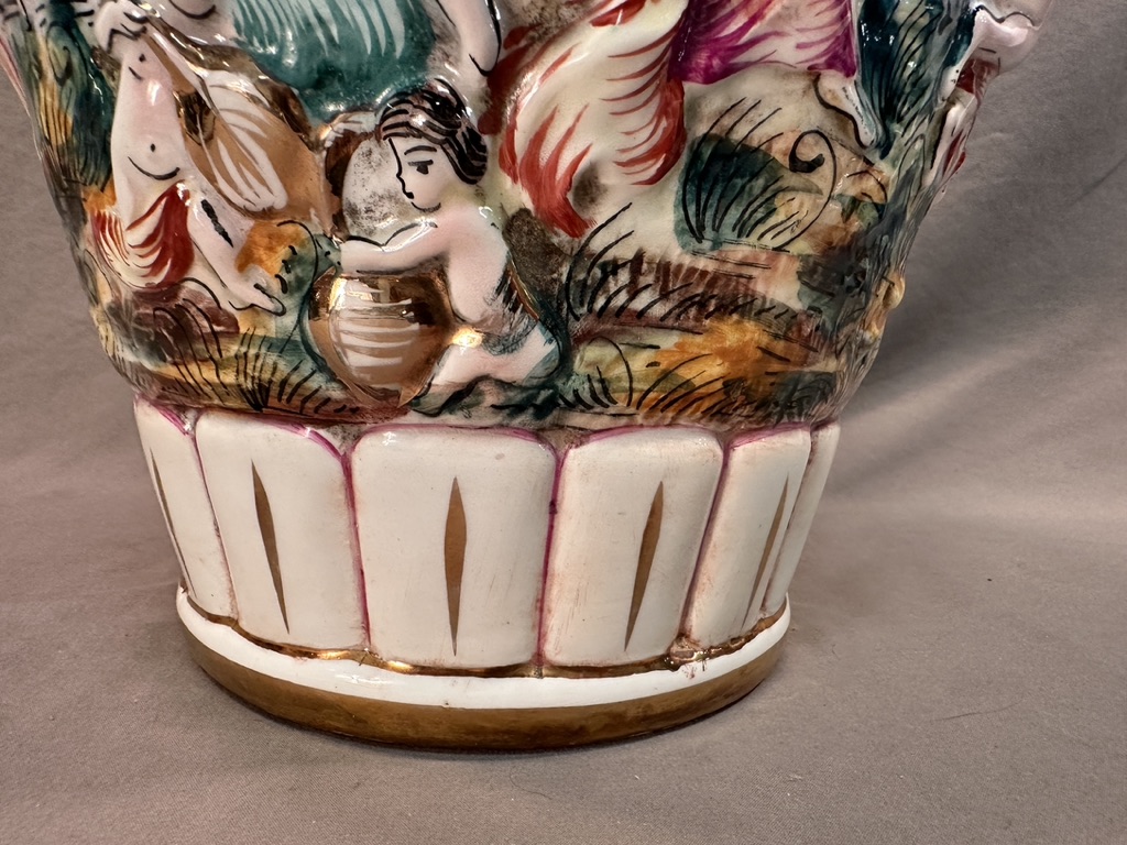 Featuring hand painted decoration and cherubs landscaping around the vase with accented decoration and gold trim. Signed on the bottom.