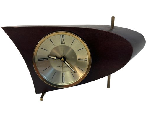 A 1960's vintage Westclox 707 electric alarm clock Decorative boomerang shaped solid mahogany case in an outstandingly different contemporary design. Rich, spun brass finish brass dial; luminous hands. Sweep second hand. Solid brass bezel and trim; shatterproof crystal,.