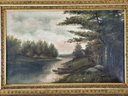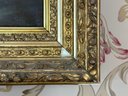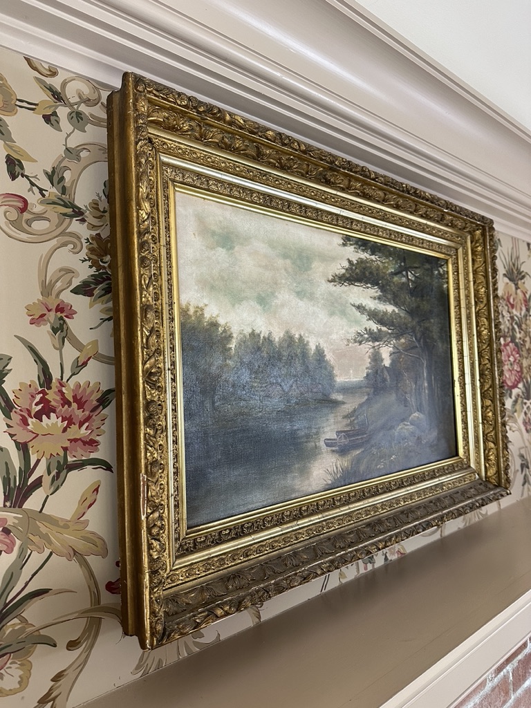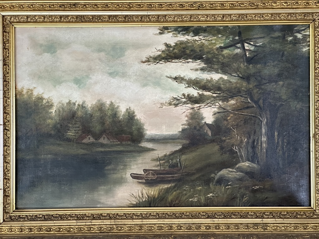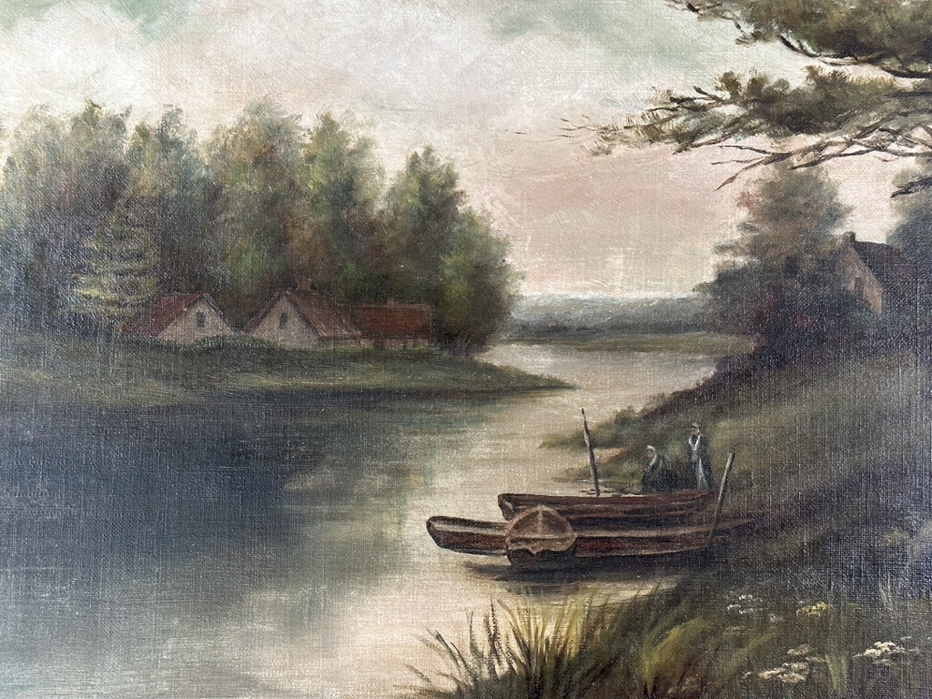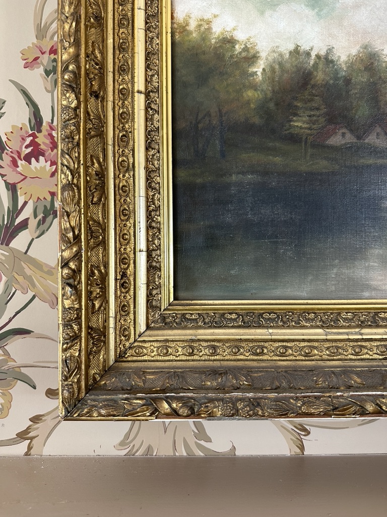 Depicting a riverside bucolic scene with figures and houses. An original gilt wood frame circa mid-1800s.