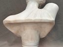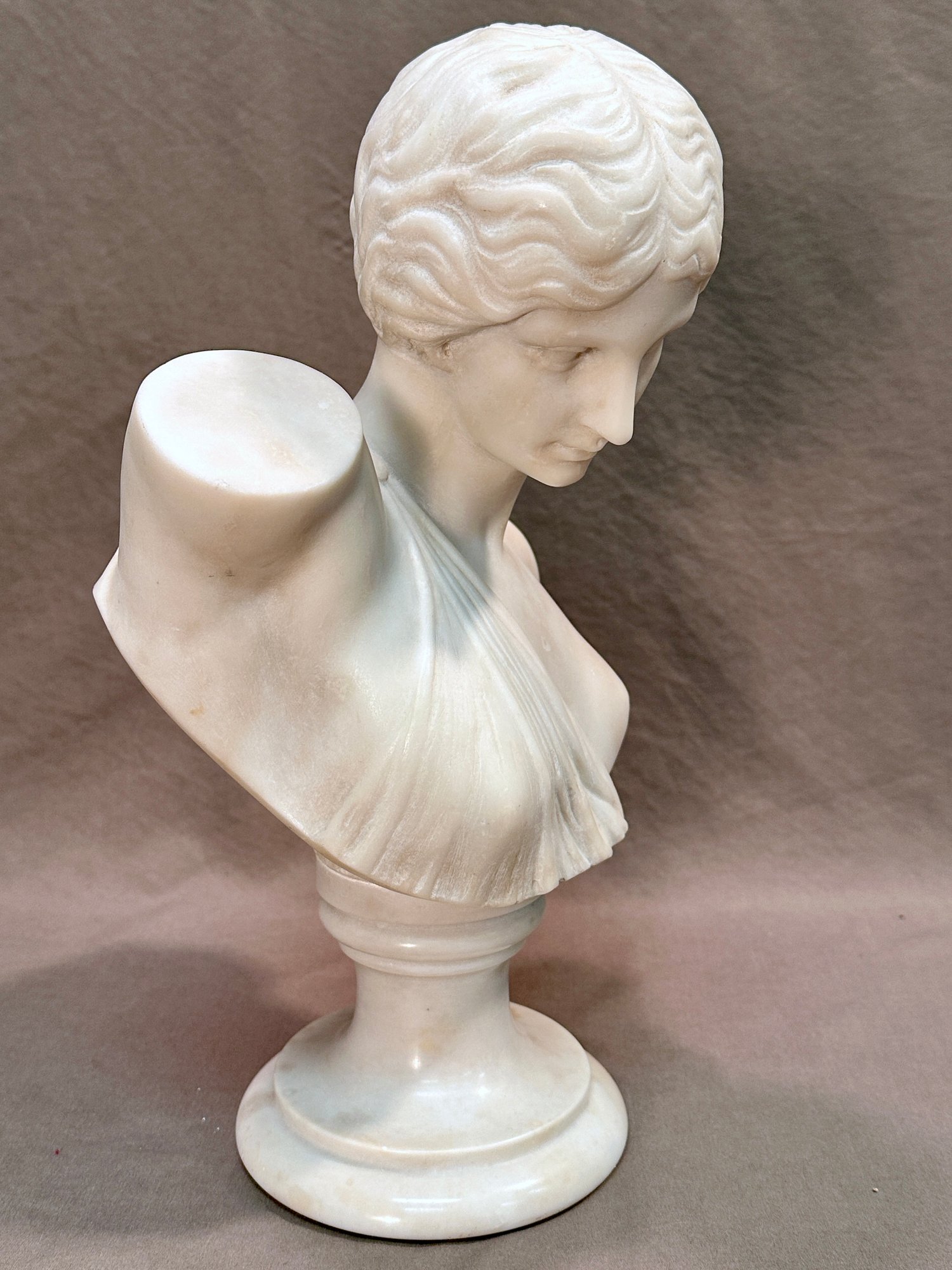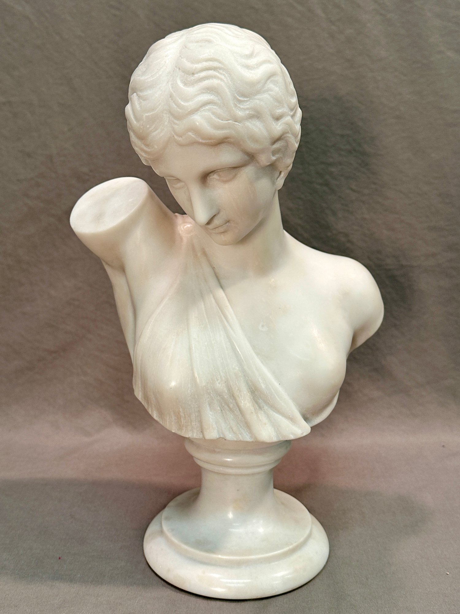 Elegant Carrara marble bust depicting Aphrodite or possibly Venus, gazing downward and wearing a tunic. Composed of two parts, set on a similar marble pedestal base.