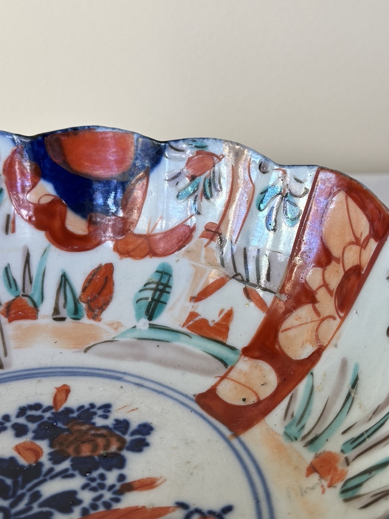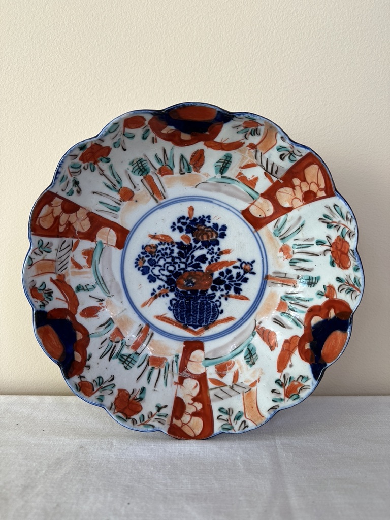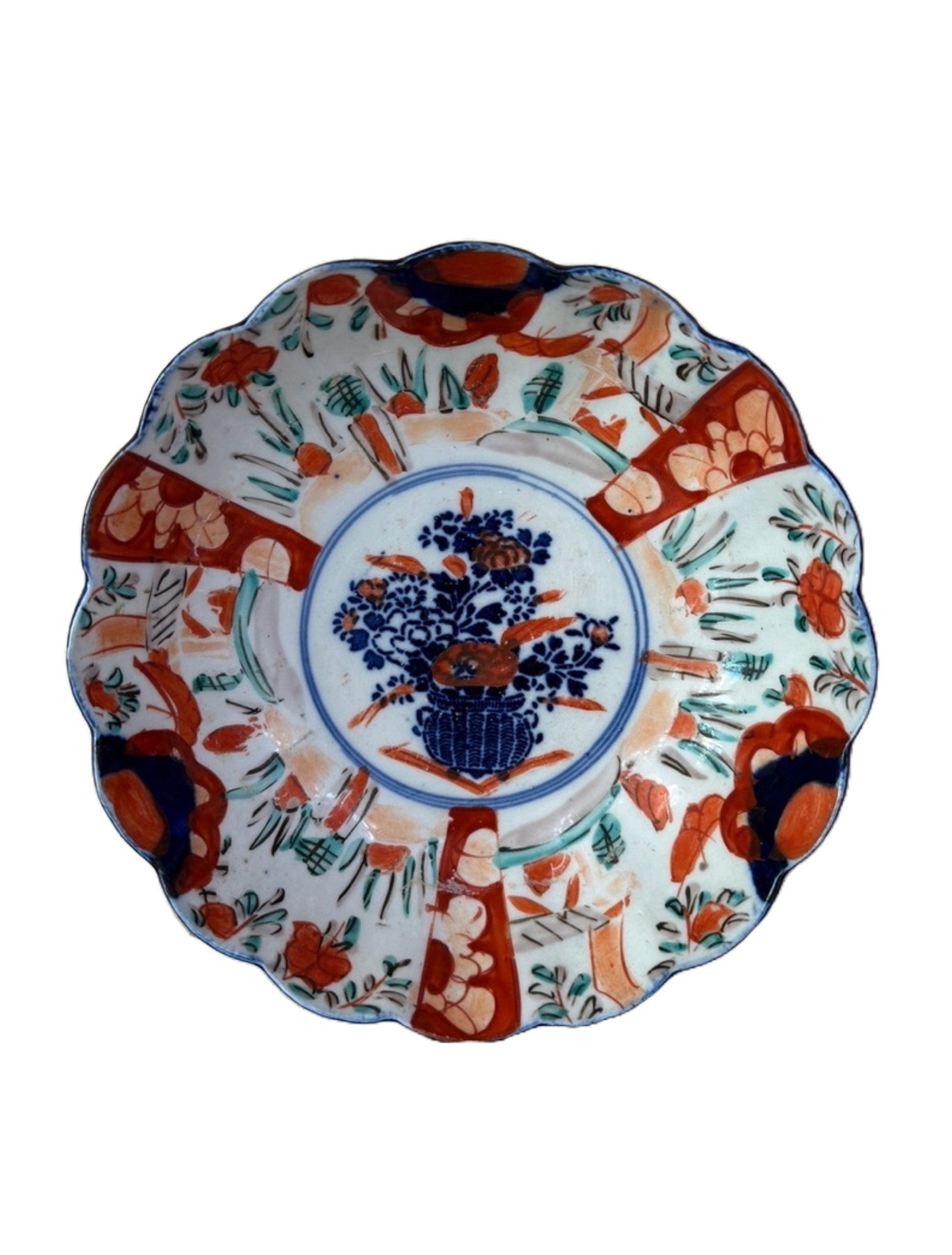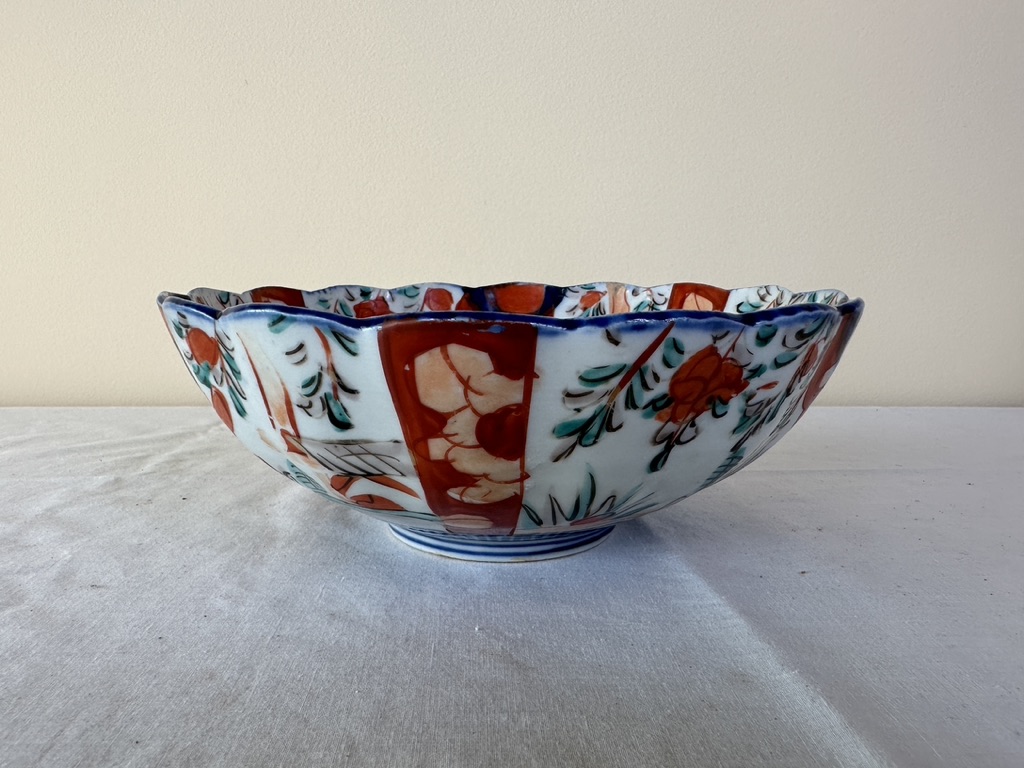A fine porcelain Japanese painted bowl decorated with blue basket floral center.