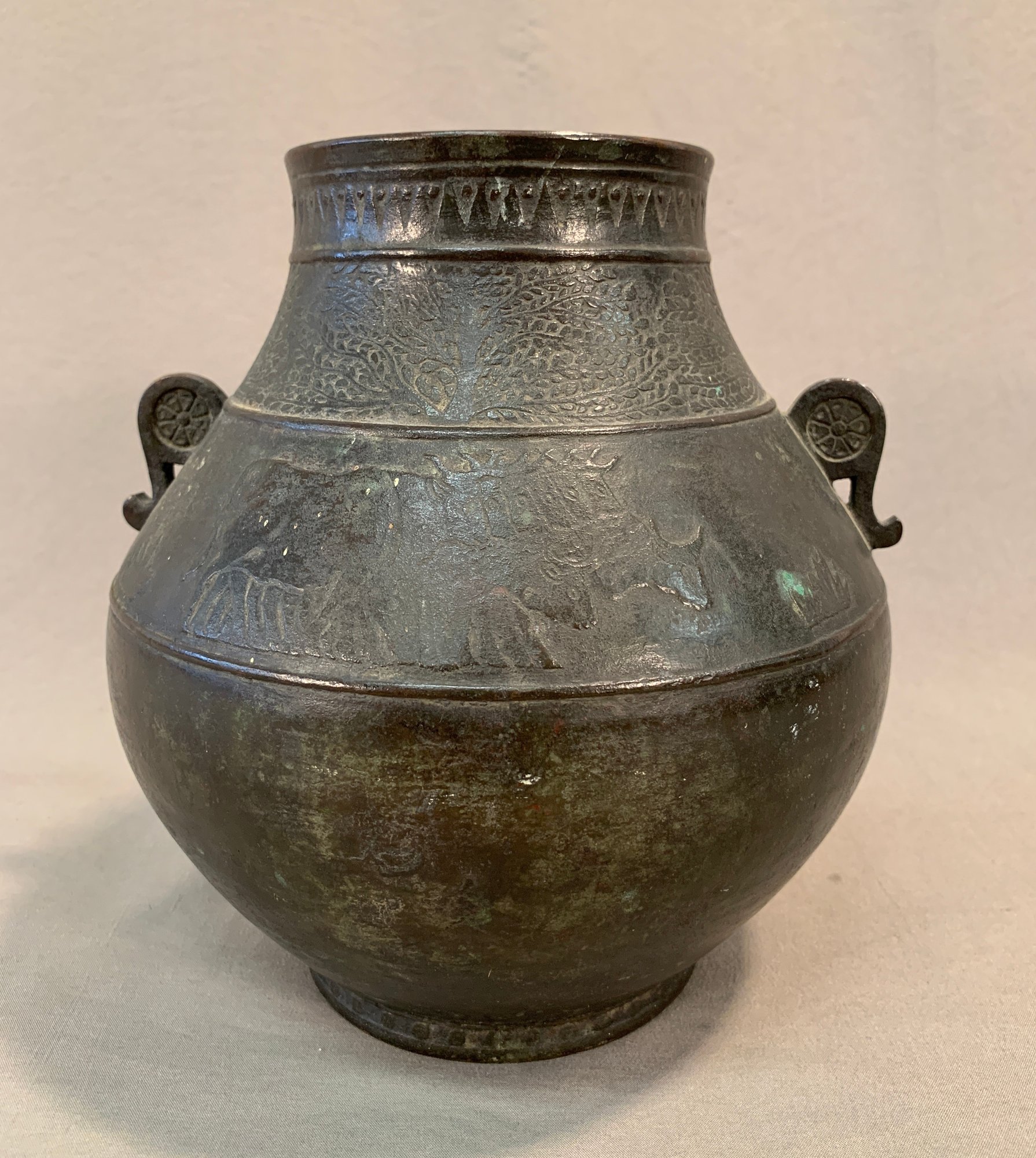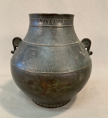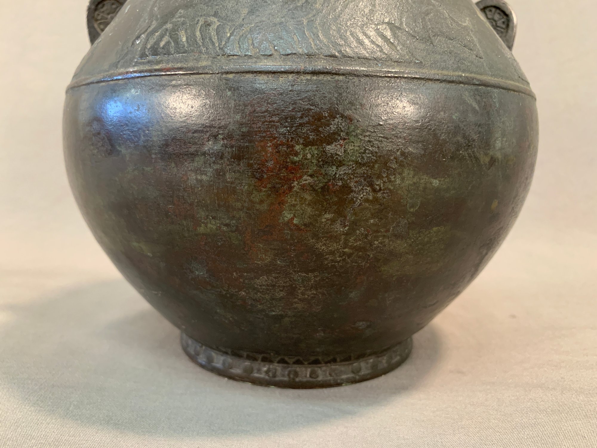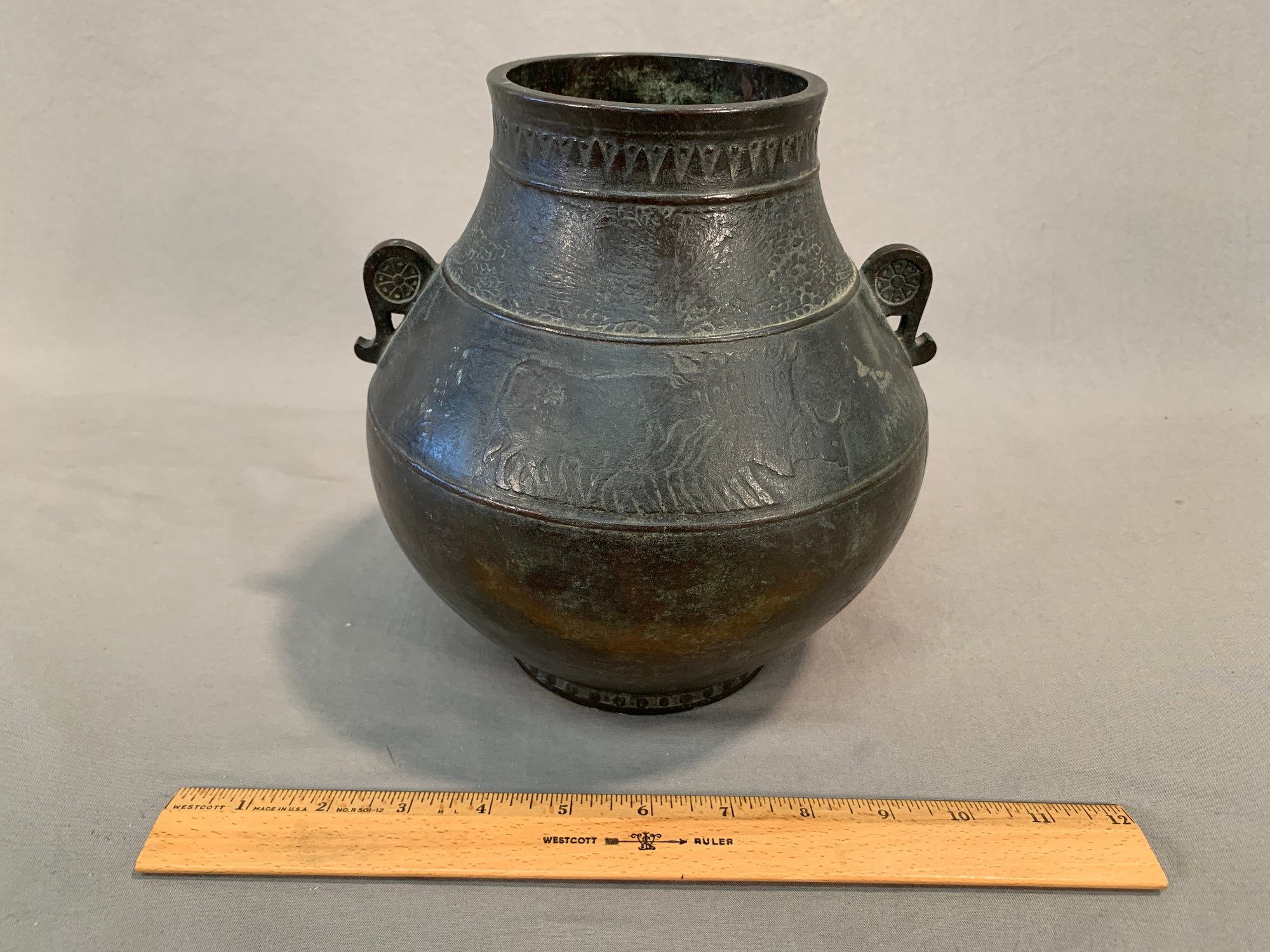 19th Century Japanese Meiji bronze two-handled wine vessel with traditional motifs of oxen and leafy trees and geometric design around the neck and on handles. Marked on bottom .