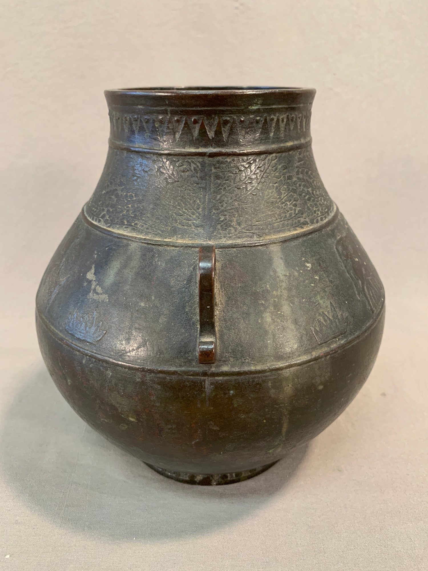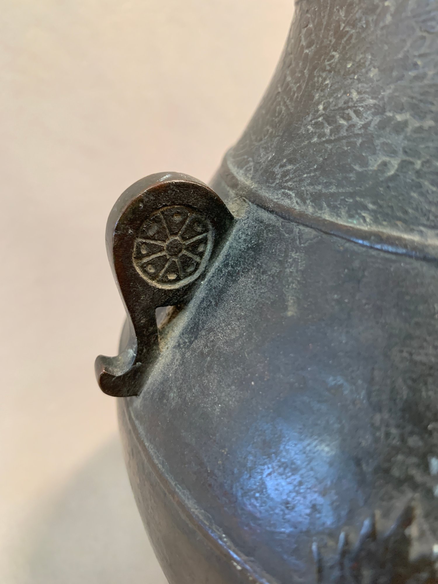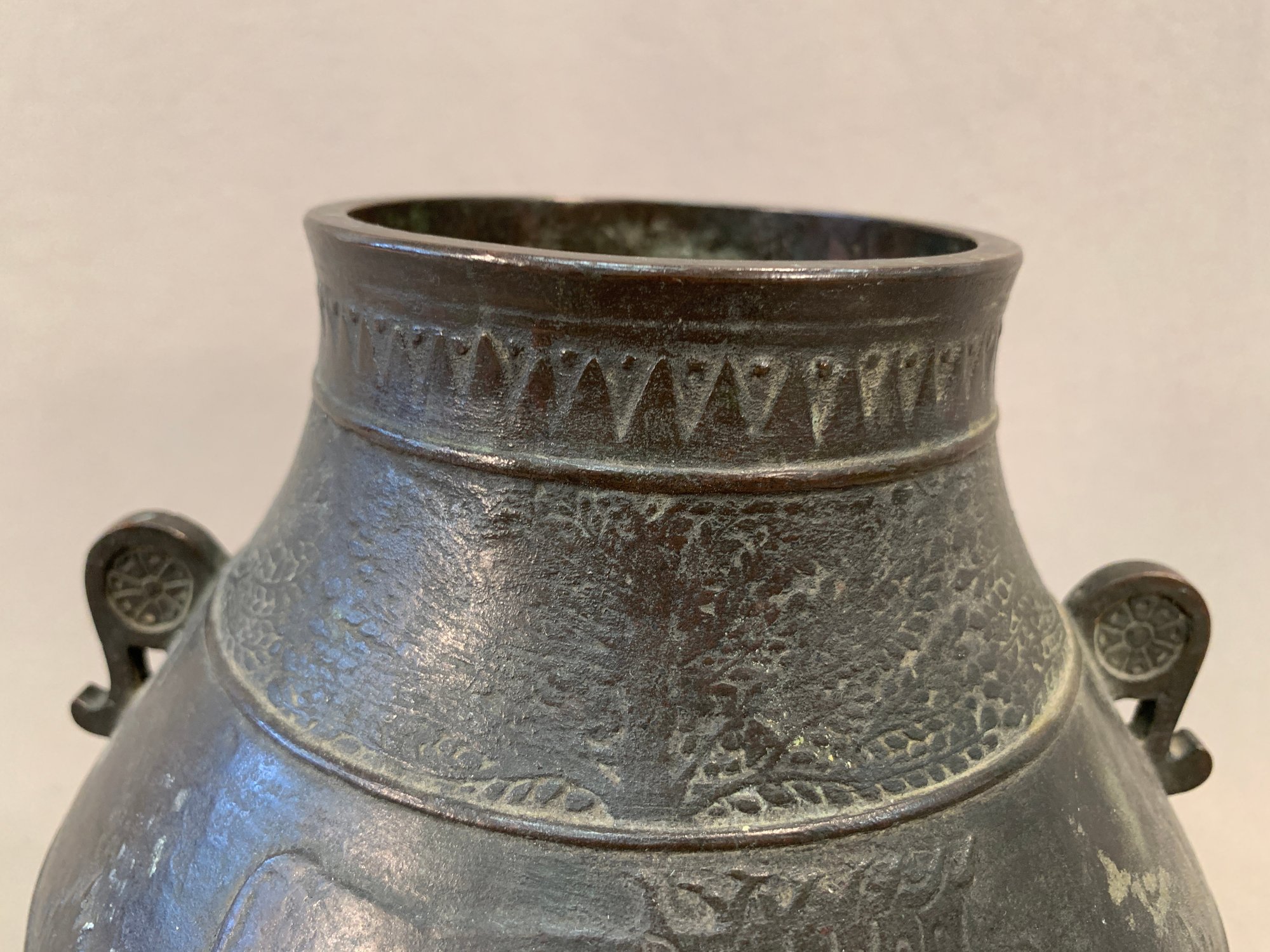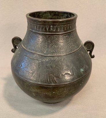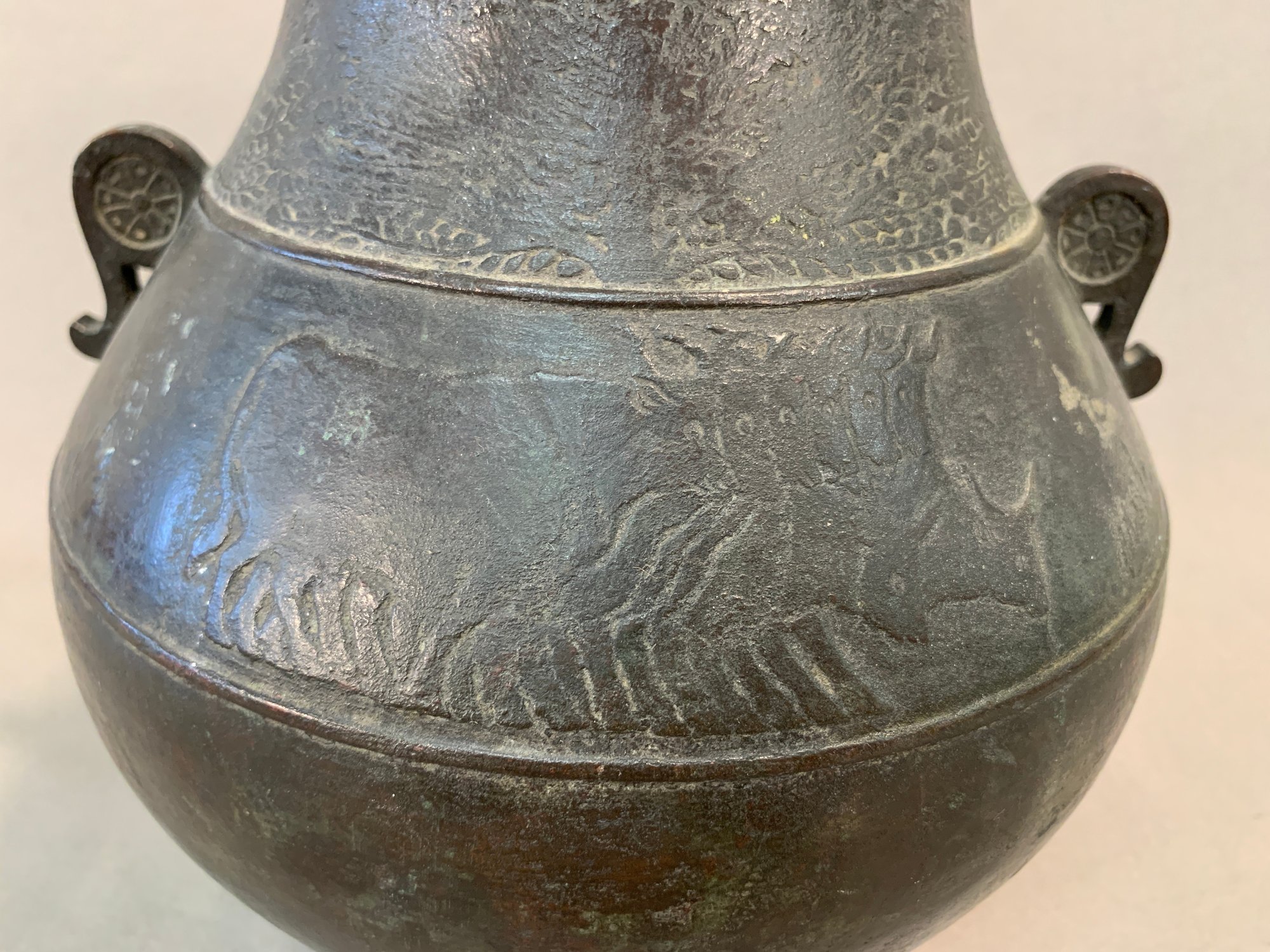 19th Century Japanese Meiji bronze two-handled wine vessel with traditional motifs of oxen and leafy trees and geometric design around the neck and on handles. Marked on bottom .