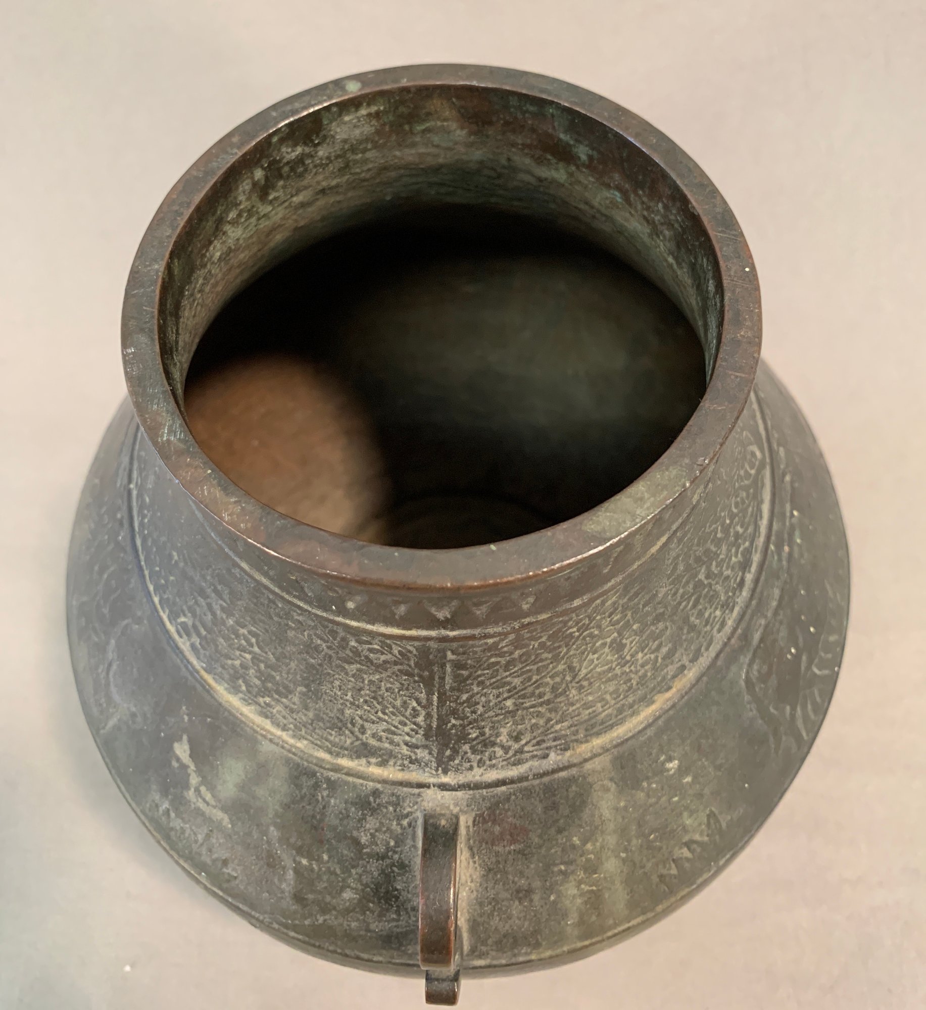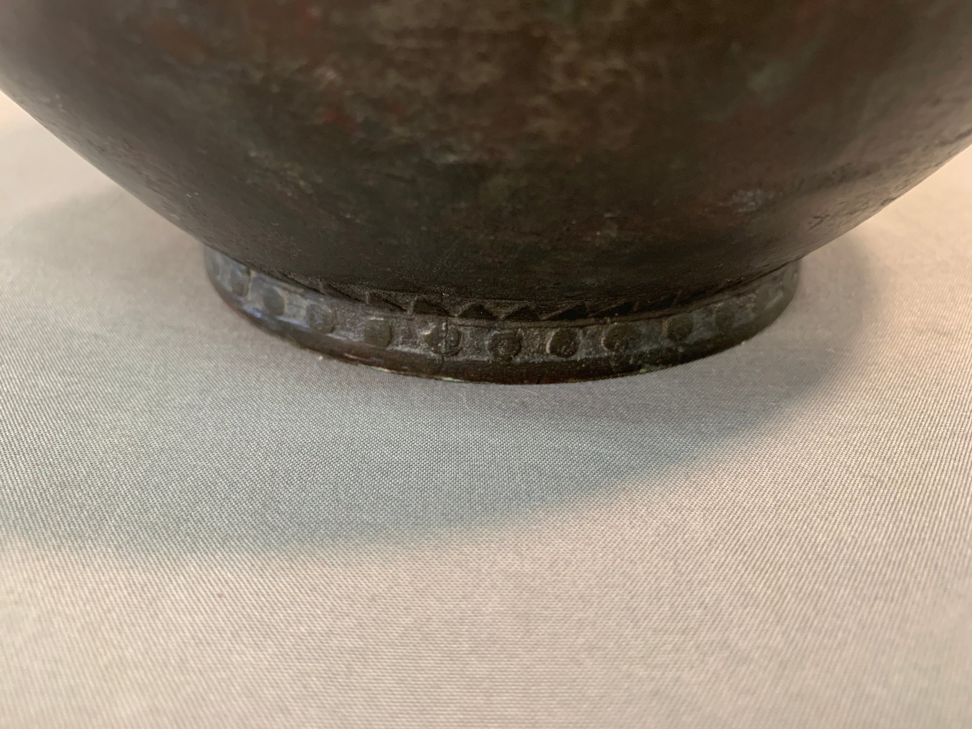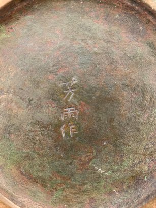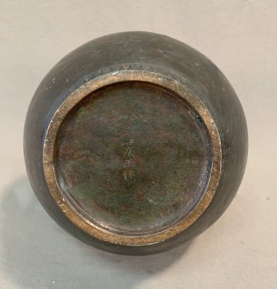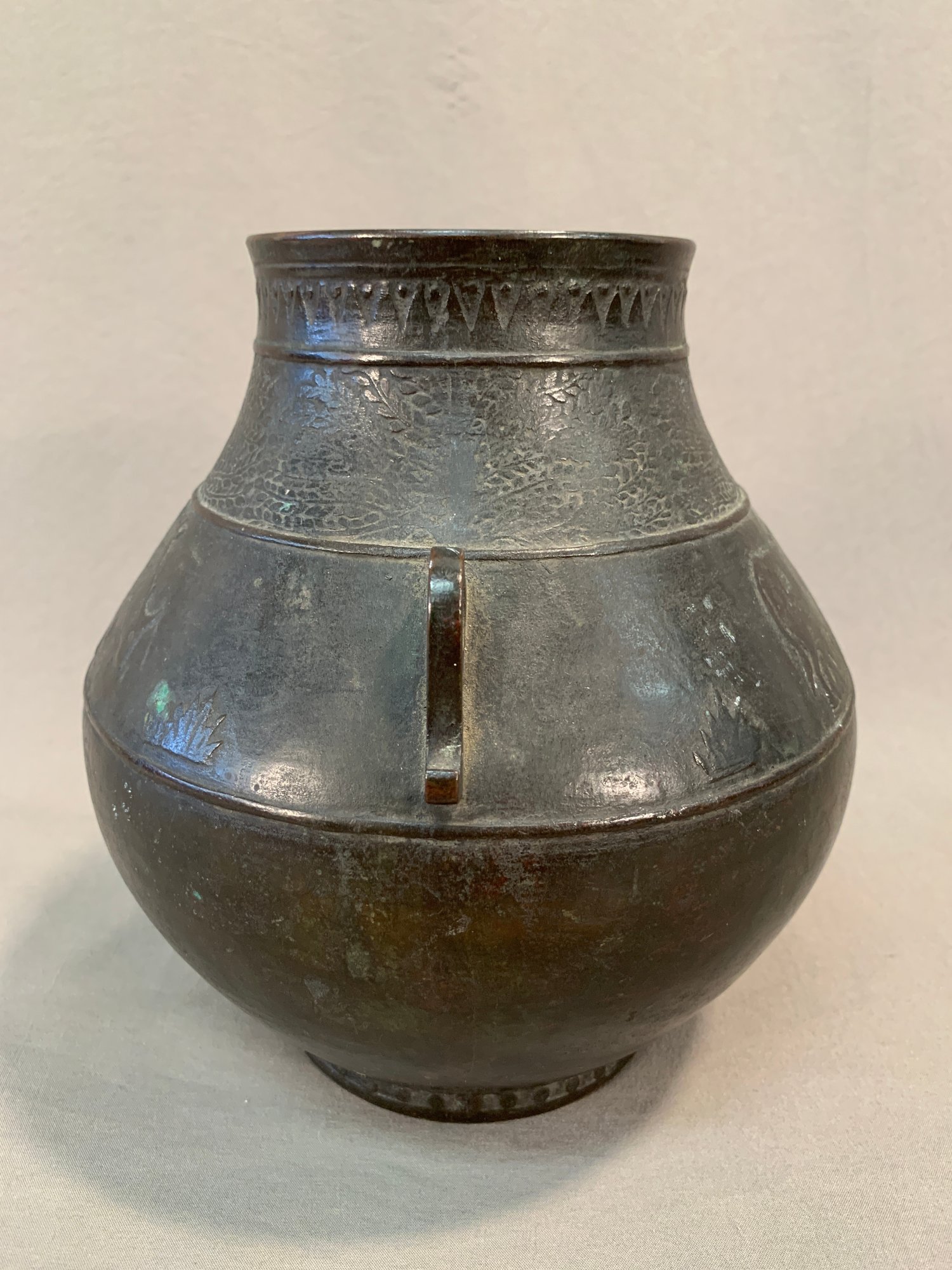 19th Century Japanese Meiji bronze two-handled wine vessel with traditional motifs of oxen and leafy trees and geometric design around the neck and on handles. Marked on bottom .