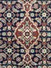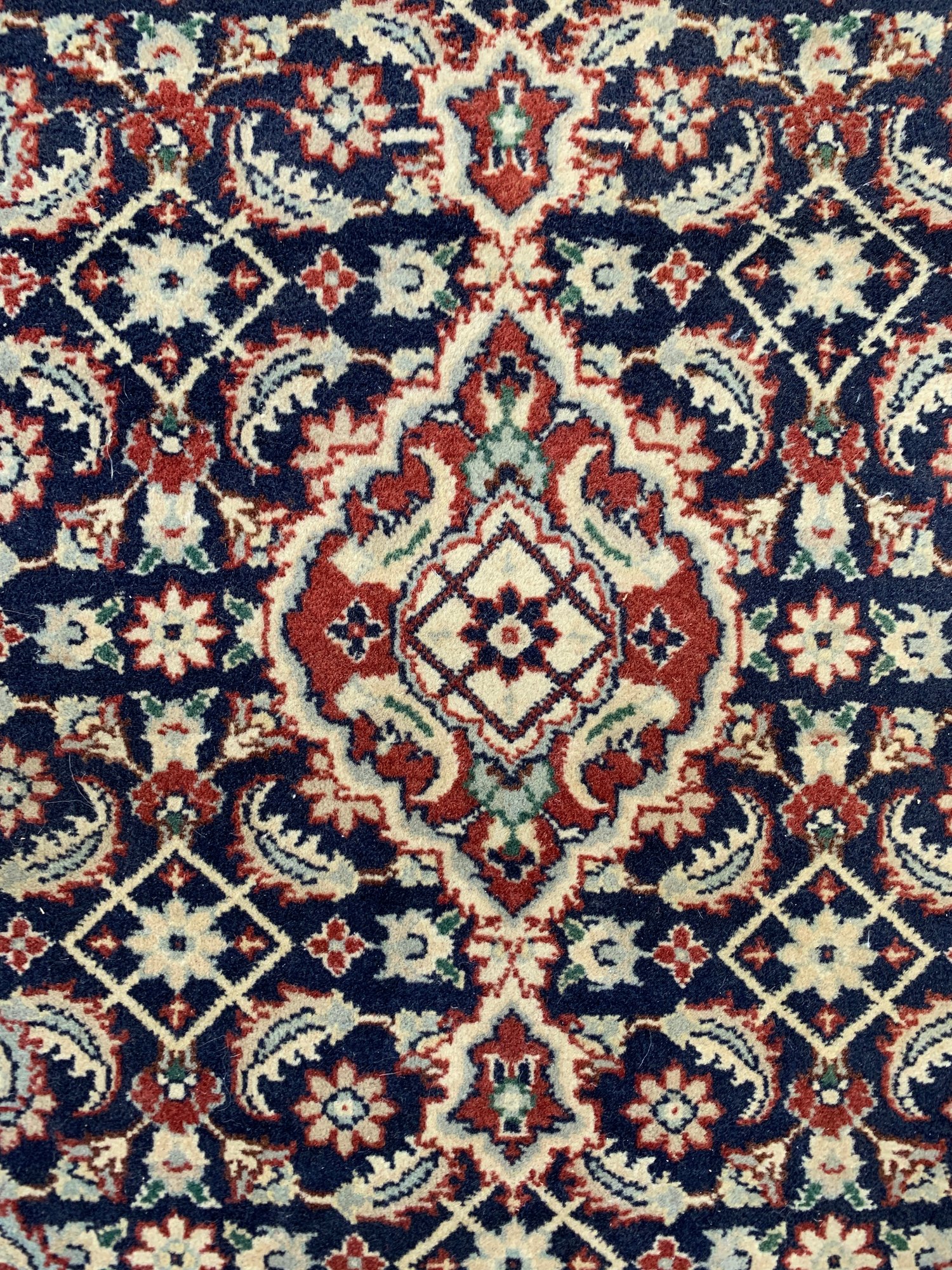 With dark blue, ivory, rust and pale blue colors.
