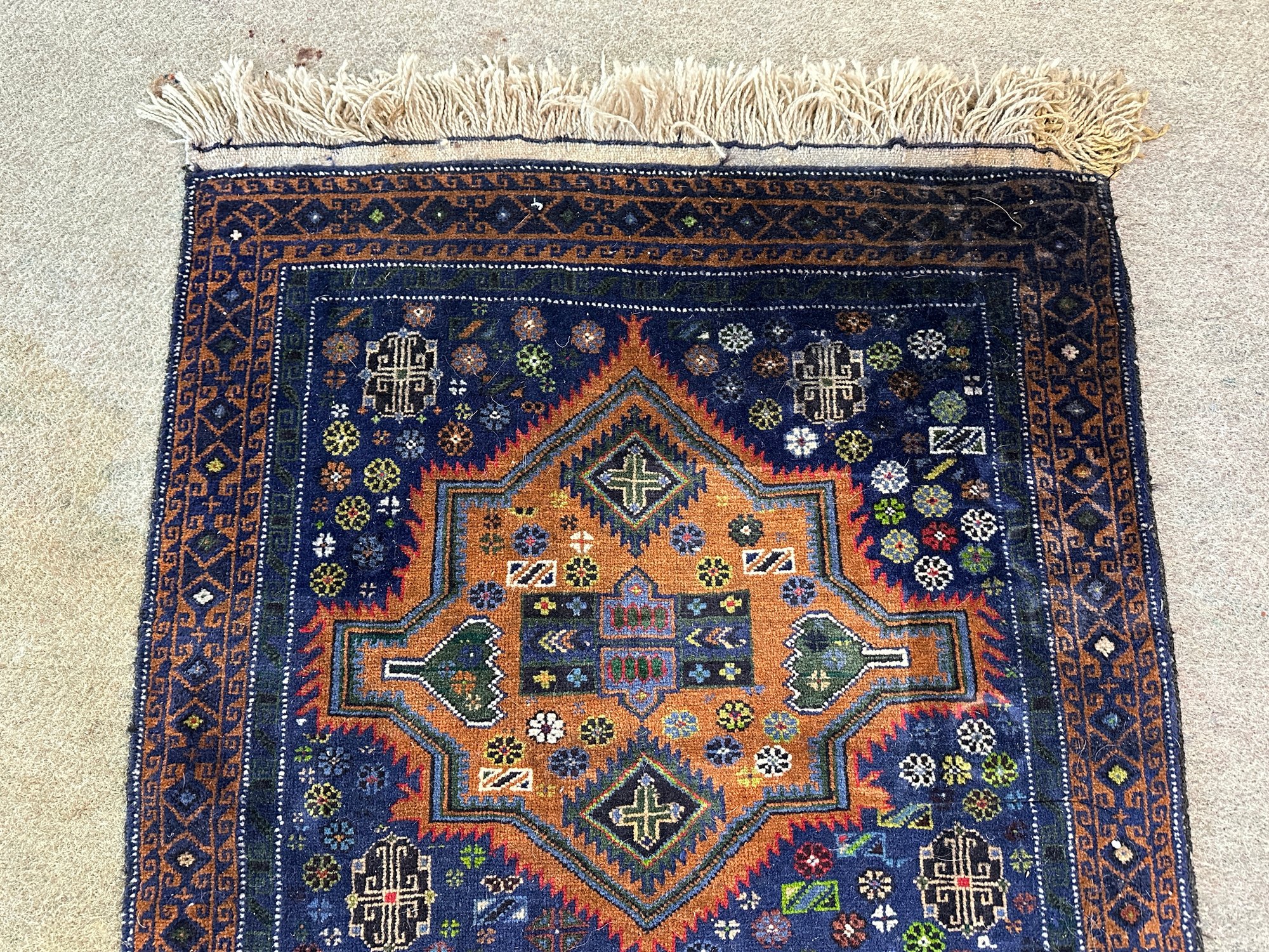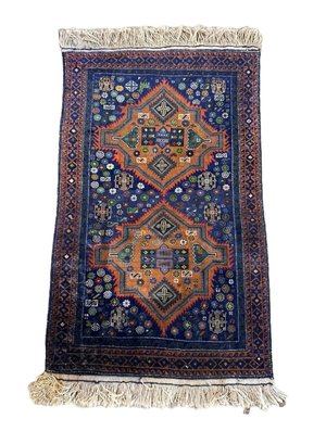 A caucasian rug with double medallion center on a blue background complemented by hues of oranges, greens and reds.