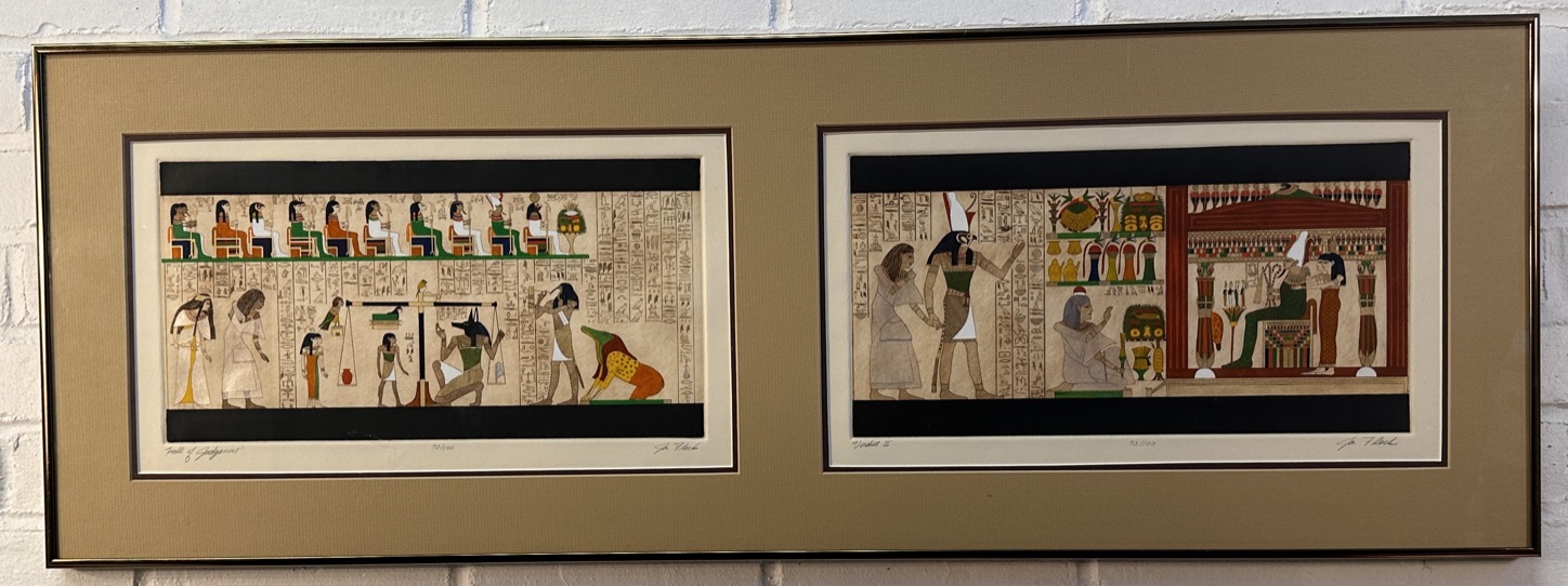 Dual framed and matted Egyptian style tomb drawings titled "Verdict II" and "Hall of Judgement". Each piece is titled, numbered 90/100, and signed in pencil on the bottom.