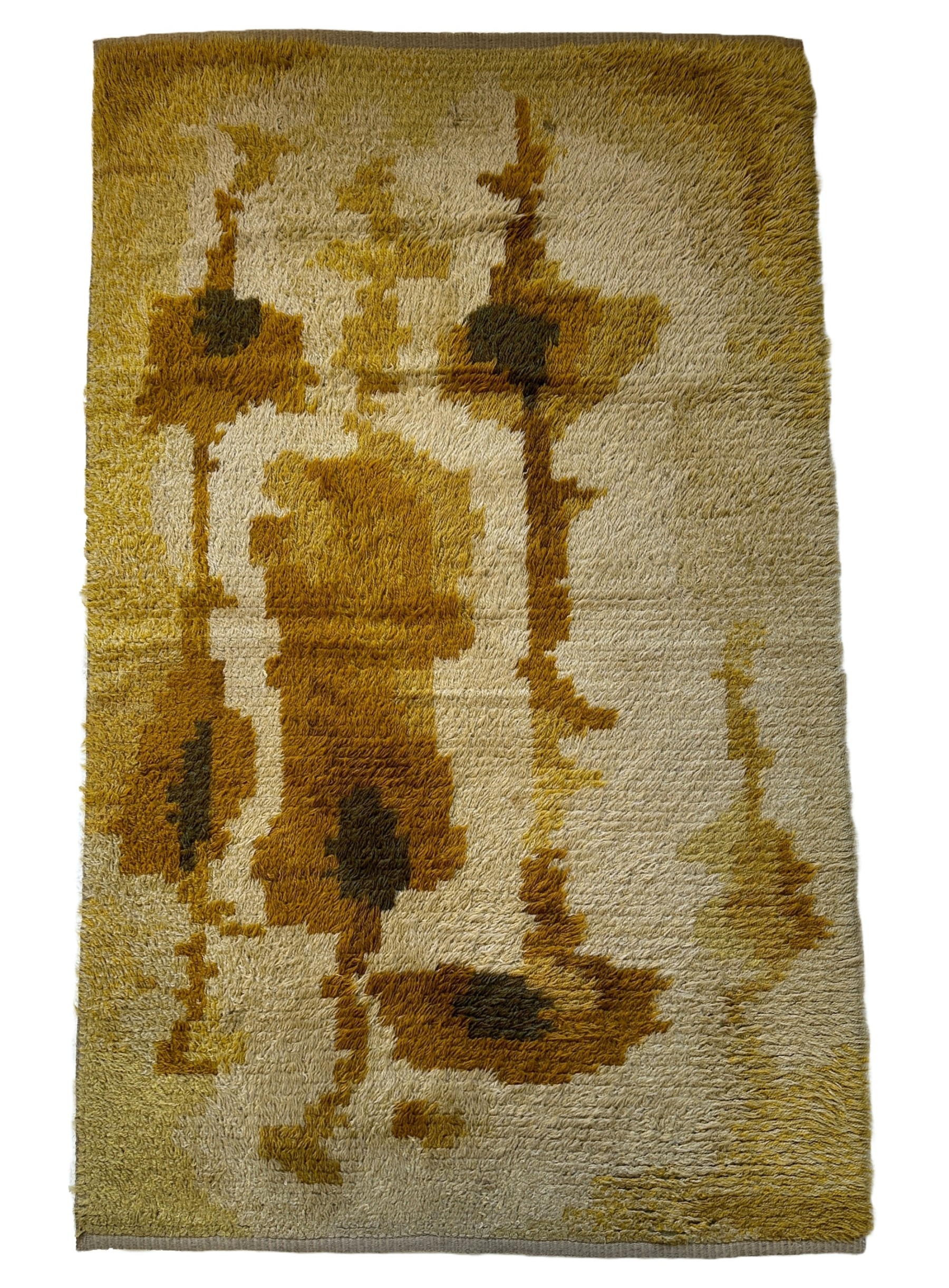 A Moroccan berber carpet with an abstract field motif in cream, blacks and splashes of color.