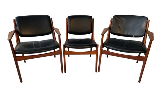 Set of 3 mid century Danish modern teak chairs including 2 arm chairs and 1 side chair. Designed by Arne Vodder for Vamo Soonderburg. Constructed with sculpted teak body, leather upholstery and a unique fully tilting backrest.