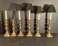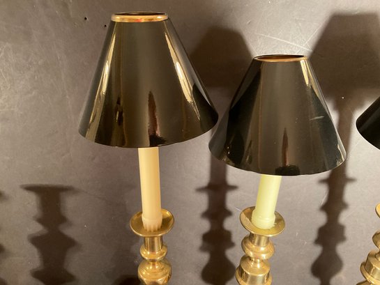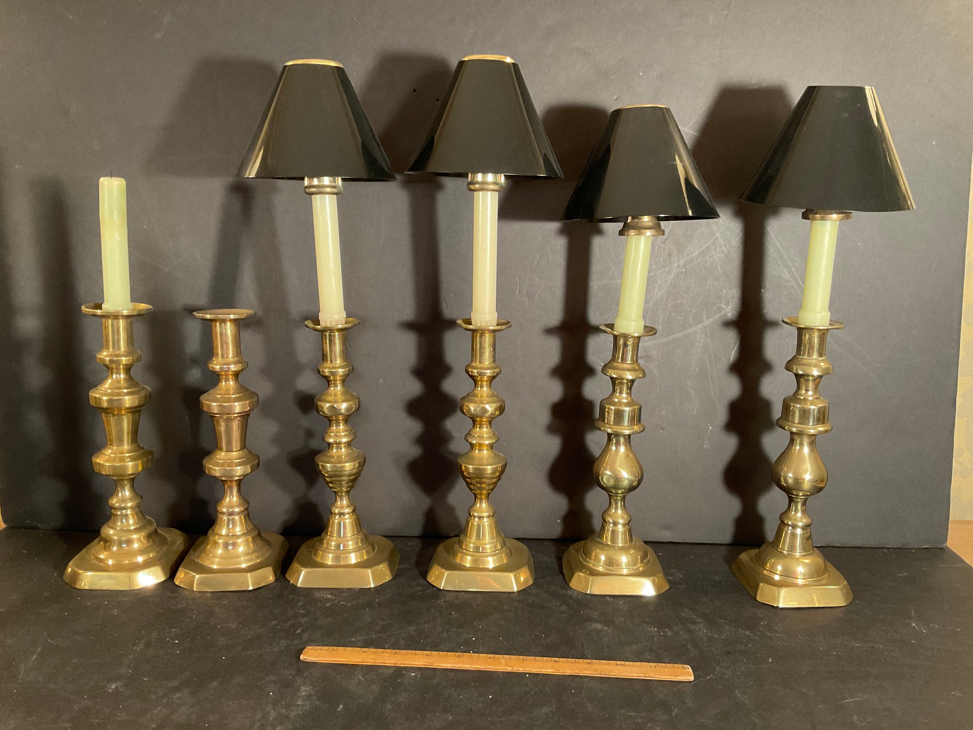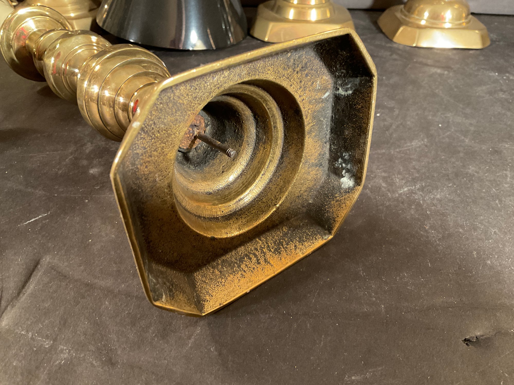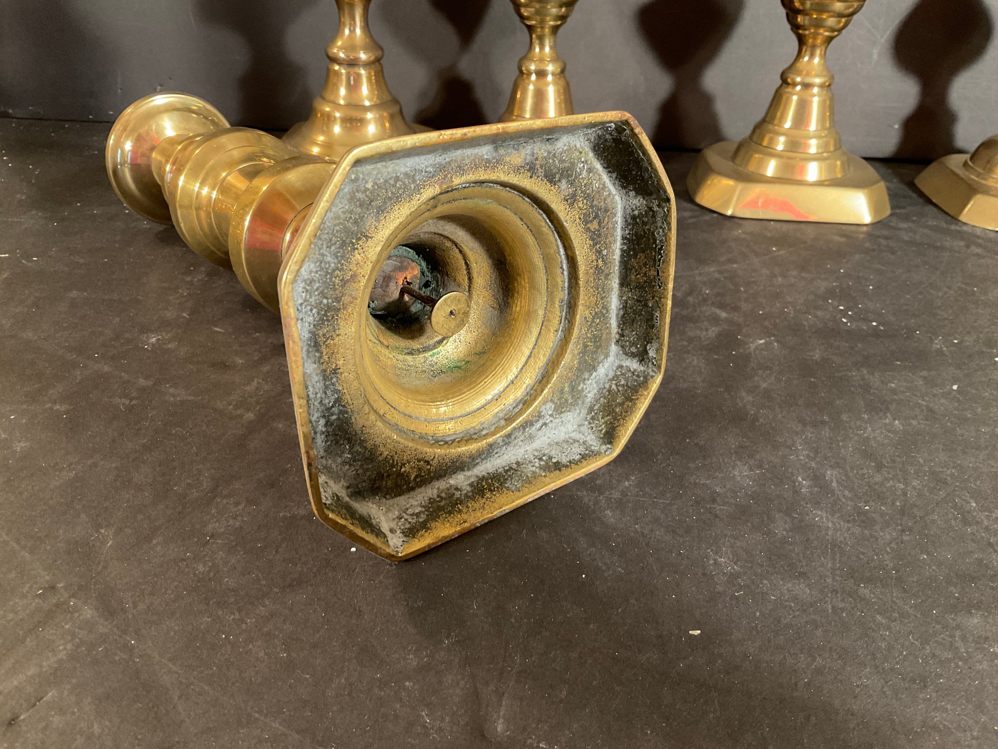 All three pair are antique and are push-up candlesticks solid brass from the mid 19th century.