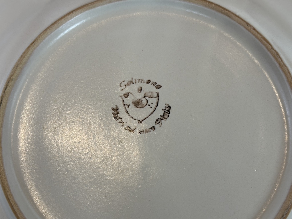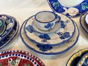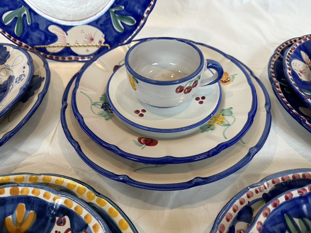 Beautiful, hand-made and paint-decorated ceramics from Italy. Including (7) 4 pc. place settings in various patterns, and a round platter (13.5" diameter).