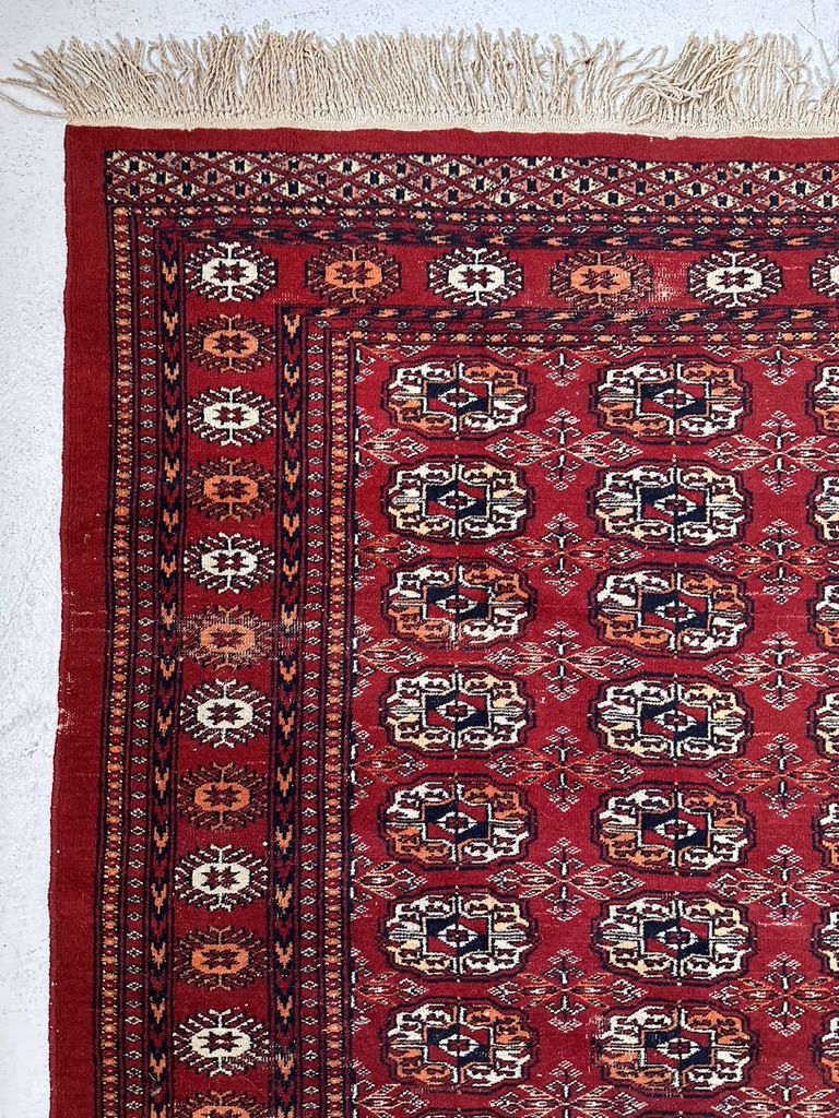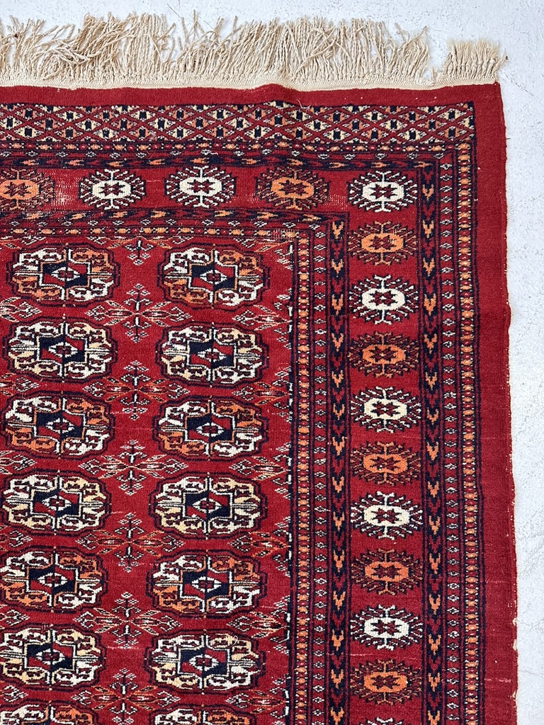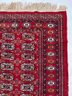 A authentic Bokhara hand knotted wool rug with a red field accented by beige, white and orange decoration.