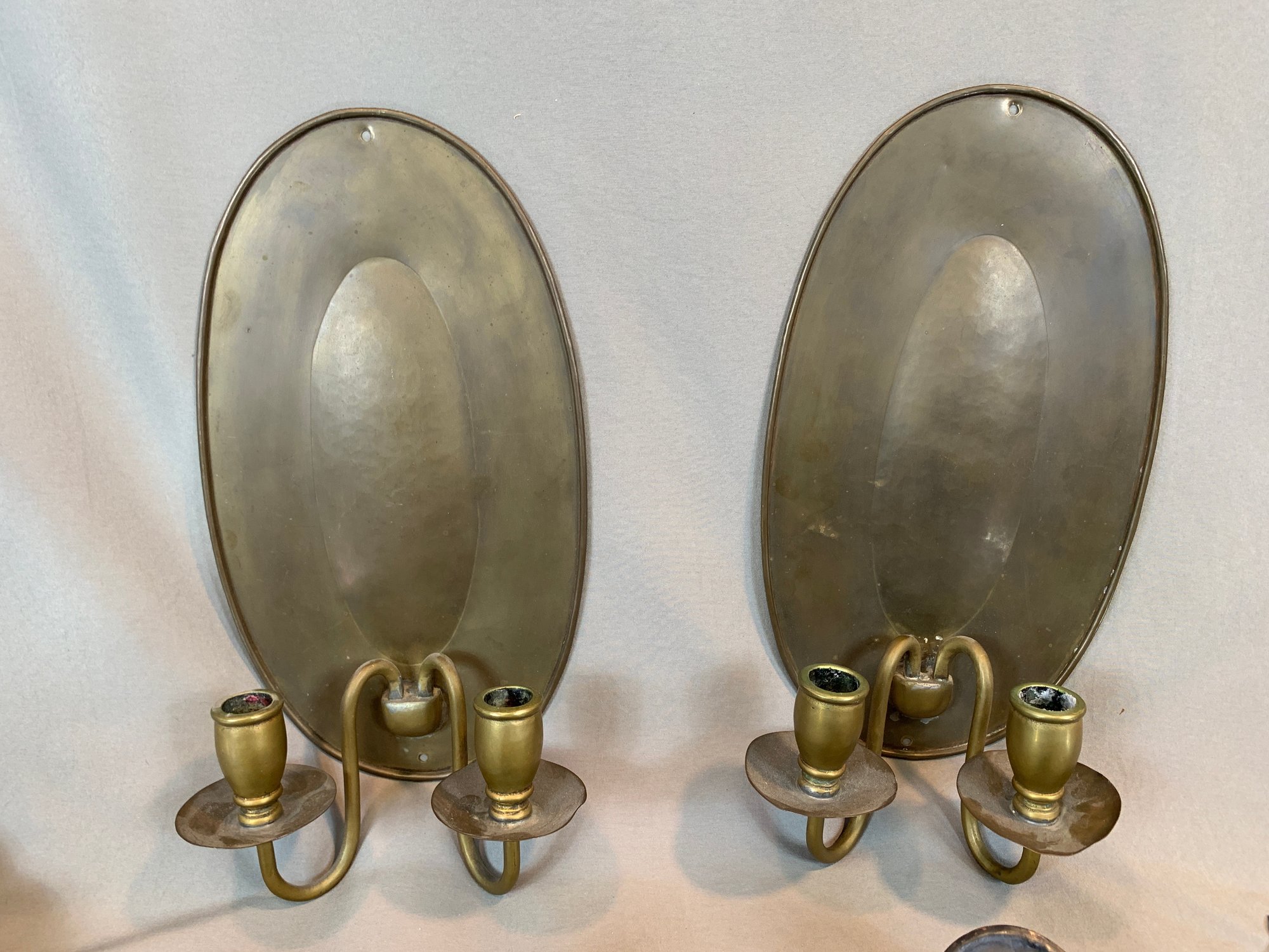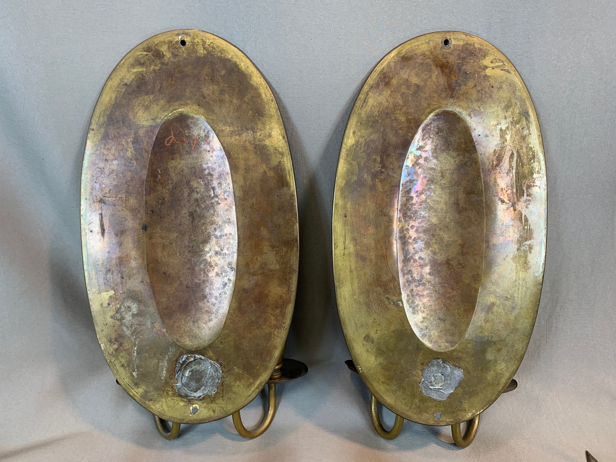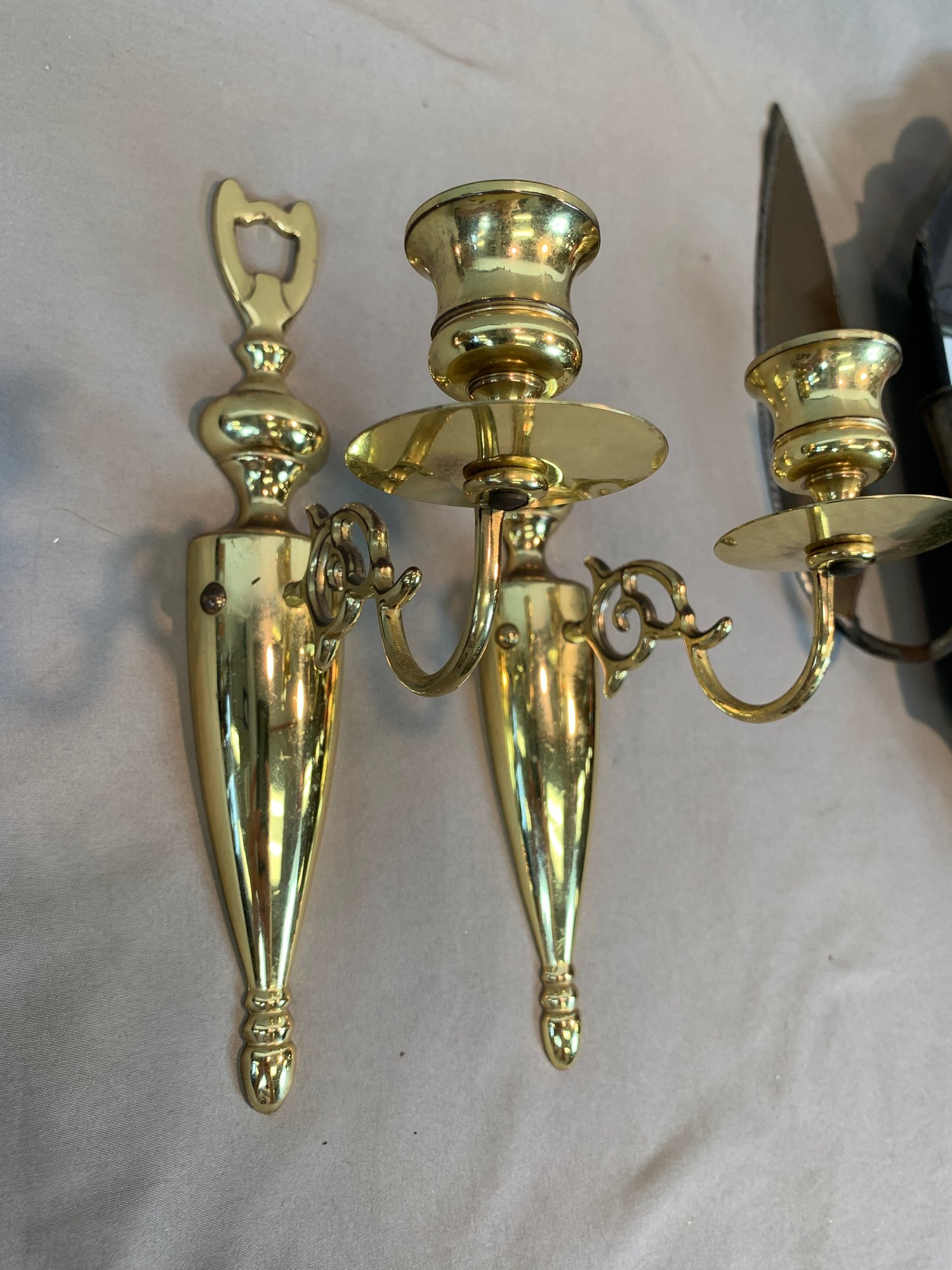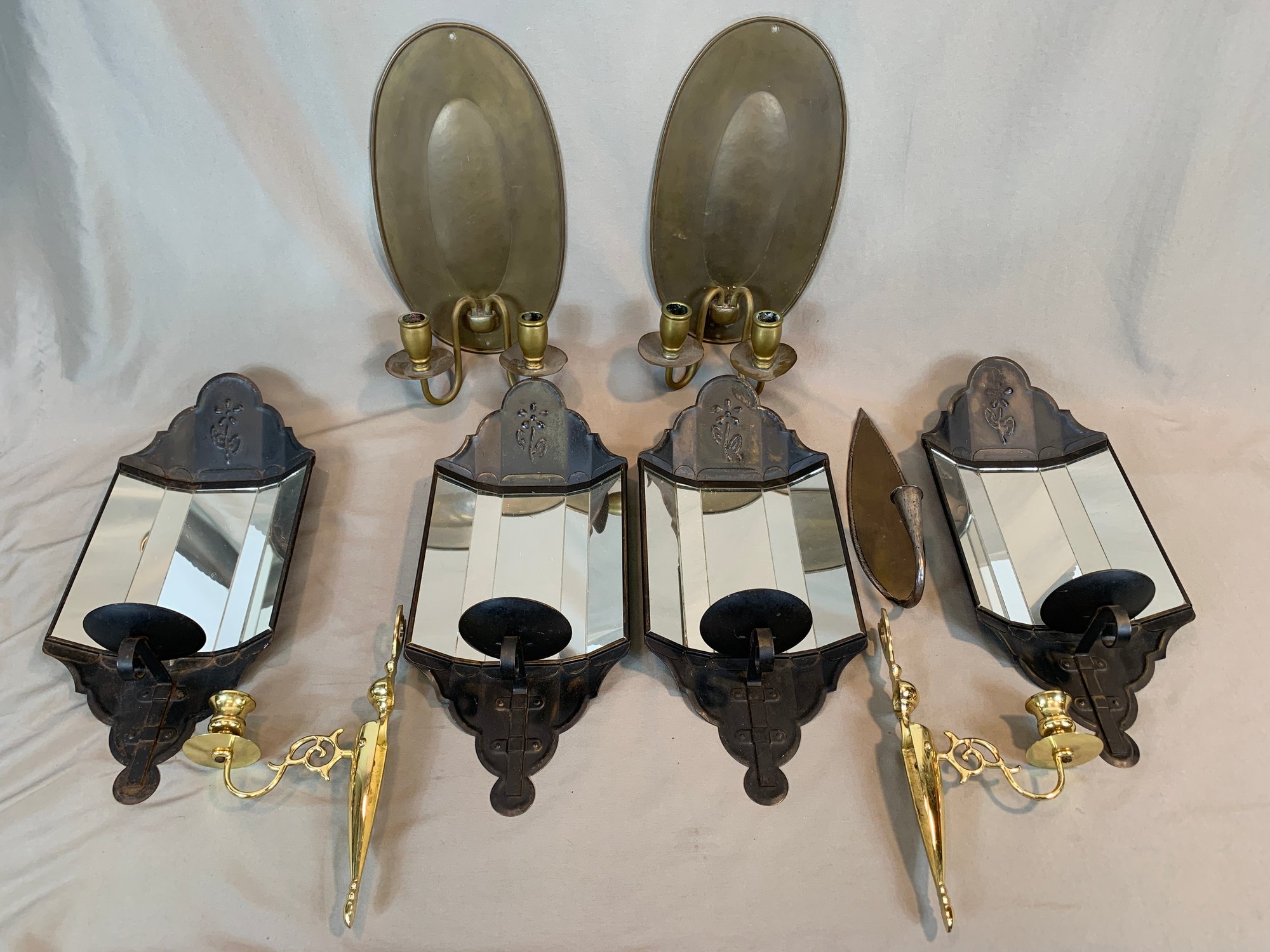 Including a pair of Federal style brass candle wall sconces, a pair of antique oval back double armed brass sconces, 2 pairs of painted metal and mirror glass sconces, and 1 single leaf form sconce. 9 pieces in total.