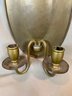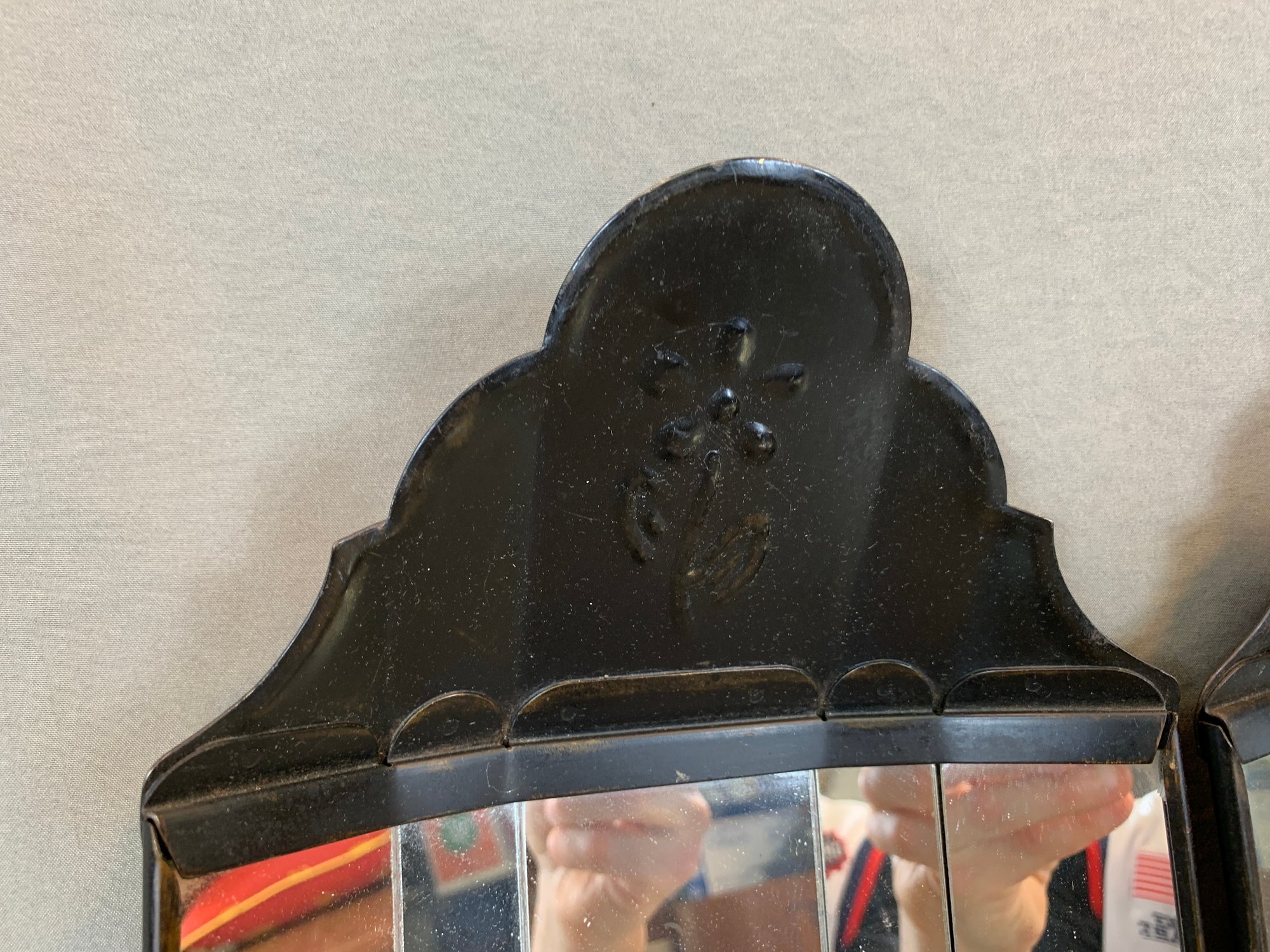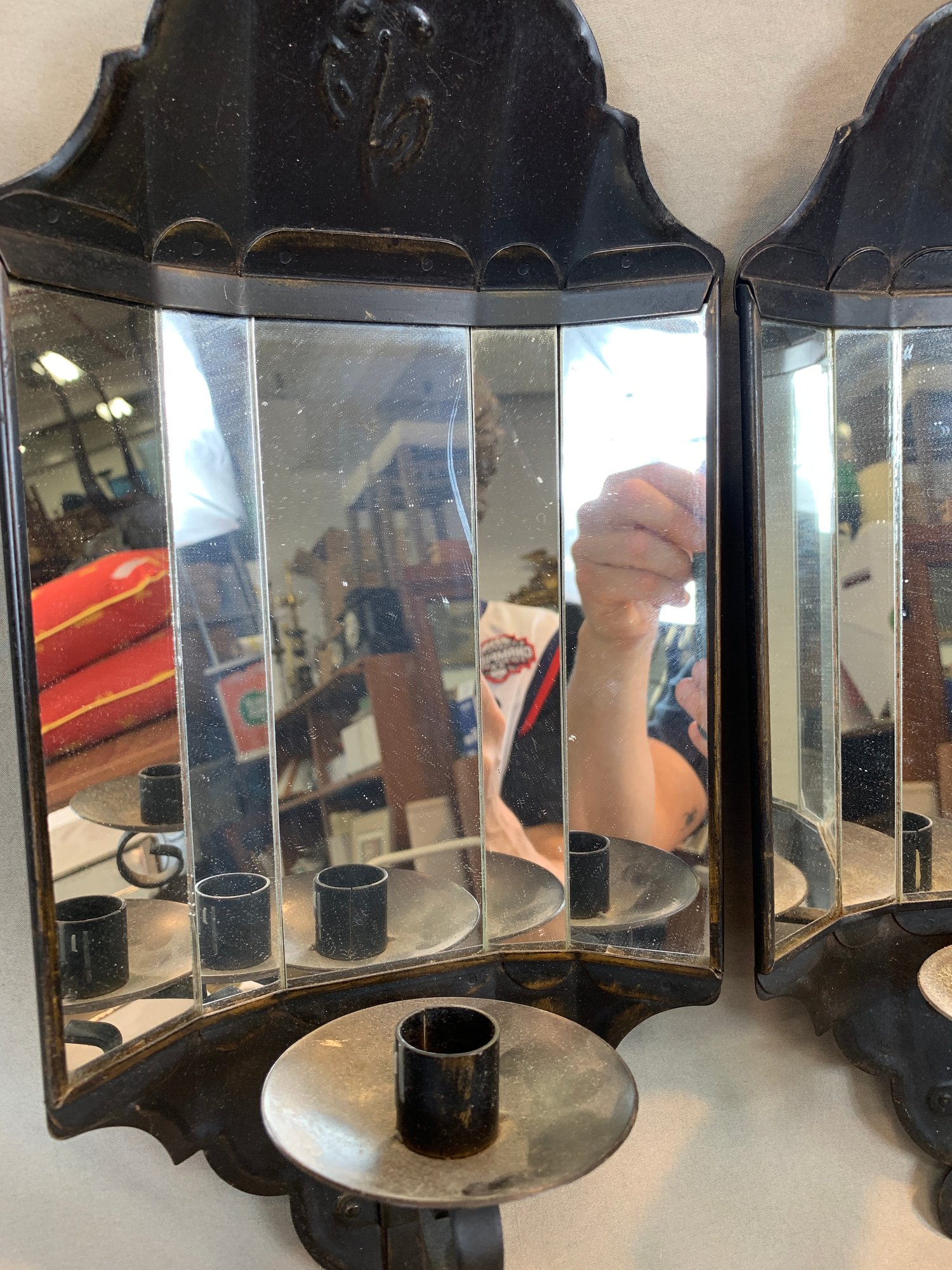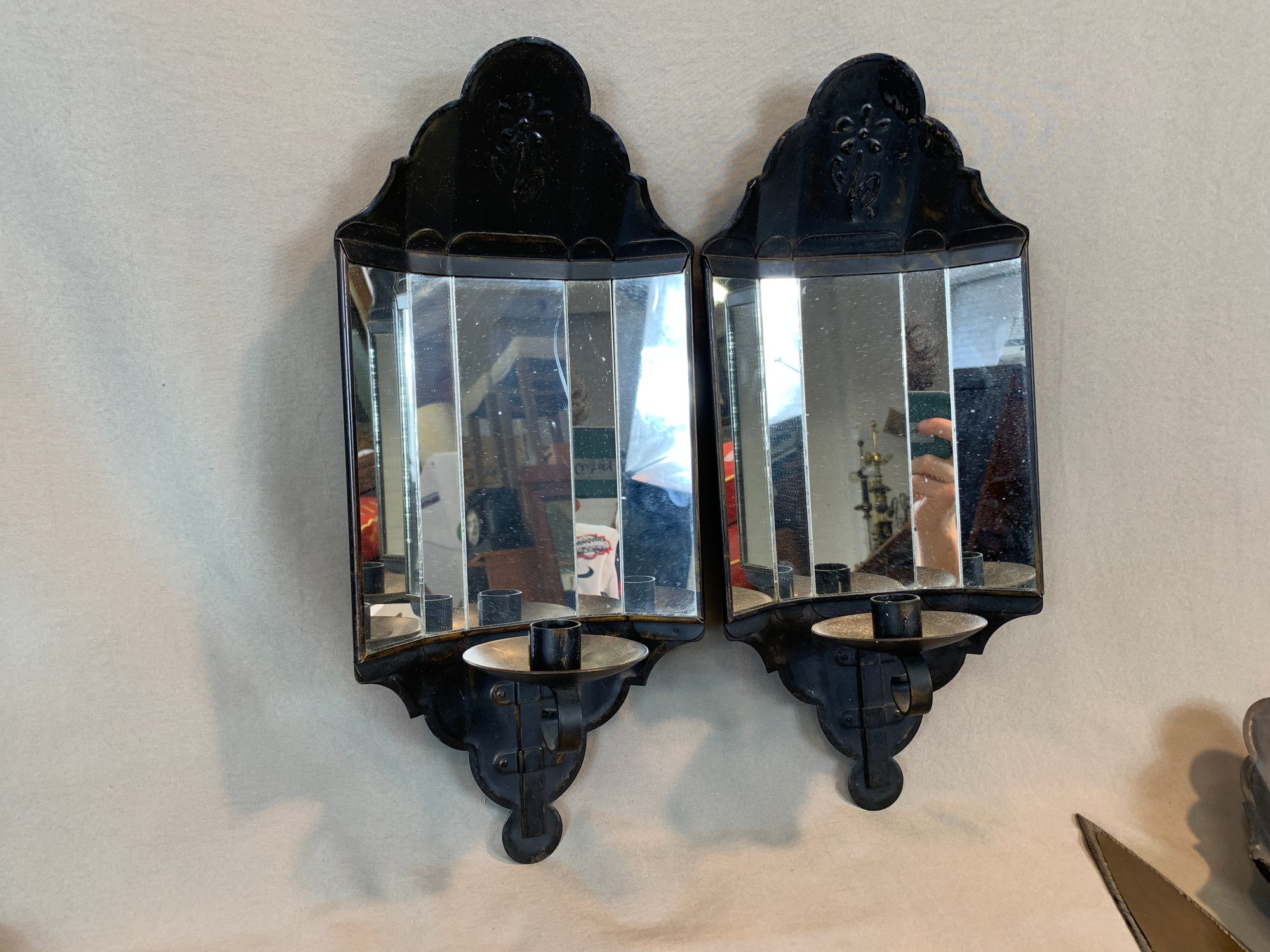 Including a pair of Federal style brass candle wall sconces, a pair of antique oval back double armed brass sconces, 2 pairs of painted metal and mirror glass sconces, and 1 single leaf form sconce. 9 pieces in total.