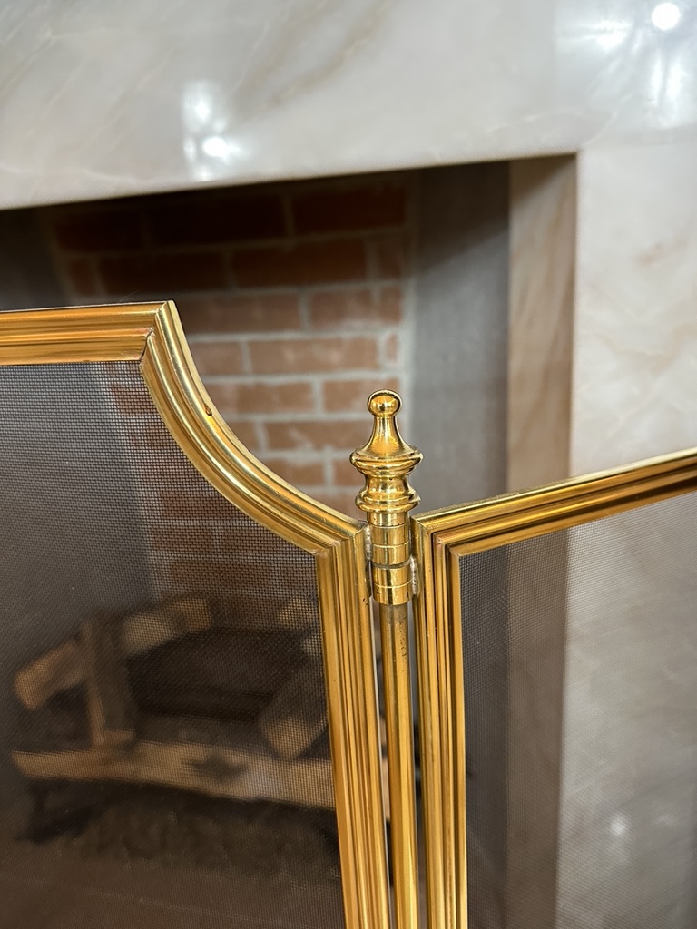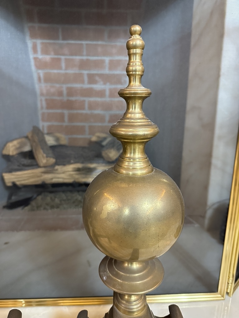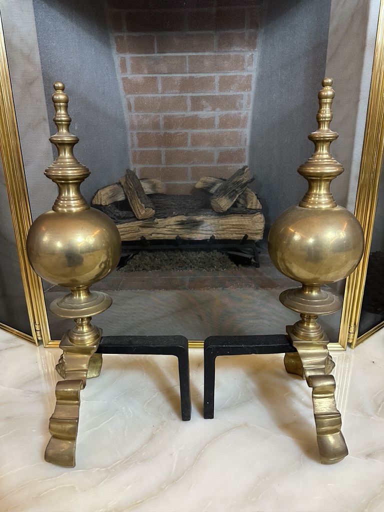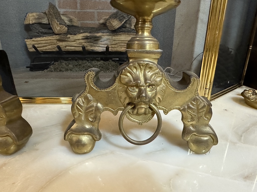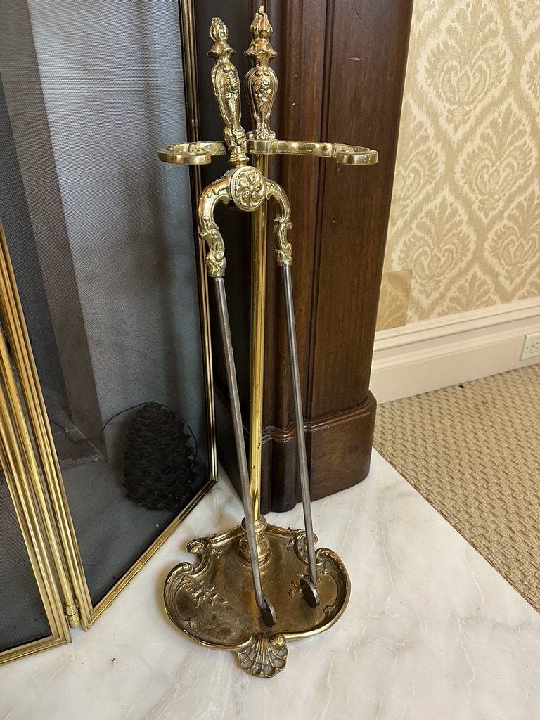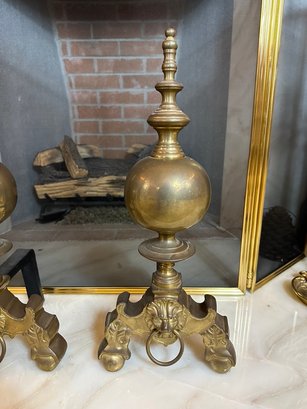Including a pair of brass andirons (22" H x 9.5" W x 8.5" D), a fireplace tool stand (26" H), and a tri fold brass and iron screen (33.5" H x 29" W of center piece x 12" W of sides)