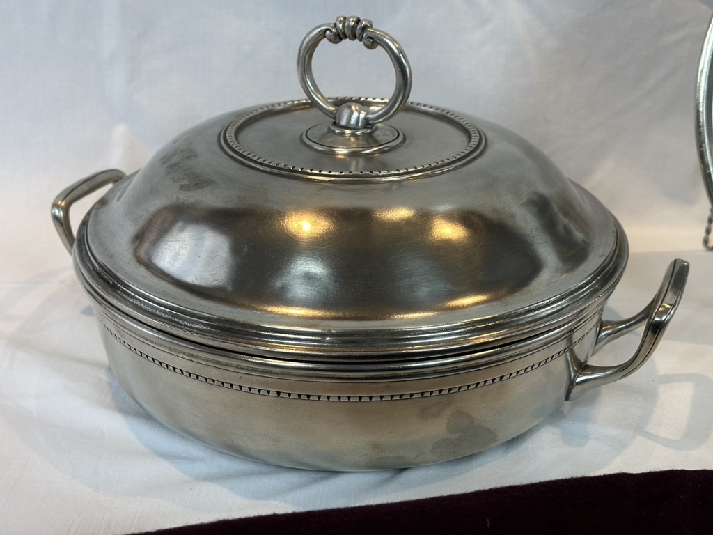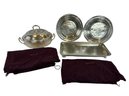 Including a round covered vegetable dish with Pyrex liner (13" L x 7" H), a rectangular-footed serving tray (14.75" L) and a matching pair of bowls (10.5" diameter). Comes with 3 original felt bags.