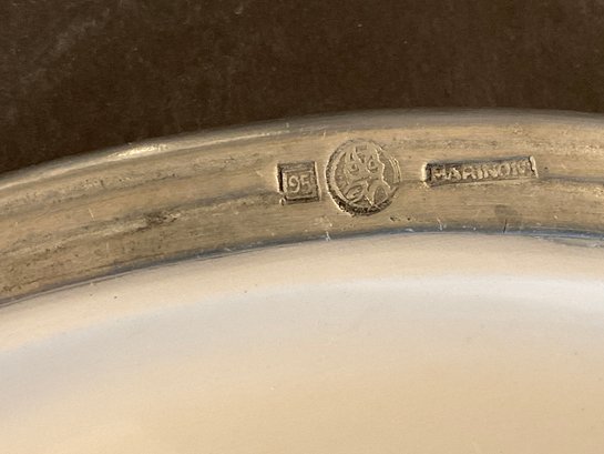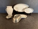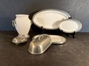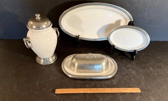 Very decorative and thick heavy porcelain body with pewter bases & tops items include a covered butter, dish, covered vessel, and two trays.