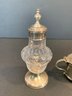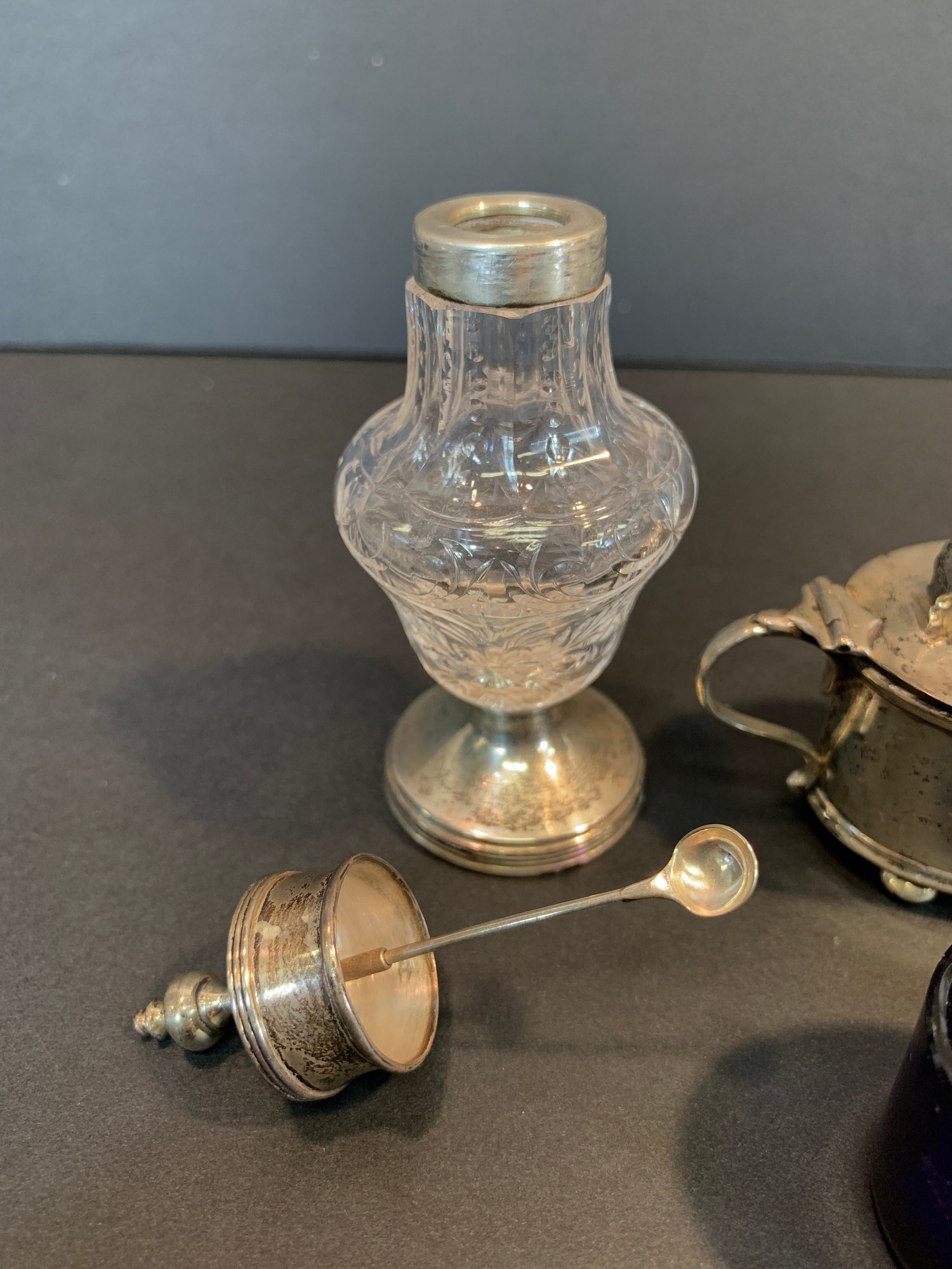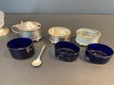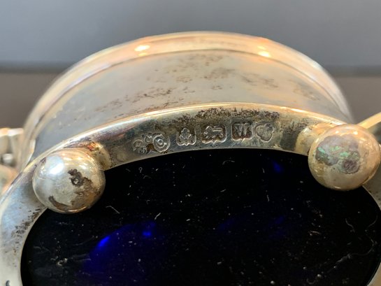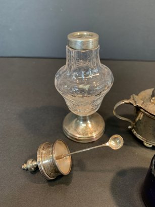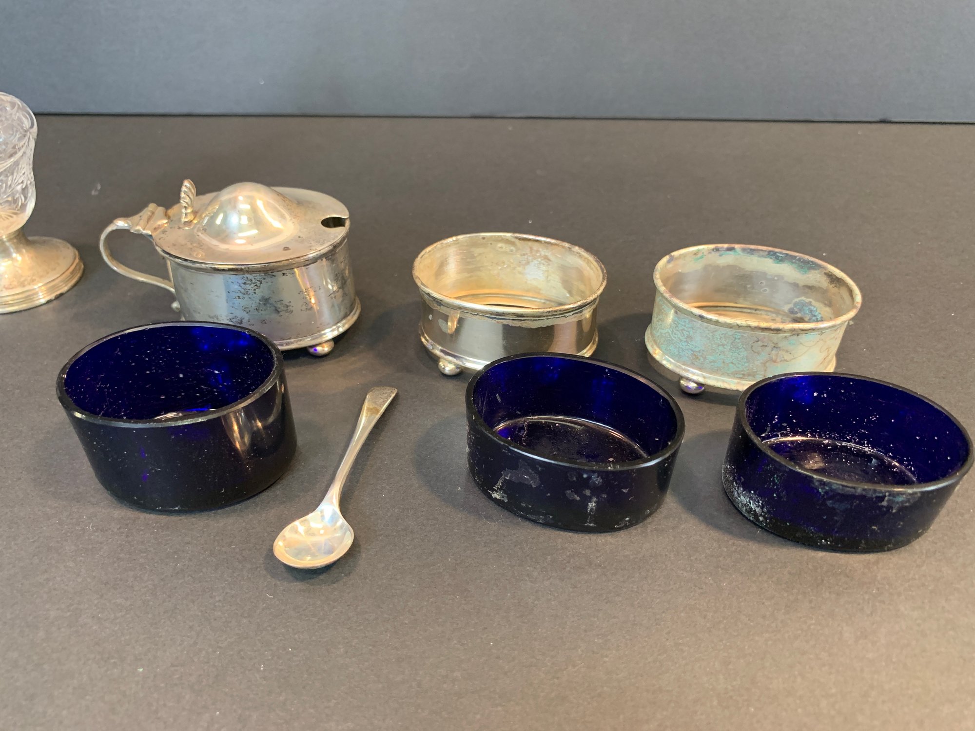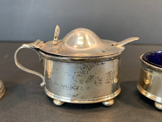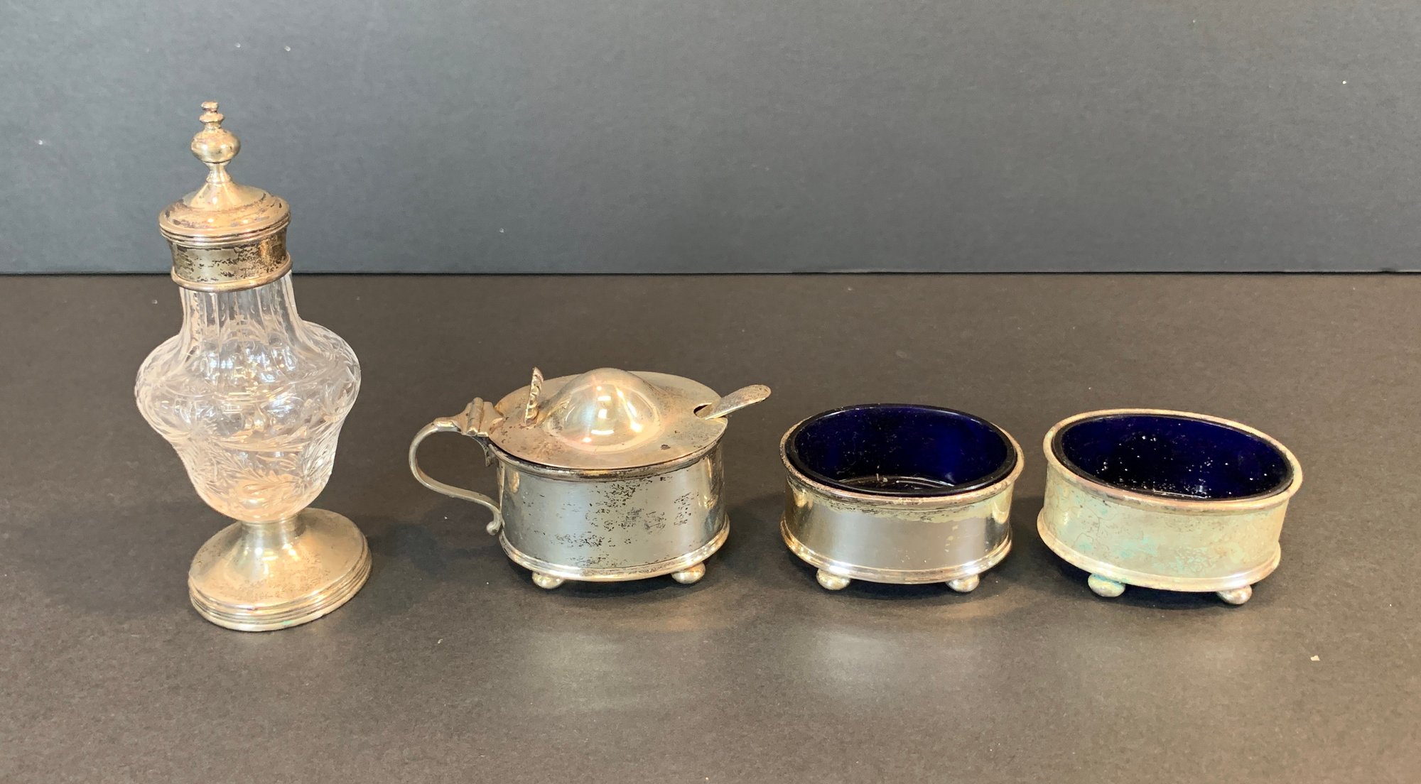 A matched group of four antique English sterling silver condiment pieces comprising a cut glass caster with sterling silver domed lid and pedestal base (weighted base); a mustard pot with hinged domed lid, loop handle, and original mustard spoon, on ball feet; and a pair of matching oval open salt cellars with cobalt blue glass liners, on ball feet. All hallmarked sterling silver.