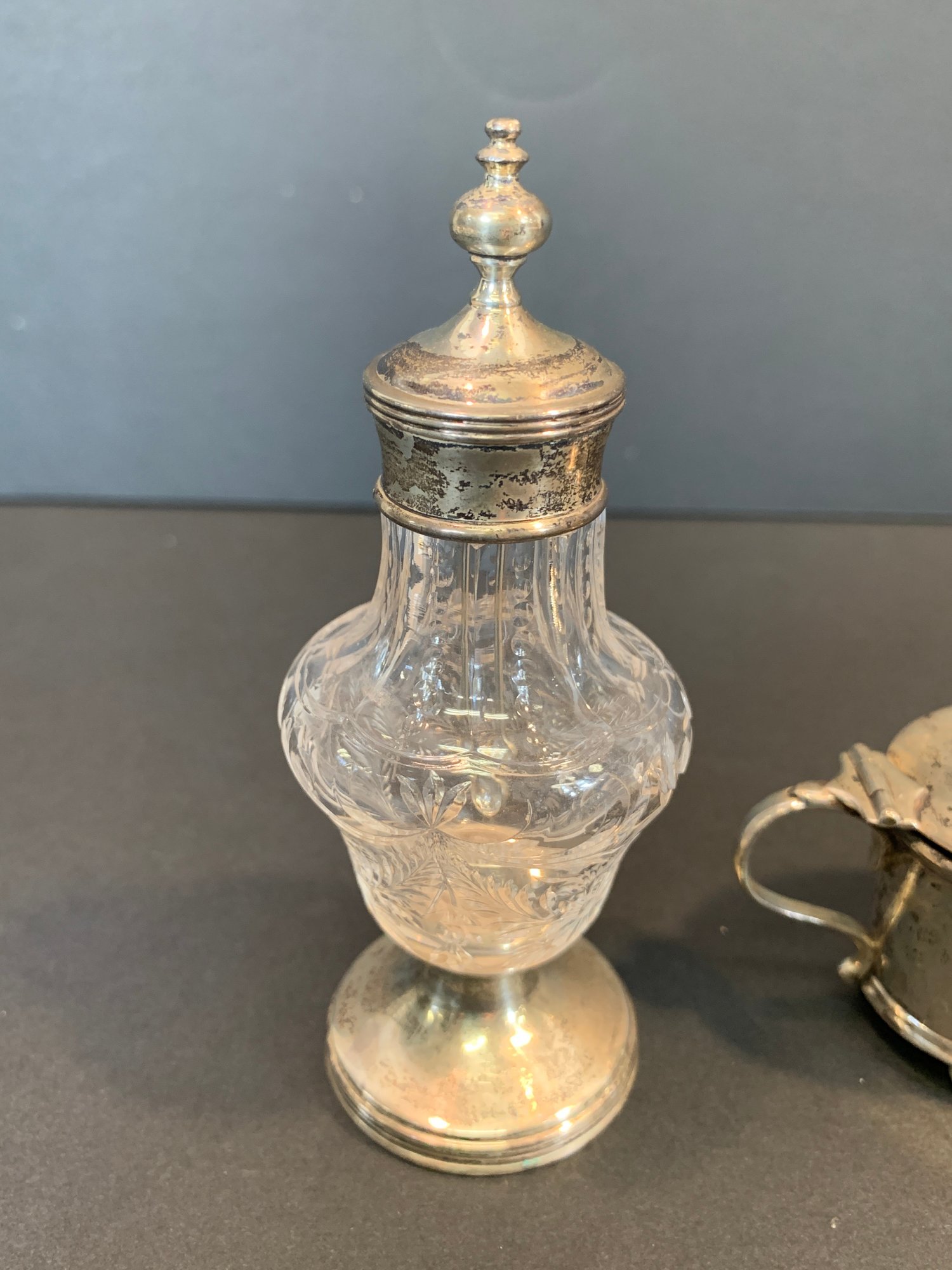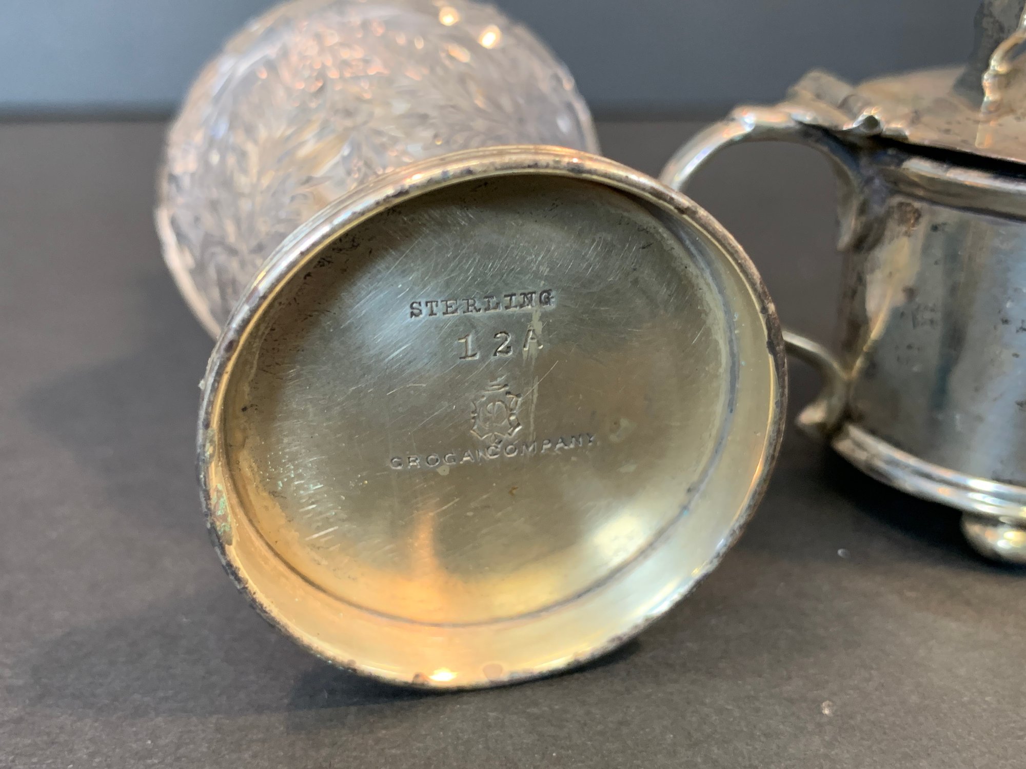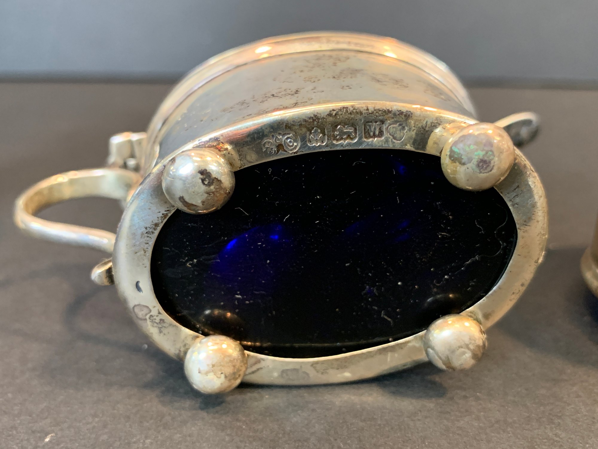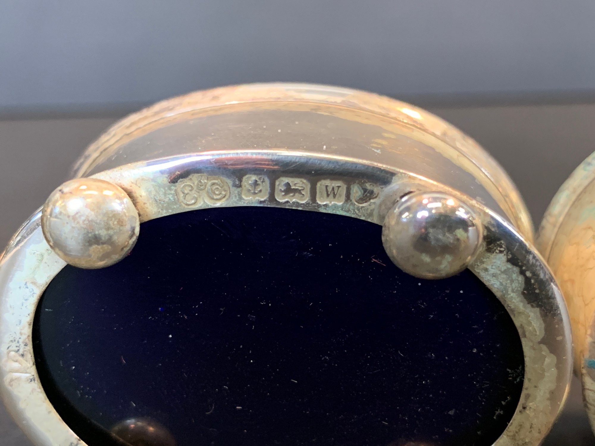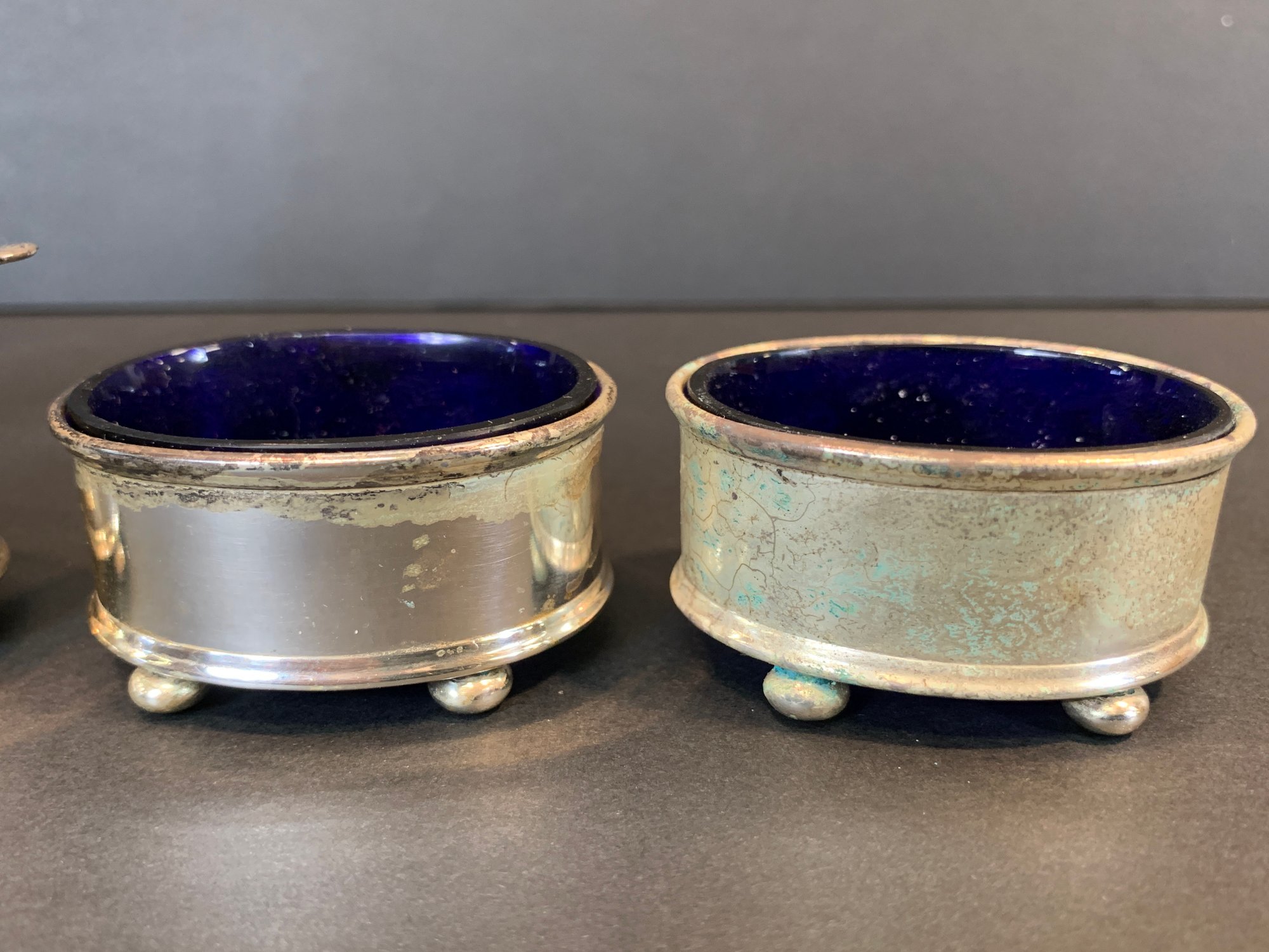 Condition: Good; tarnish consistent with age, cobalt liners intact, please refer to photographs for details.
