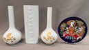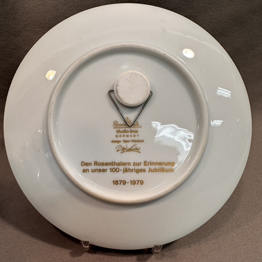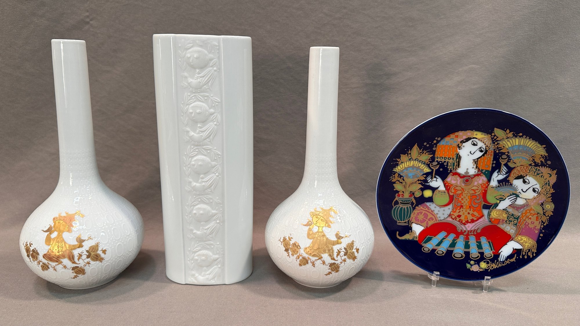 A pair of flower vases with gold painted designs of birds and Chinese figure, a cylinder form flower vase , and a round painted plate commemorating 100 year anniversary of Rosenthal , all signed on bottom.