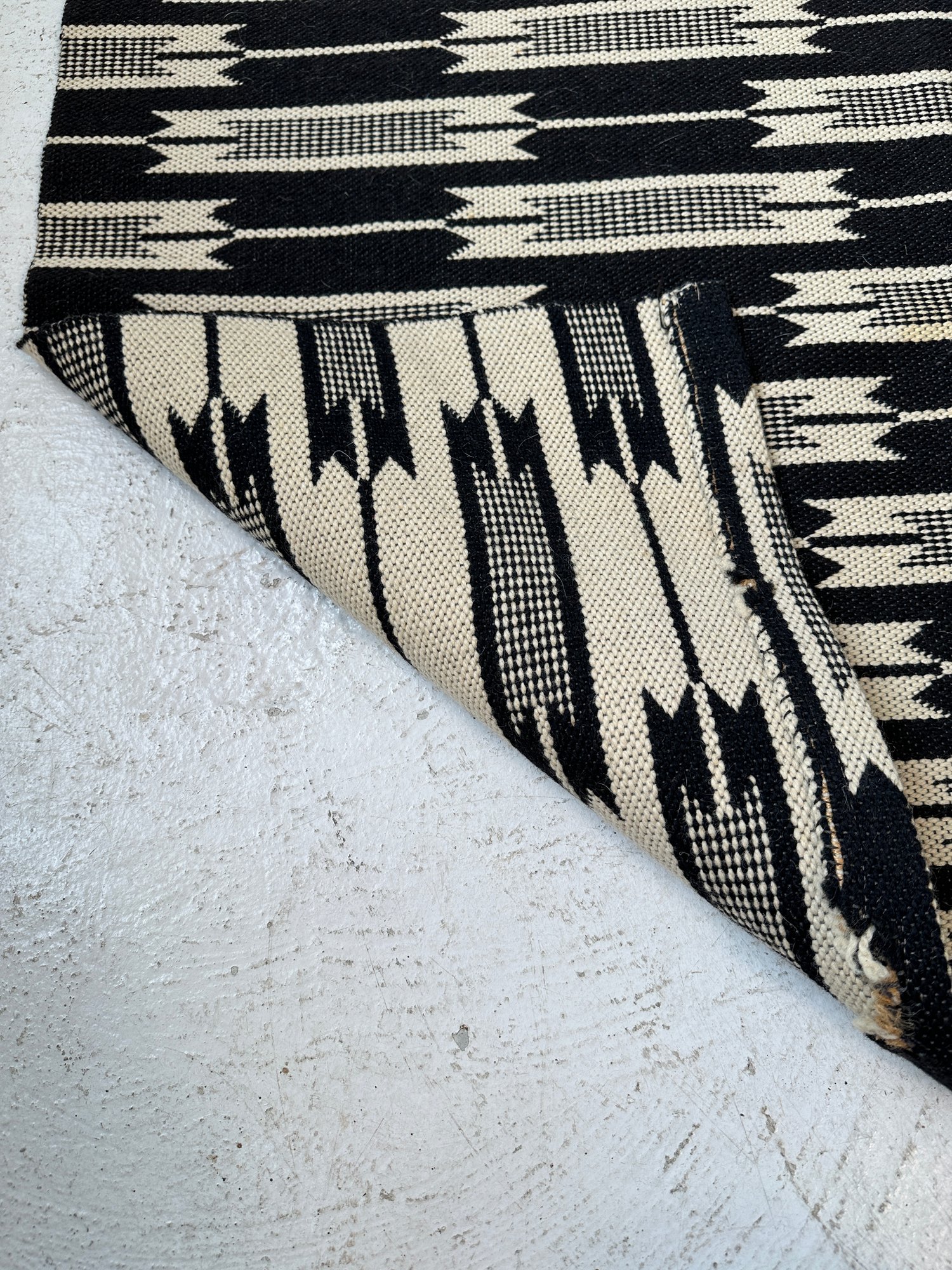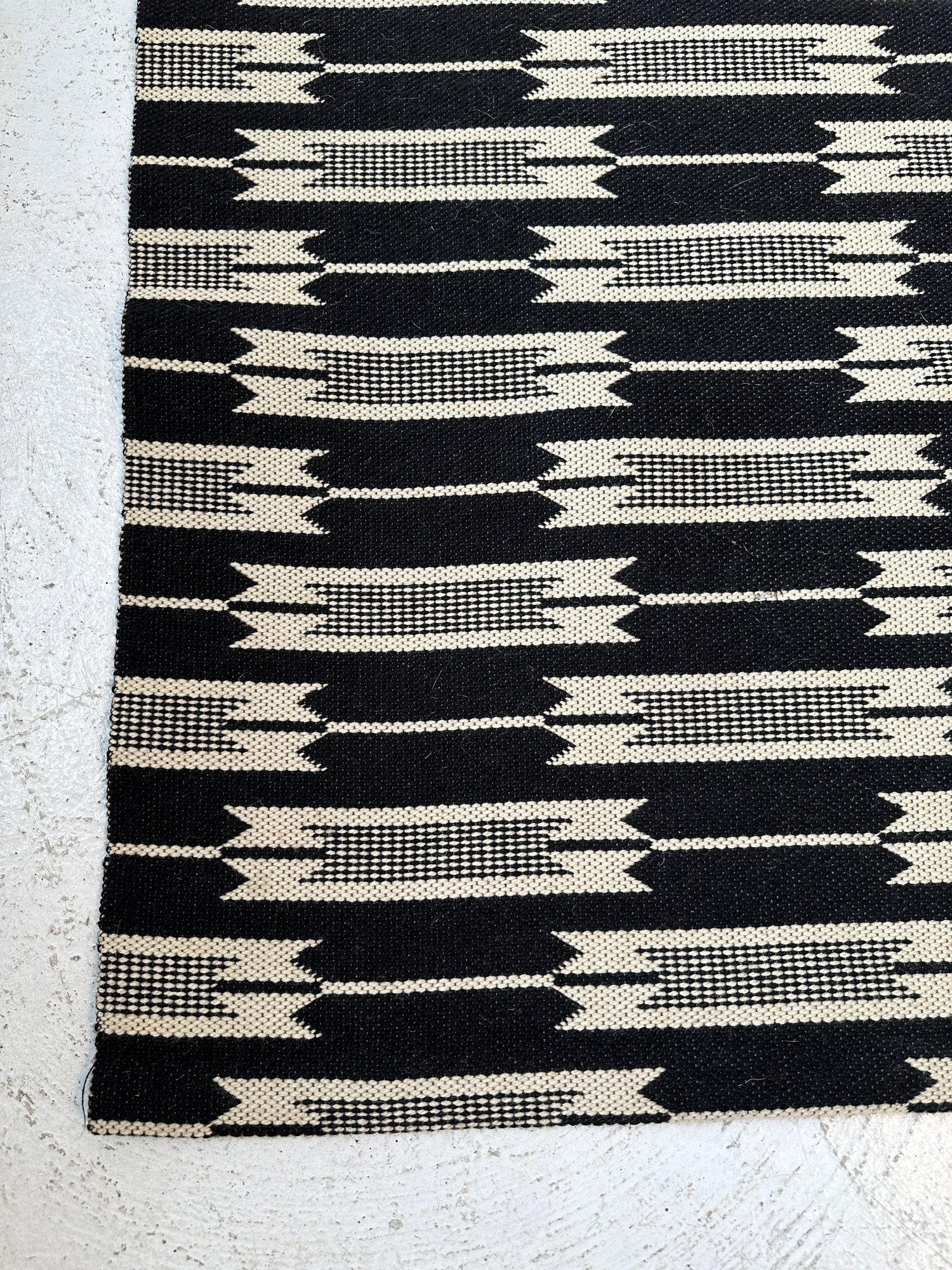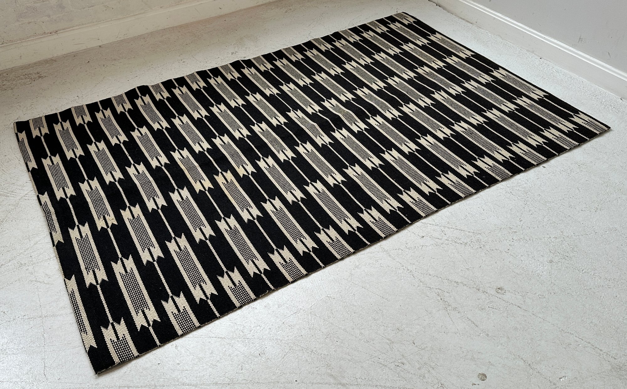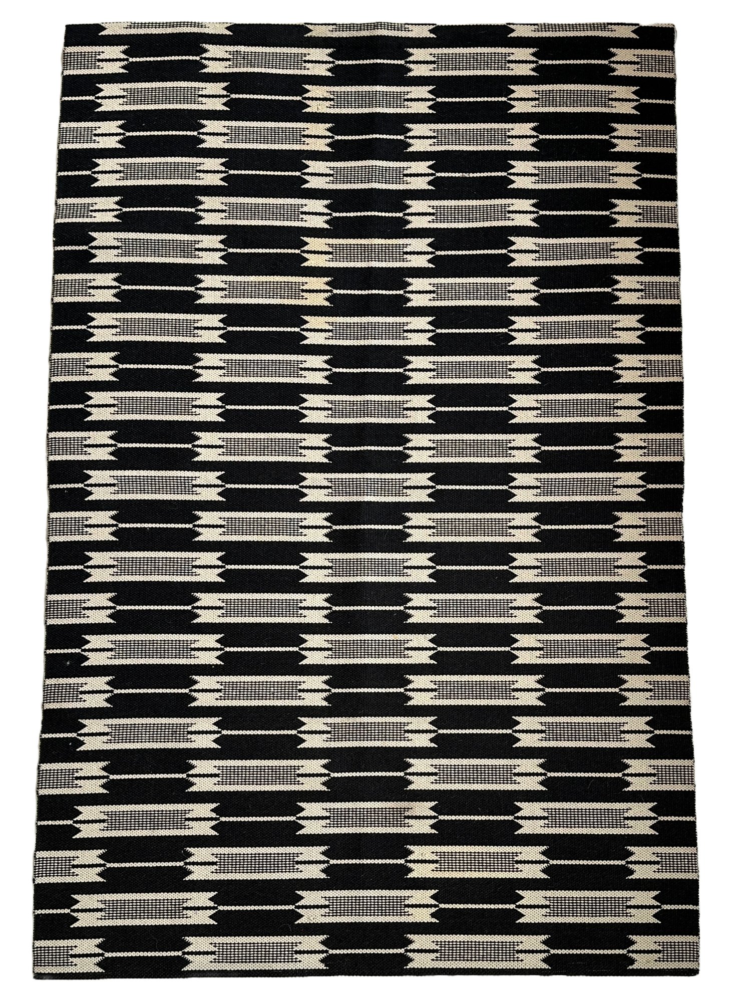A Danish modern wool blend carpet designed with a geometric pattern in cream and dark navy blue(looks black).