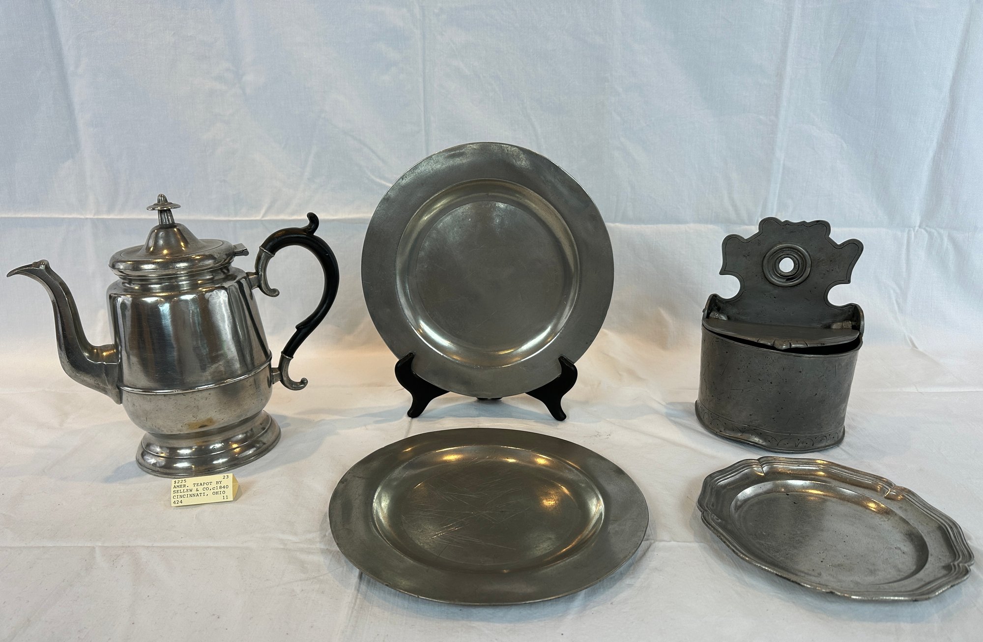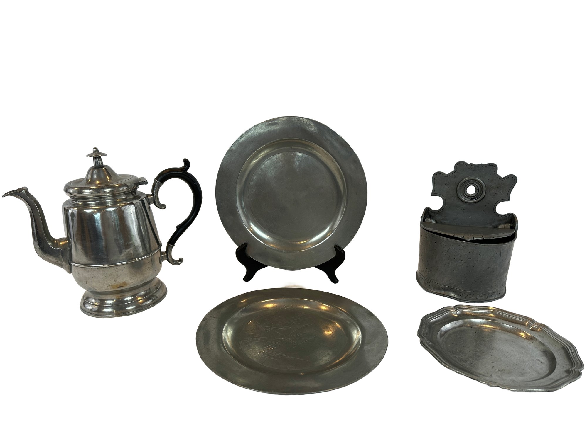 Including a signed Sellew & Co. pewter teapot circa 1840 (9.25" H), 2 plates signed London (9.5" diameter), Flemish hanging matchbox (8.5" H), small scallop-edged plate (7.25" diameter).