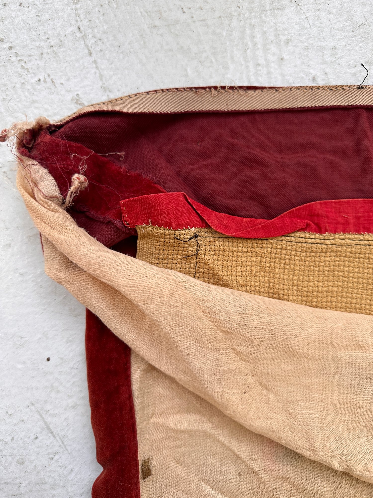 A colorful scene depicting a group of people in a circle, possible dancing or engaging in a cultural activity. Finished off with red velvet border and cloth backing.