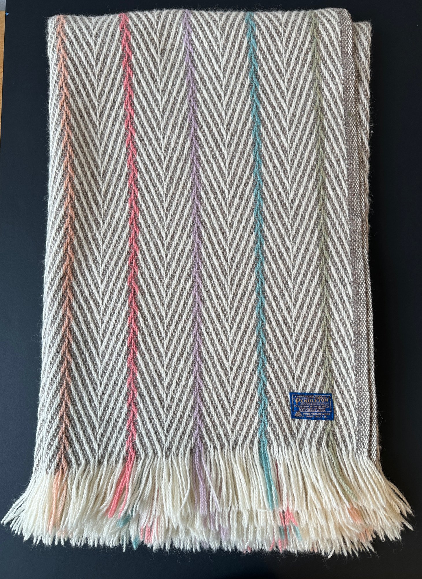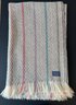 A herringbone pattern with pastel colored stripes finished with fringe. Made in USA.