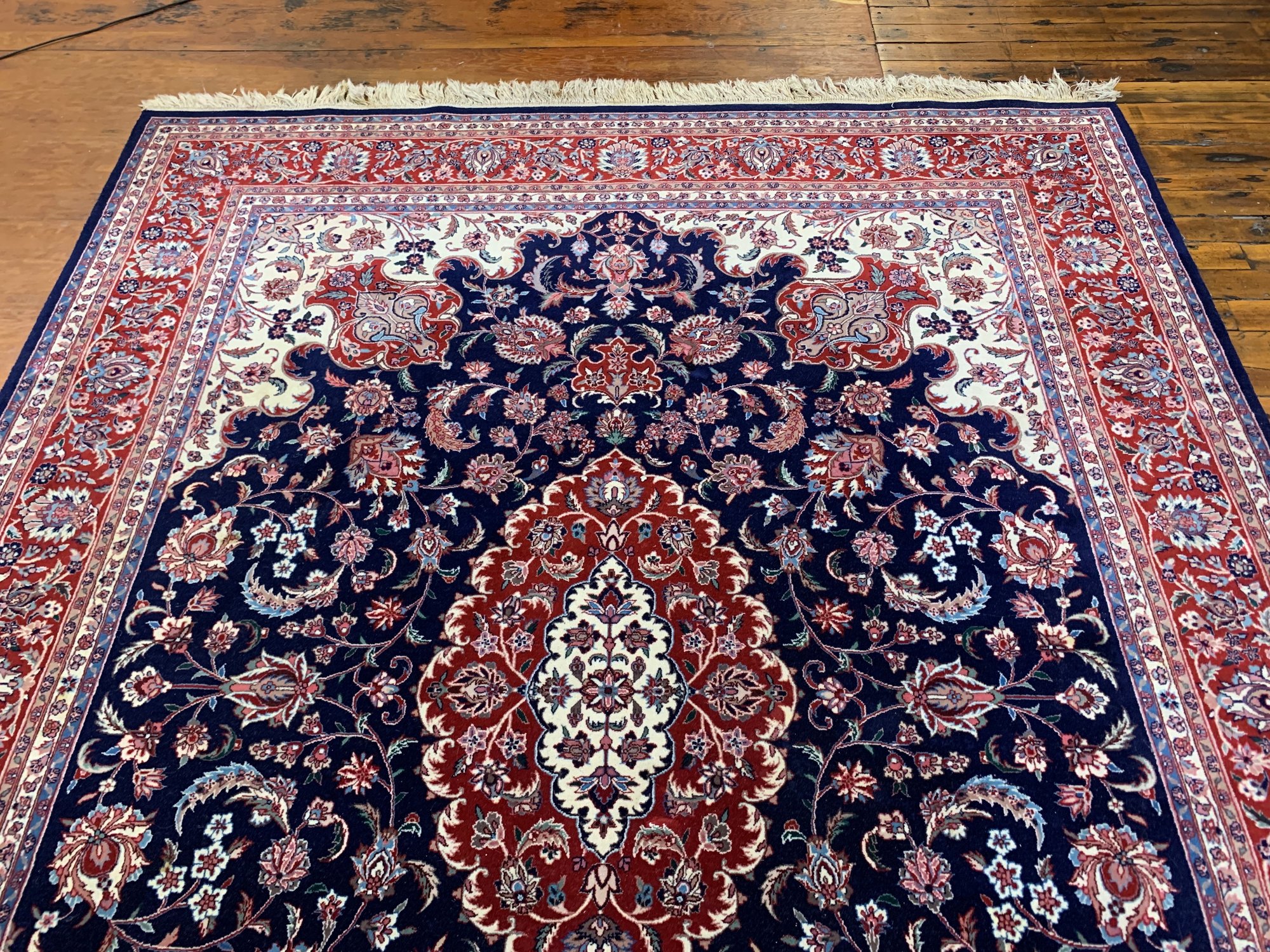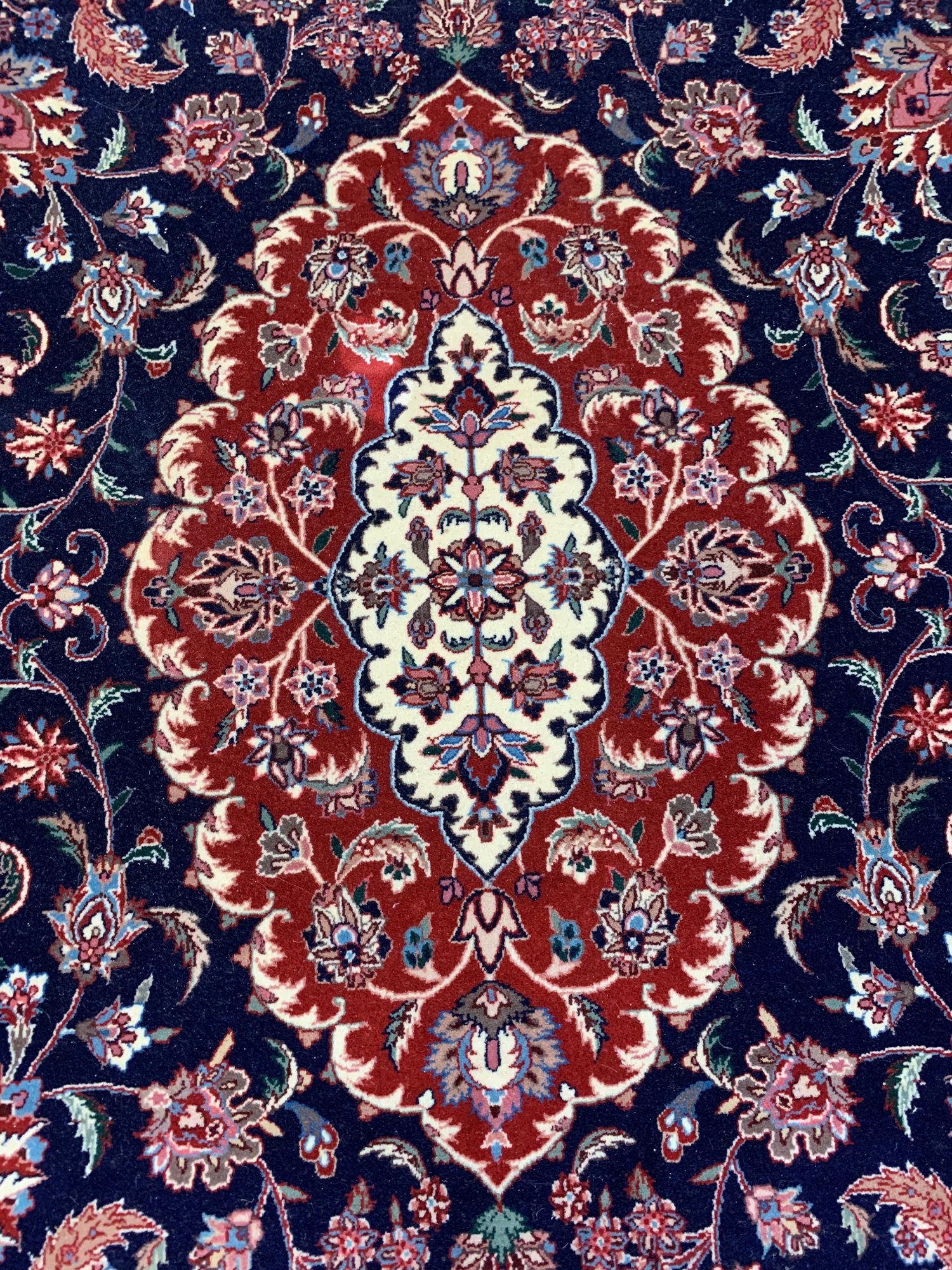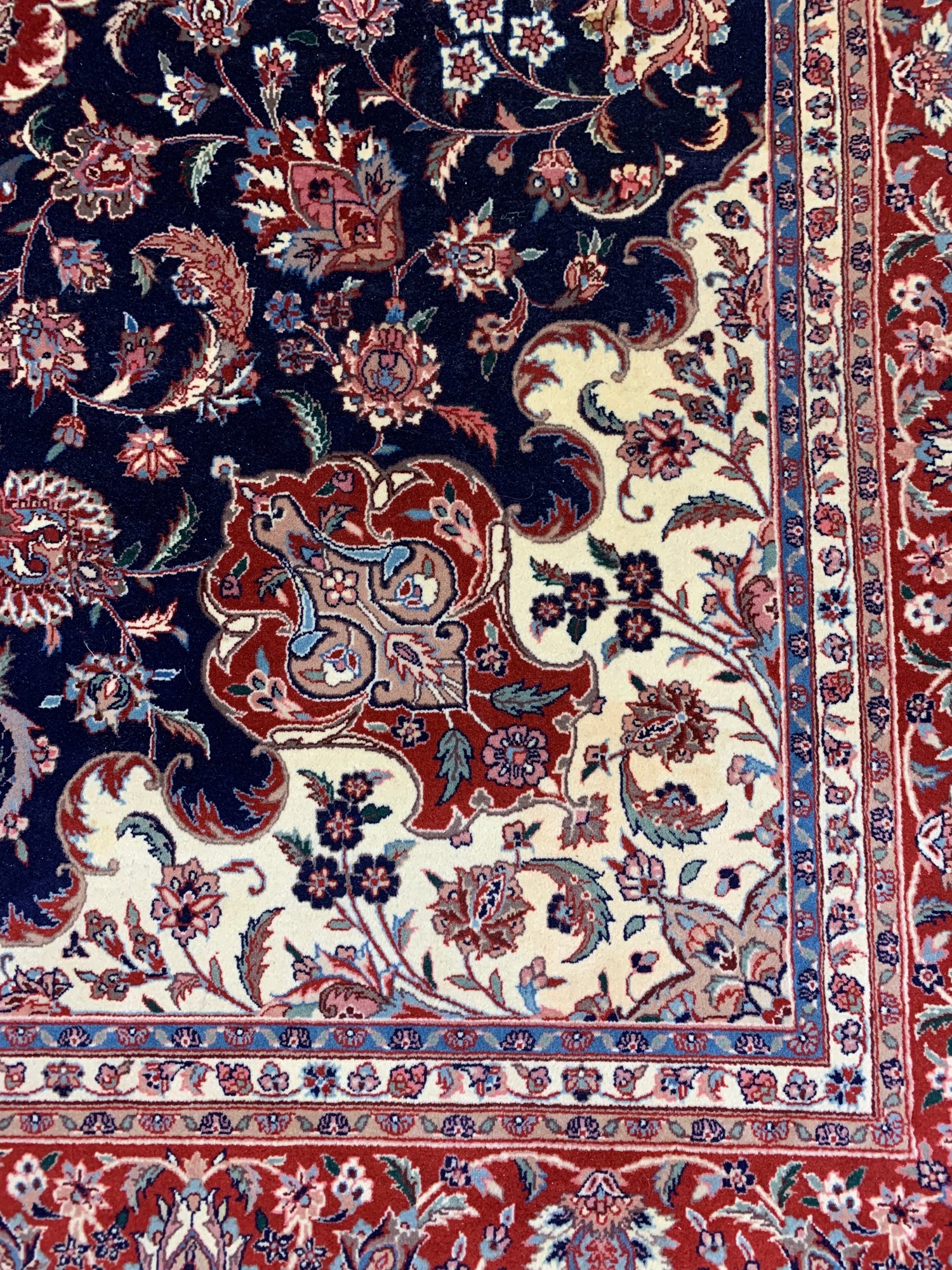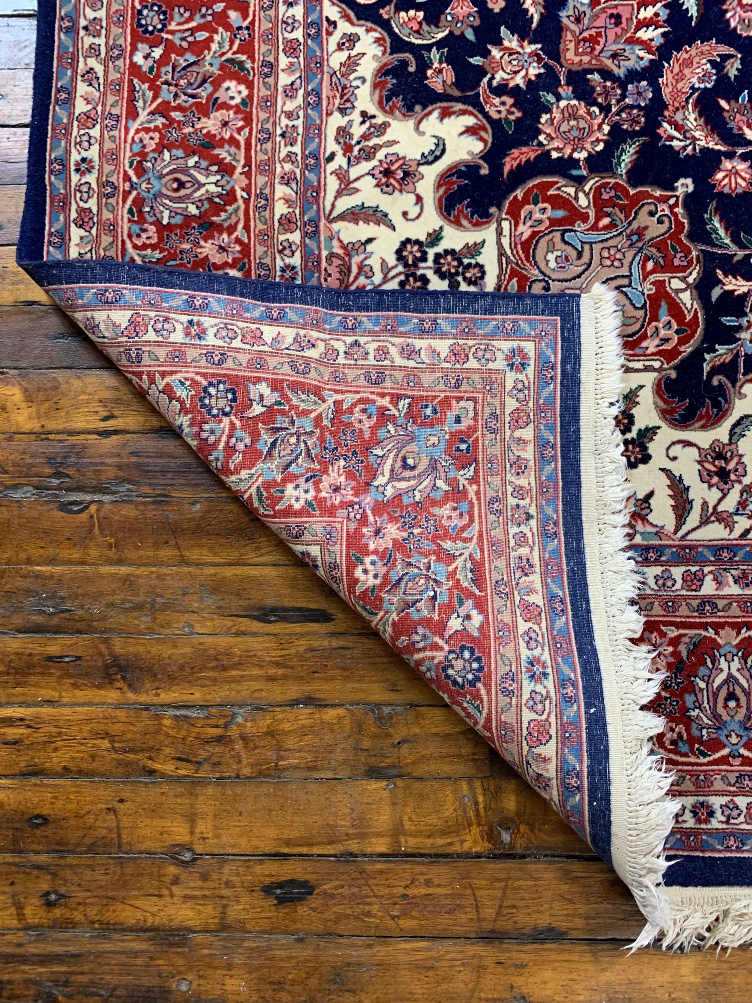A hand-knotted area rug featuring a central medallion design on a deep navy ground with rich red, ivory, and soft blue accents. The elaborate floral medallion is framed by sweeping ivory spandrels filled with scrolling vines and blossoms, all enclosed within a deep red floral border. Fine, tight hand-knotting with excellent pile depth throughout, clearly visible in the detail shots. Cotton fringe ends.