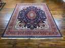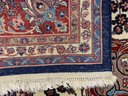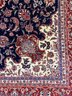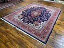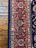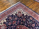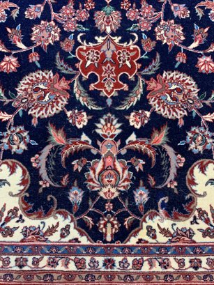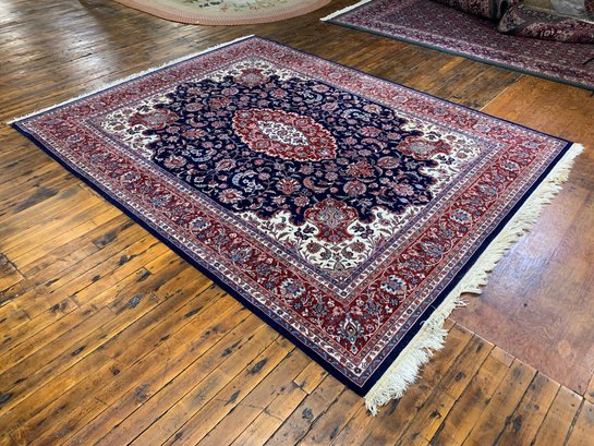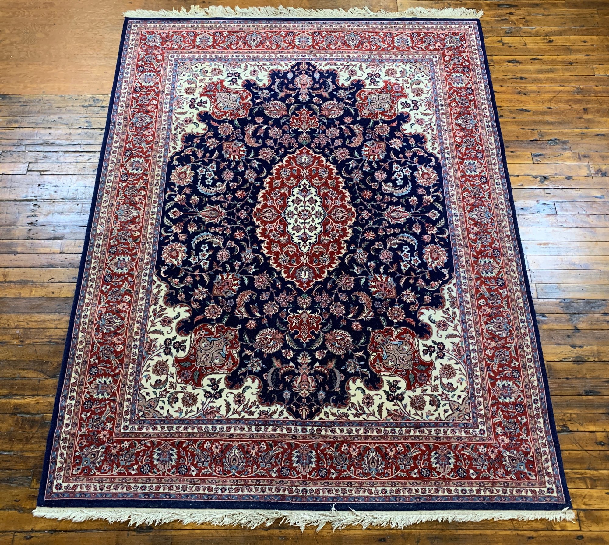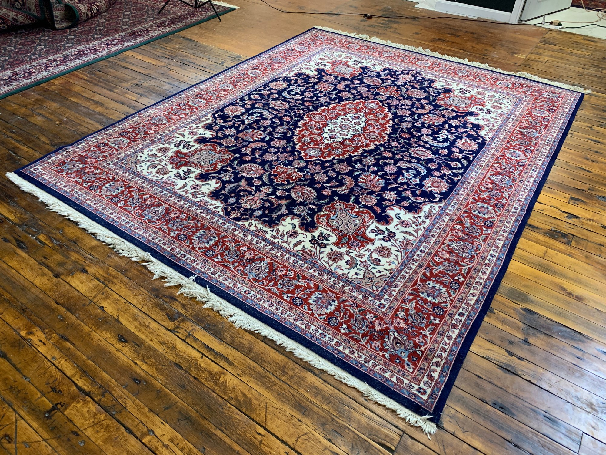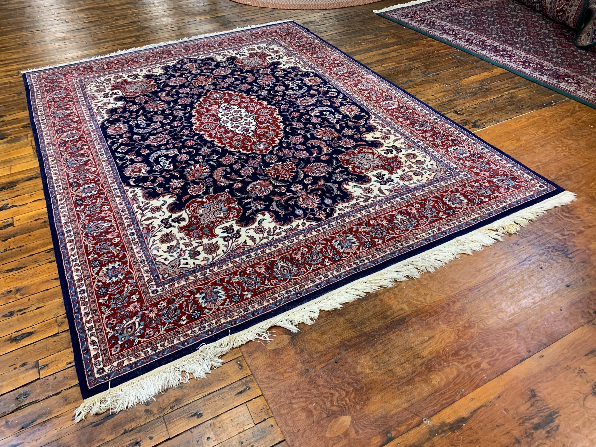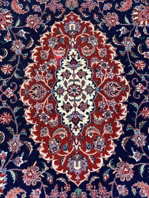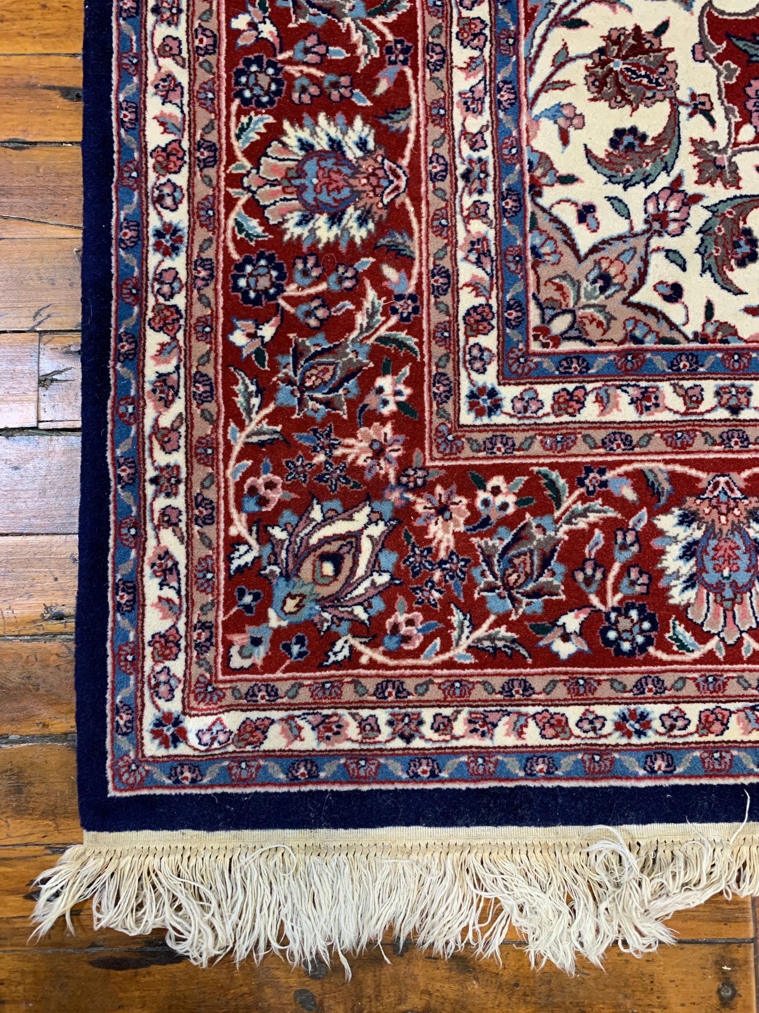 A hand-knotted area rug featuring a central medallion design on a deep navy ground with rich red, ivory, and soft blue accents. The elaborate floral medallion is framed by sweeping ivory spandrels filled with scrolling vines and blossoms, all enclosed within a deep red floral border. Fine, tight hand-knotting with excellent pile depth throughout, clearly visible in the detail shots. Cotton fringe ends.