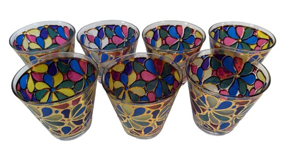 A set of 7 mid century Georges Briard designed floral mosaic flower power lowball glasses.