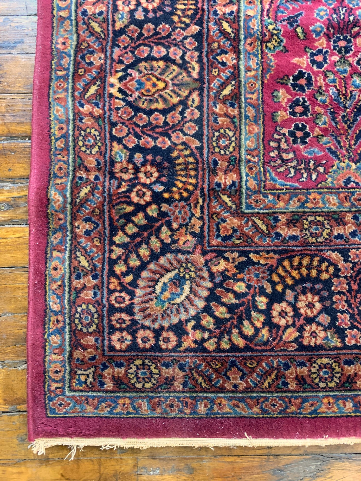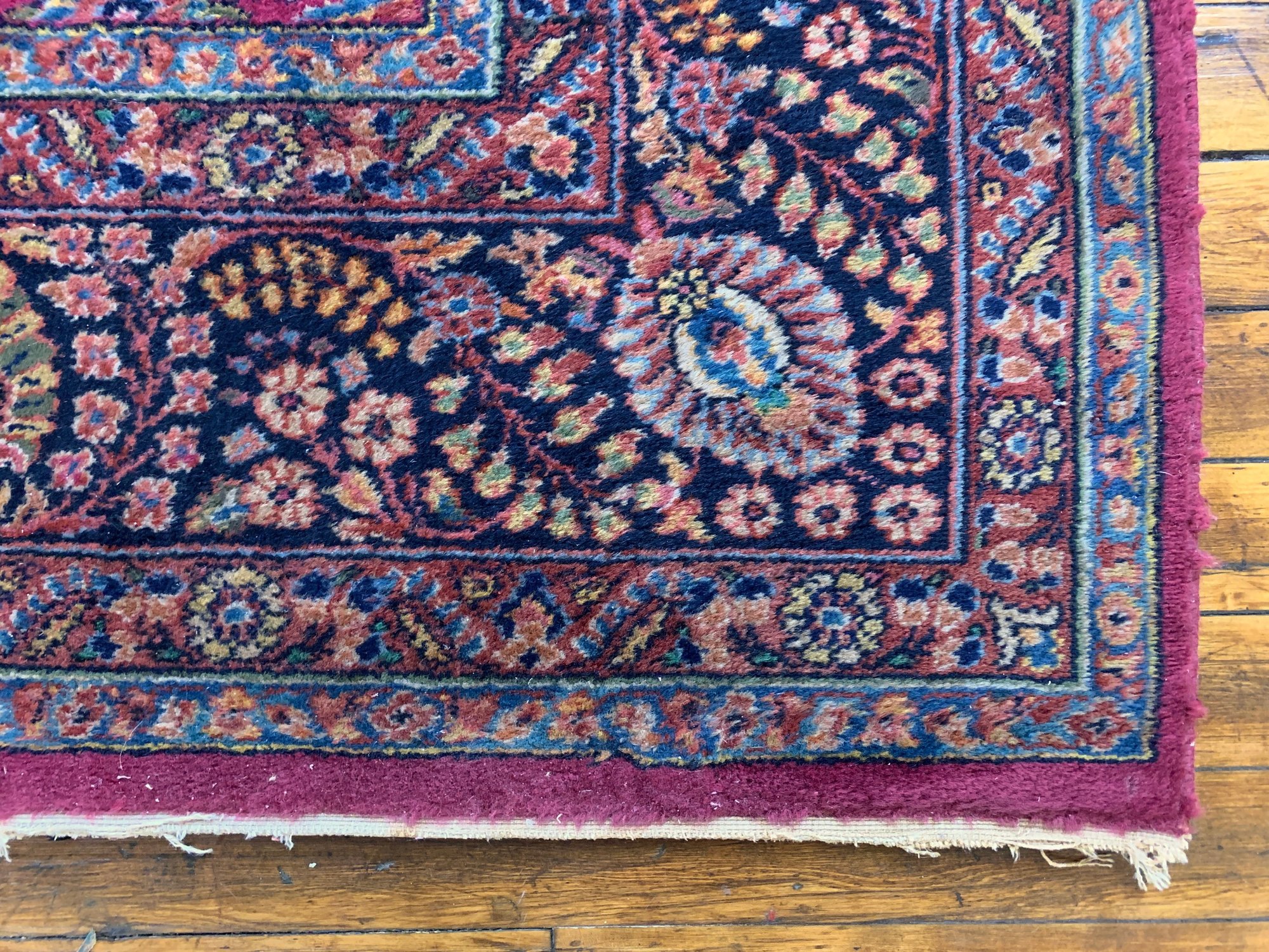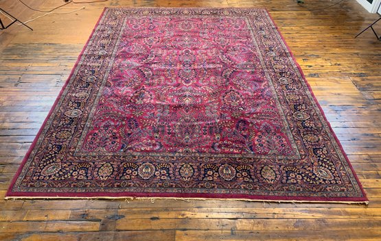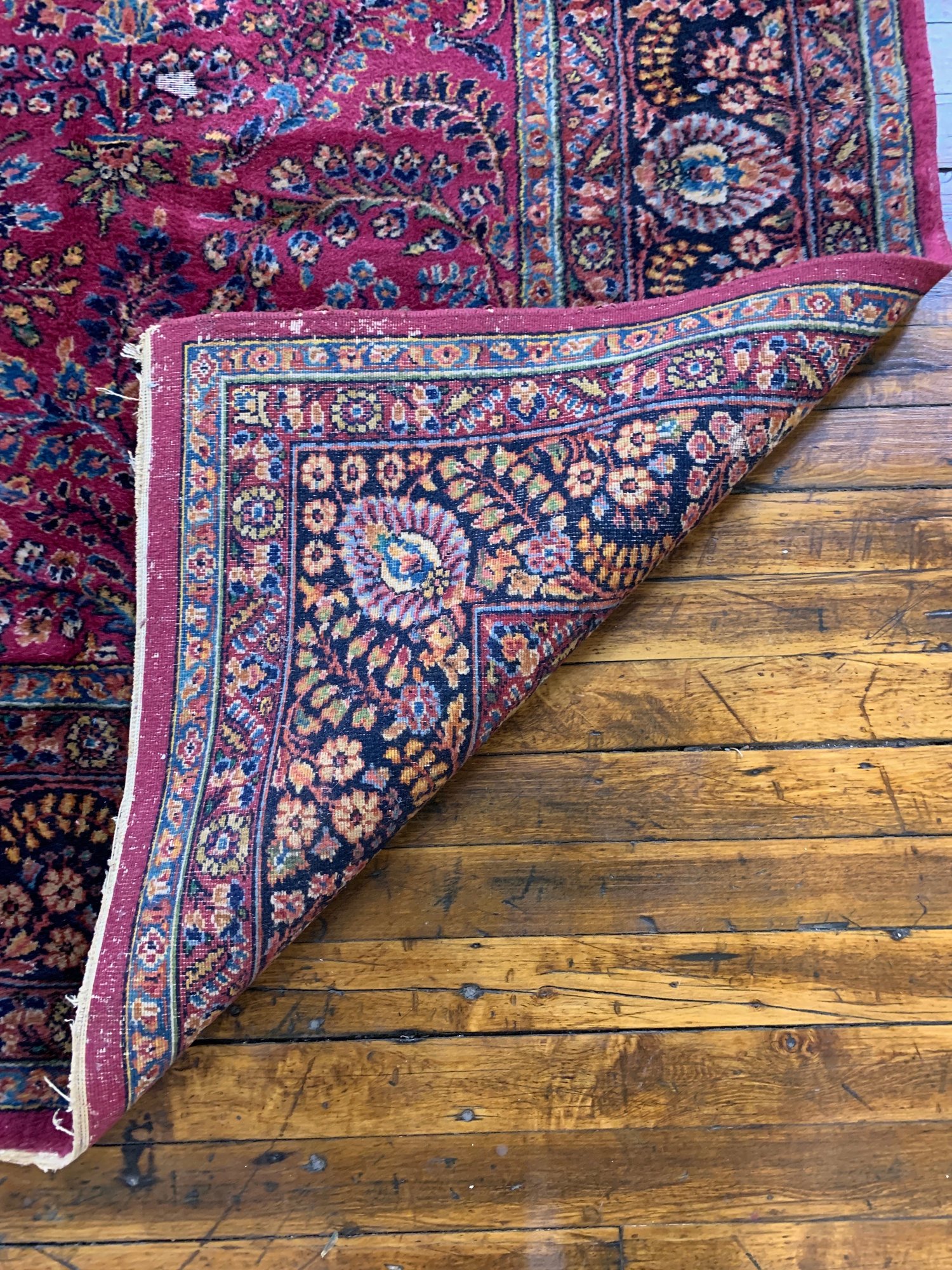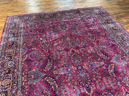 A large antique hand-knotted Persian Sarouk rug featuring an all-over scrolling floral design on a deep crimson ground with navy, blue, gold, and green accents. The wide navy border is filled with large-scale floral and palmette motifs enclosed within multiple guard stripes. Fine, dense hand-knotting consistent with classic Sarouk weaving. The back shows tight, even knotting indicative of age and quality.