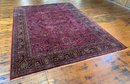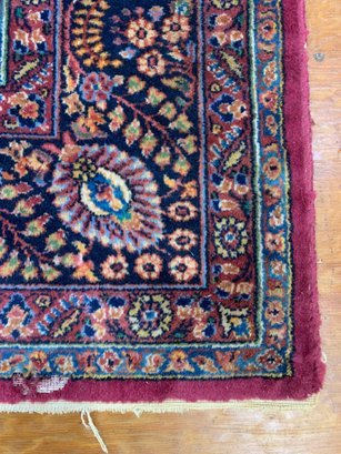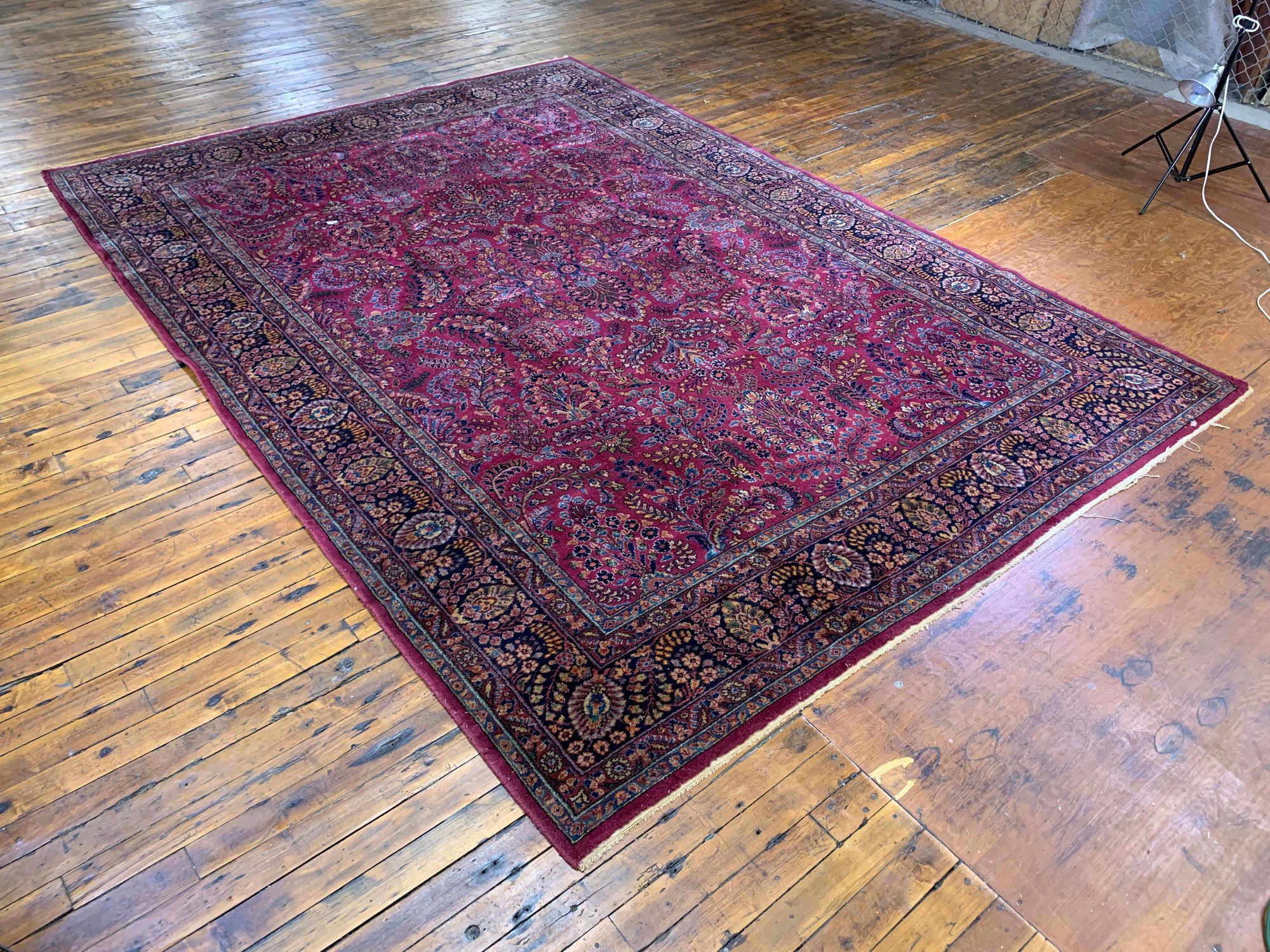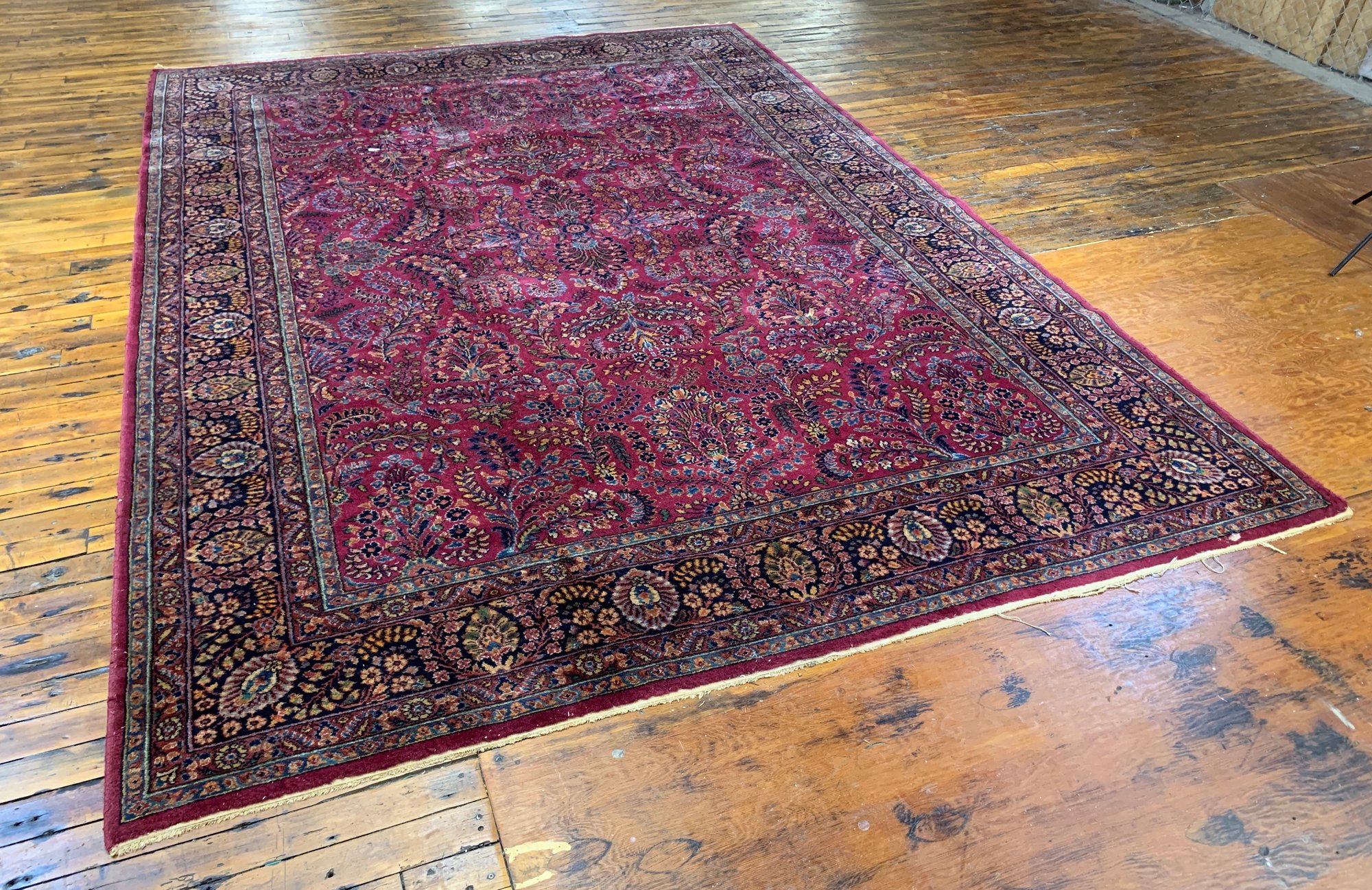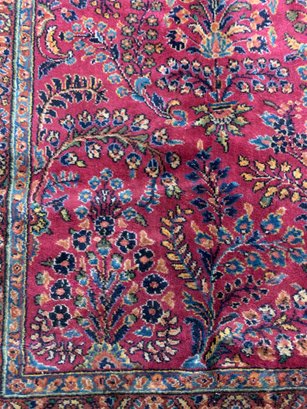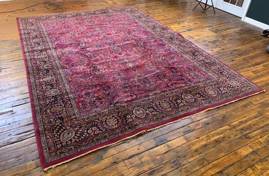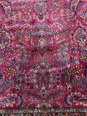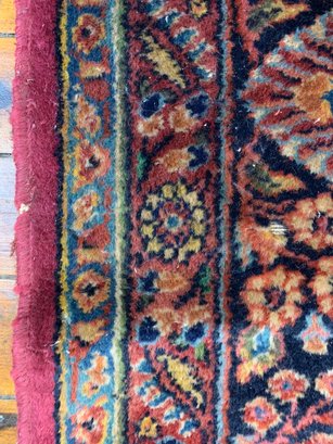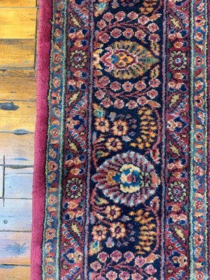 A large antique hand-knotted Persian Sarouk rug featuring an all-over scrolling floral design on a deep crimson ground with navy, blue, gold, and green accents. The wide navy border is filled with large-scale floral and palmette motifs enclosed within multiple guard stripes. Fine, dense hand-knotting consistent with classic Sarouk weaving. The back shows tight, even knotting indicative of age and quality.