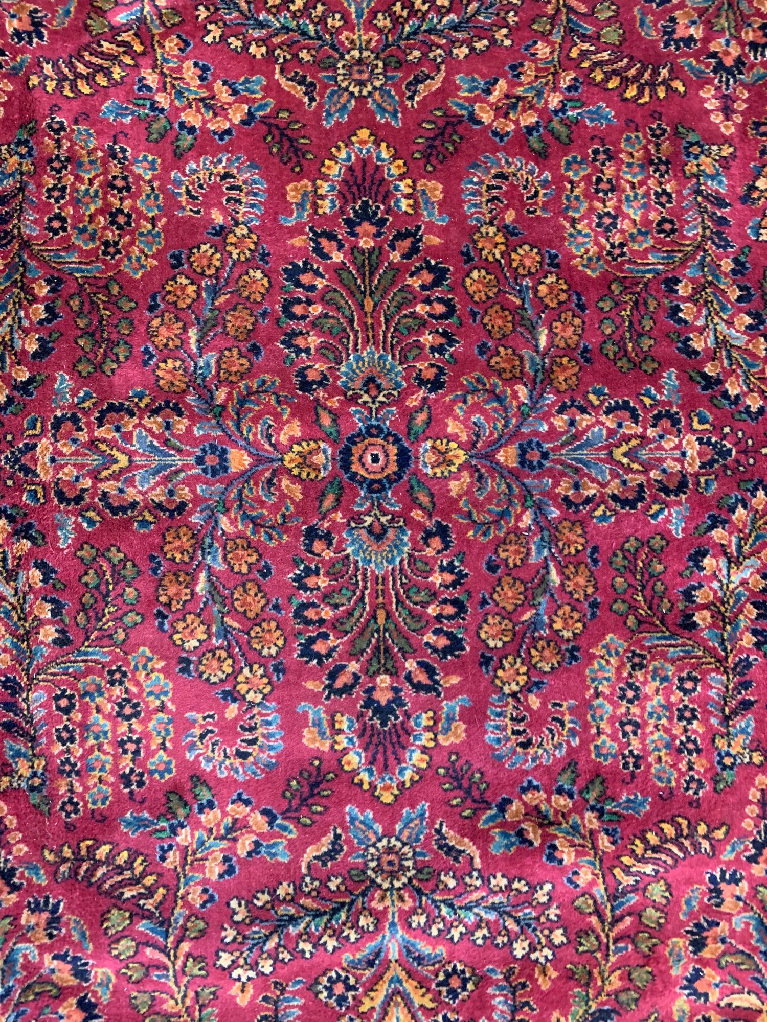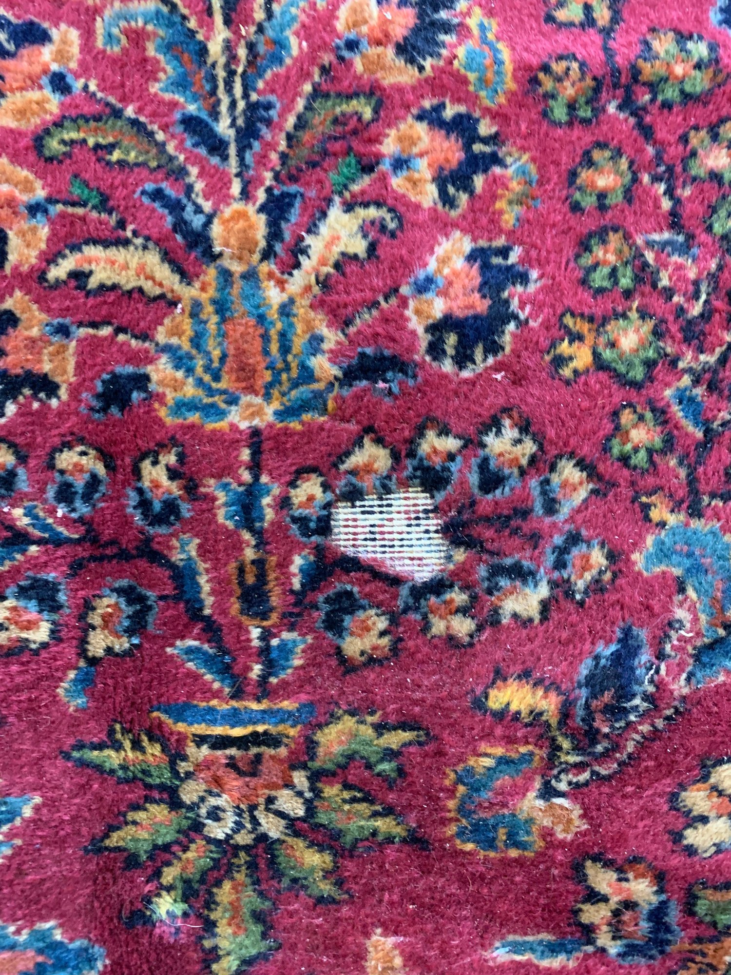 Condition: Fair to good. Two obvious areas of moth damage and some spots throughout. A professional cleaning and repair are recommended. Please refer to photographs for full detail.