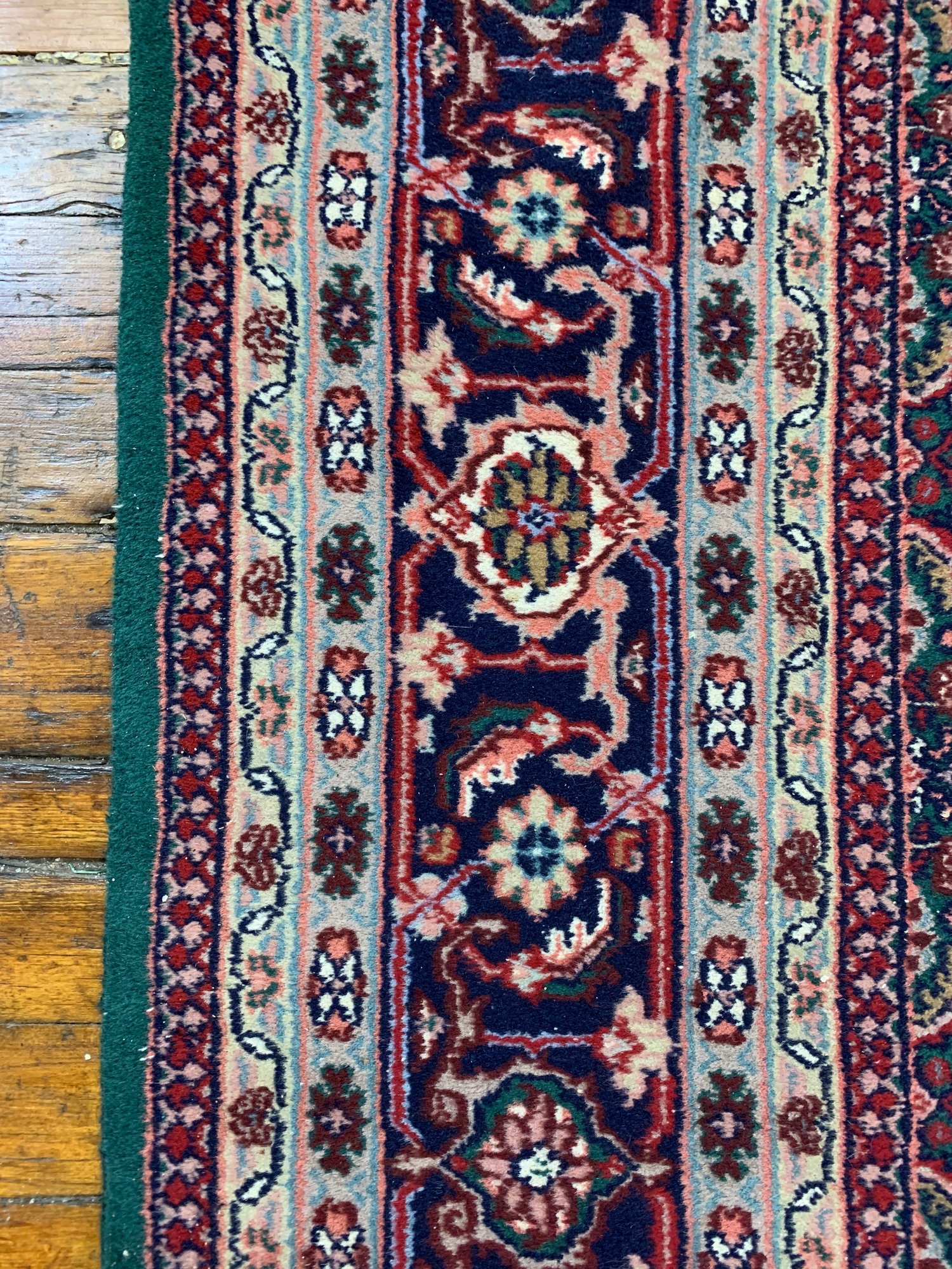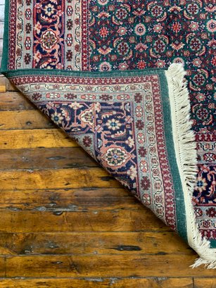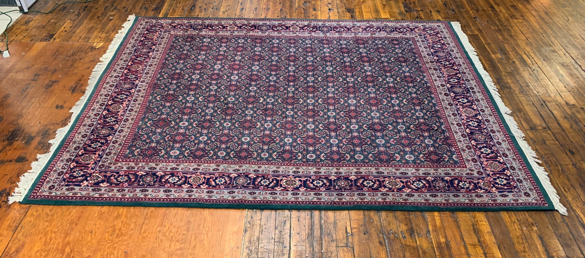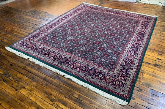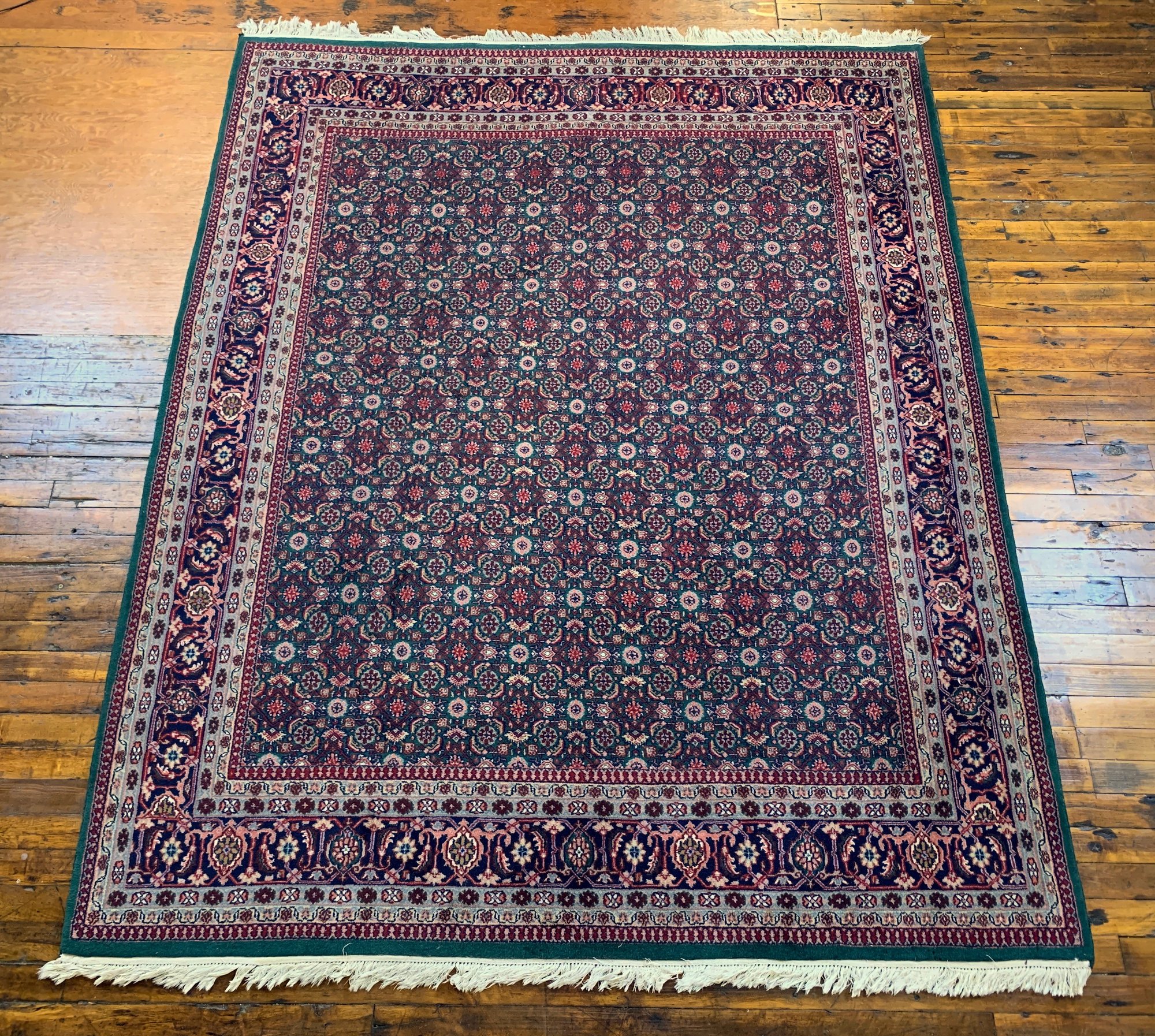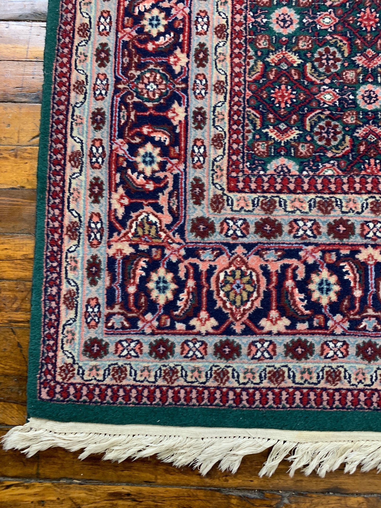 A hand-knotted area rug featuring a classic all-over Herati (fish) pattern on an forest green ground with red, navy, and soft pink accents. The deep navy border is elaborately decorated with scrolling floral medallions, enclosed within multiple decorative guard stripes. Fine, tight hand-knotting with good pile depth throughout, clearly visible in the detail shots. Cotton fringe ends.