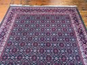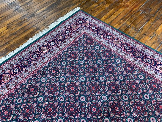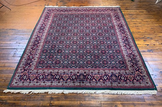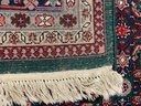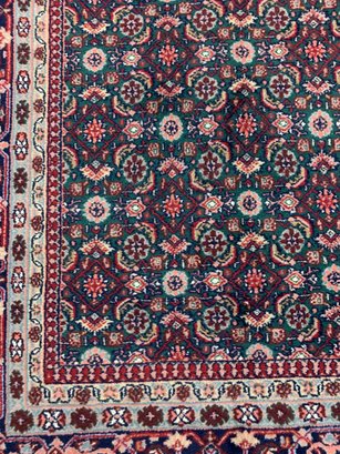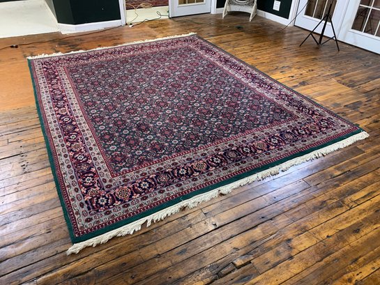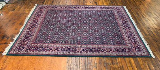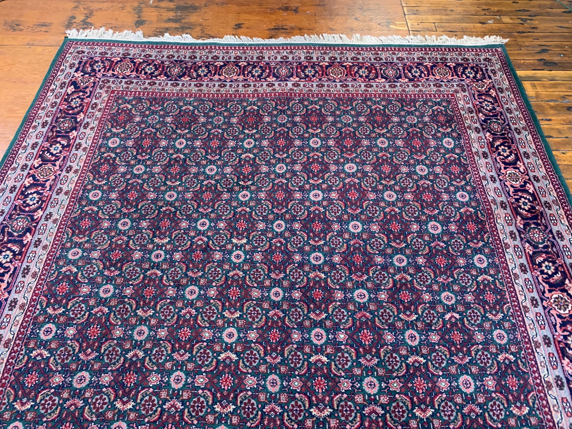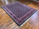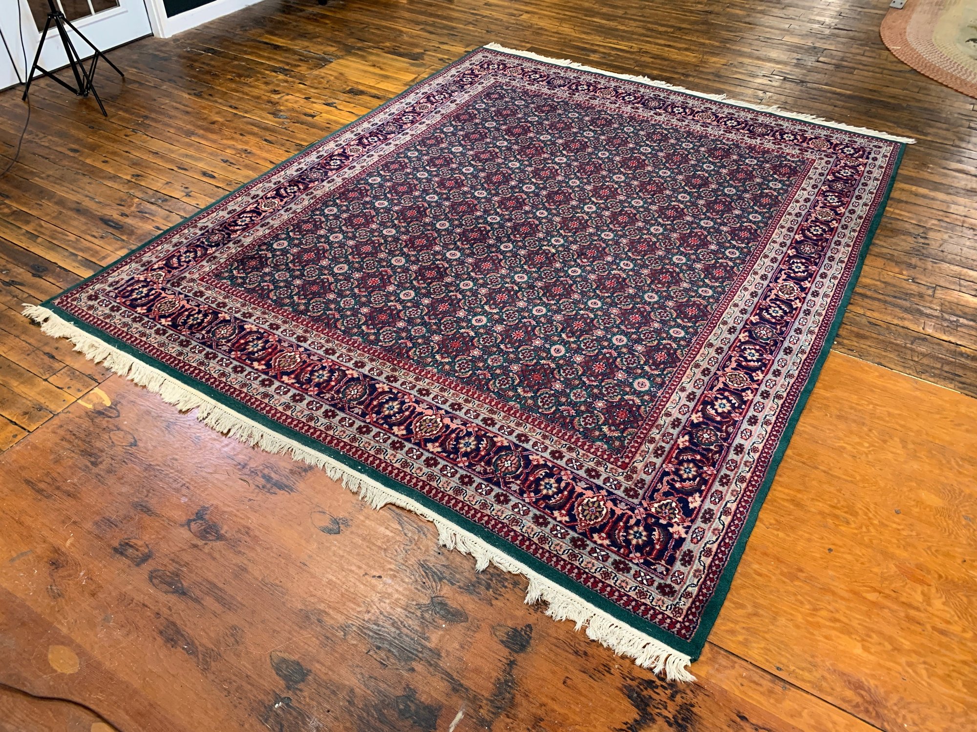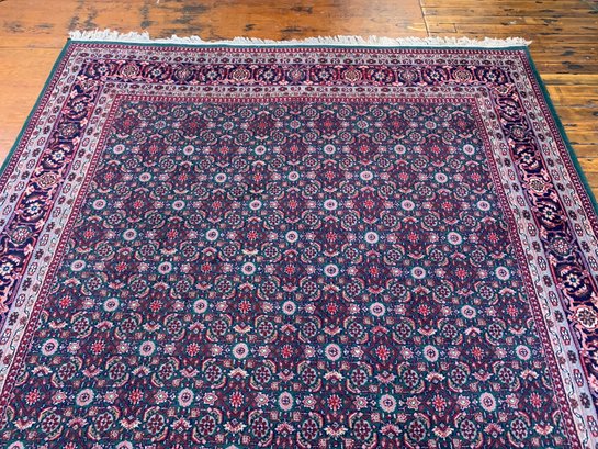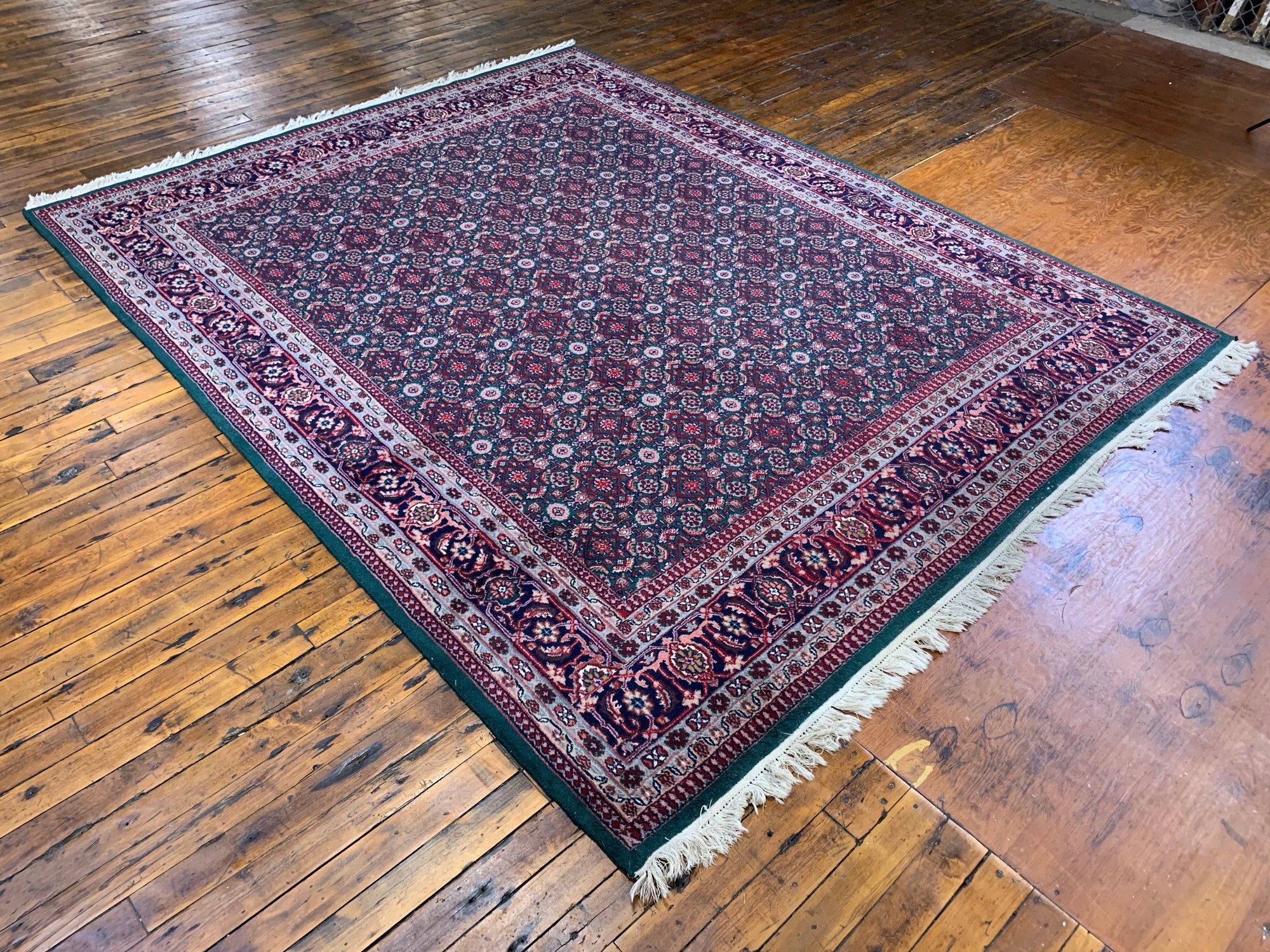 A hand-knotted area rug featuring a classic all-over Herati (fish) pattern on an forest green ground with red, navy, and soft pink accents. The deep navy border is elaborately decorated with scrolling floral medallions, enclosed within multiple decorative guard stripes. Fine, tight hand-knotting with good pile depth throughout, clearly visible in the detail shots. Cotton fringe ends.