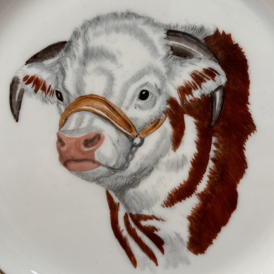 White porcelain plate with gold rim and details featuring a hand painted hereford cow in center. Marked on reverse.
