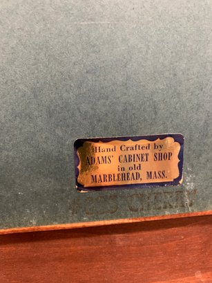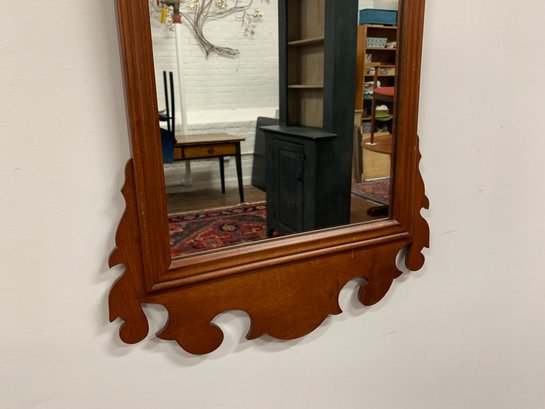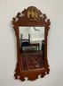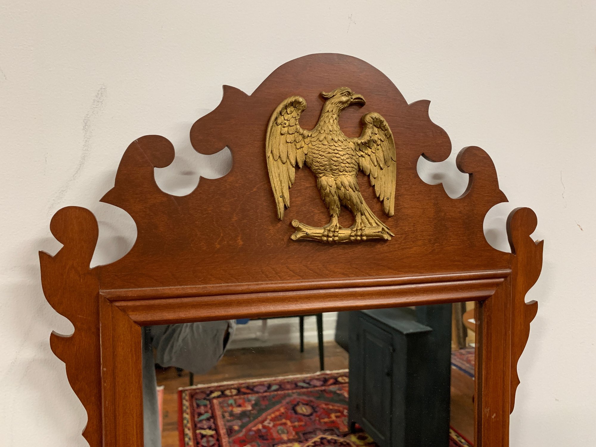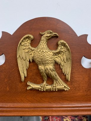 Mahogany mirror with fretwork scroll pediment topped by a gilt spread-wing eagle, matching scroll apron below. Retains original maker's label: "Hand Crafted by Adams Cabinet Shop, Marblehead, Mass."