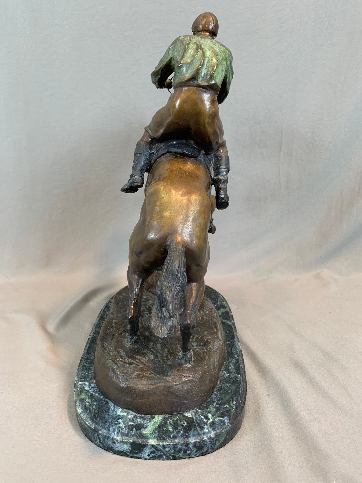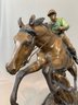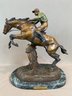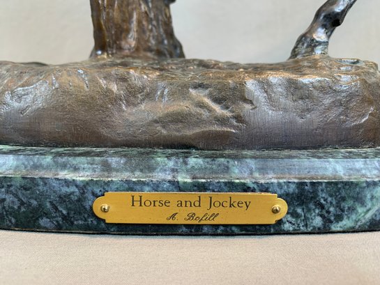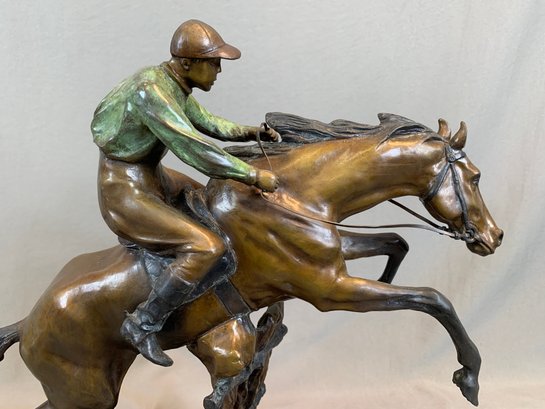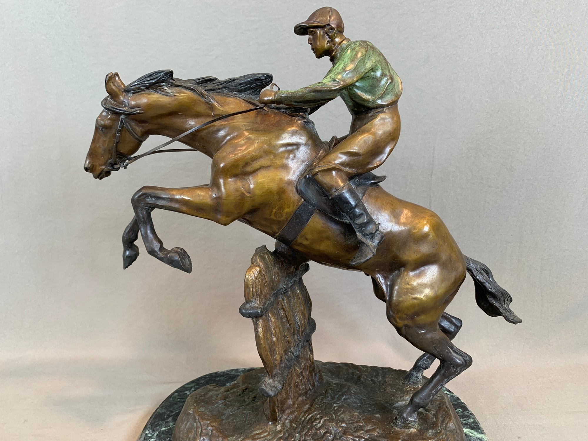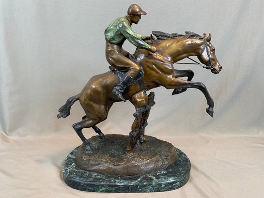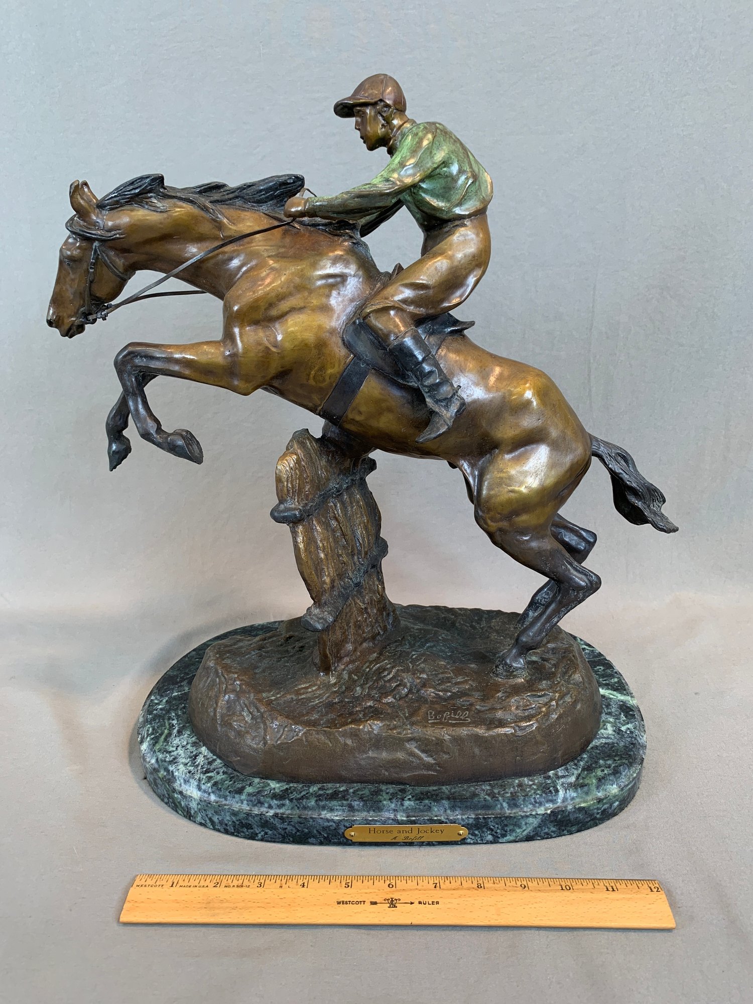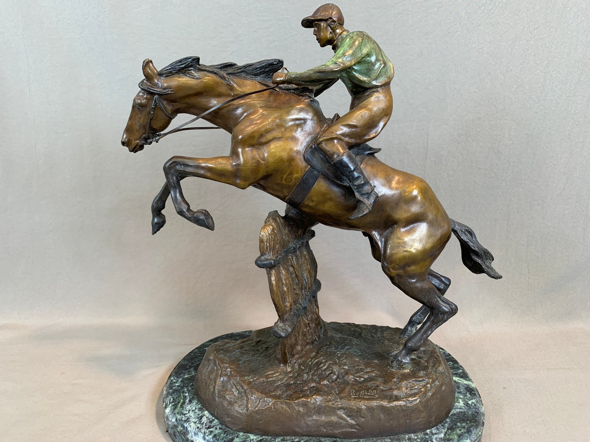Bronze sculpture of a horse and jockey clearing a jump, after Spanish sculptor Antoine Bofill (1875-1921), signed on the base and mounted on a green marble base with brass title plaque.