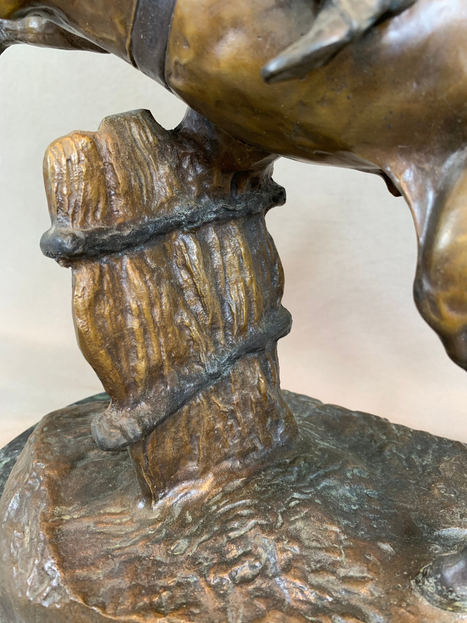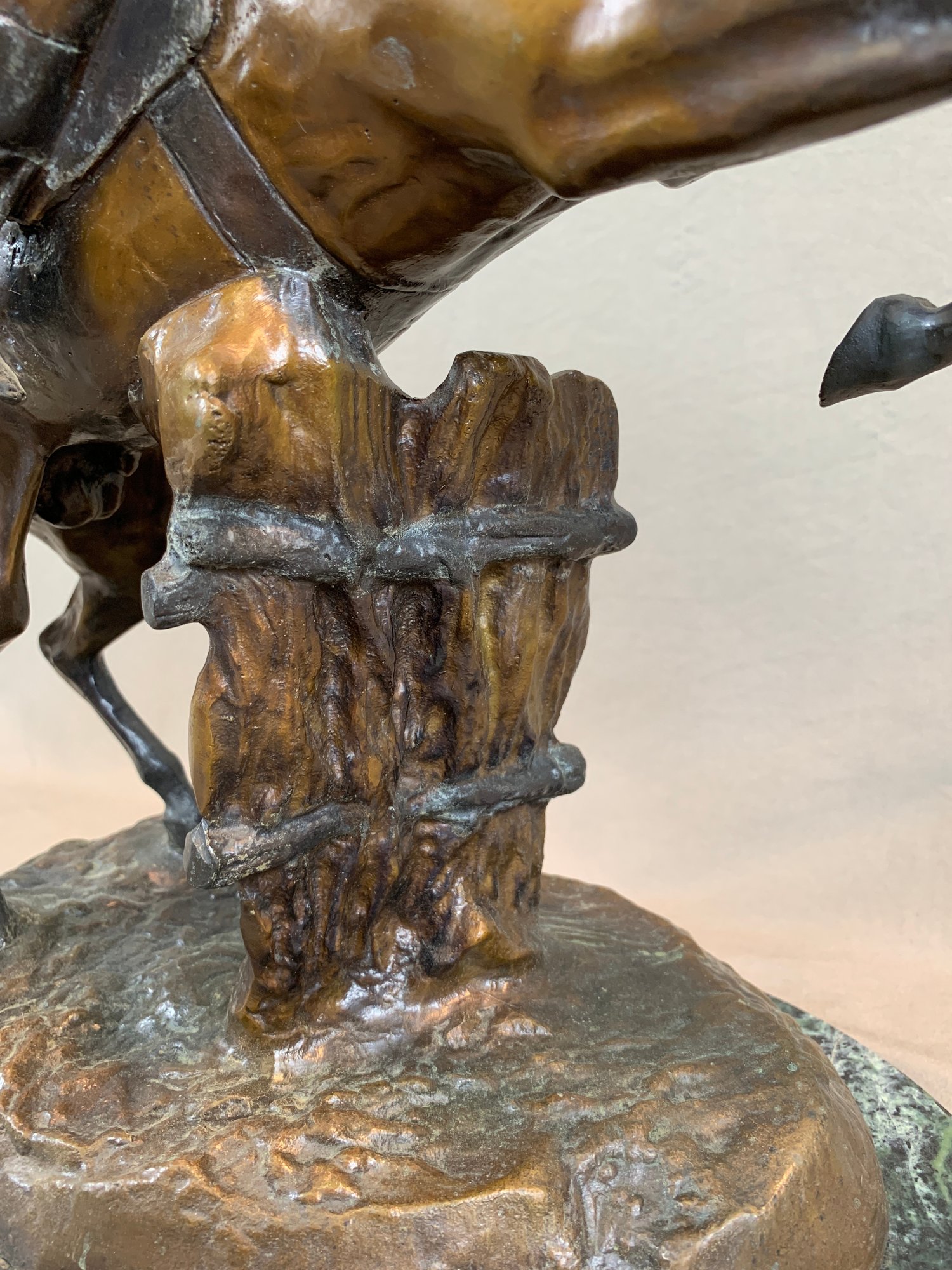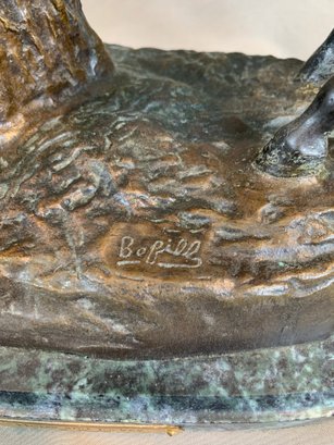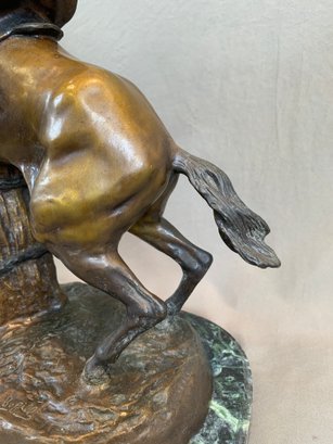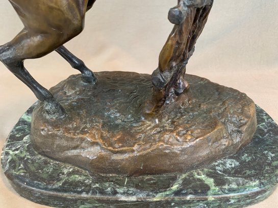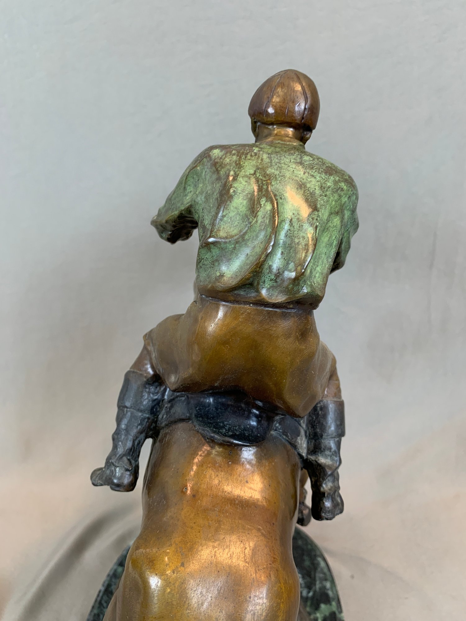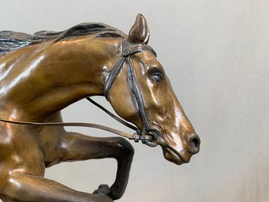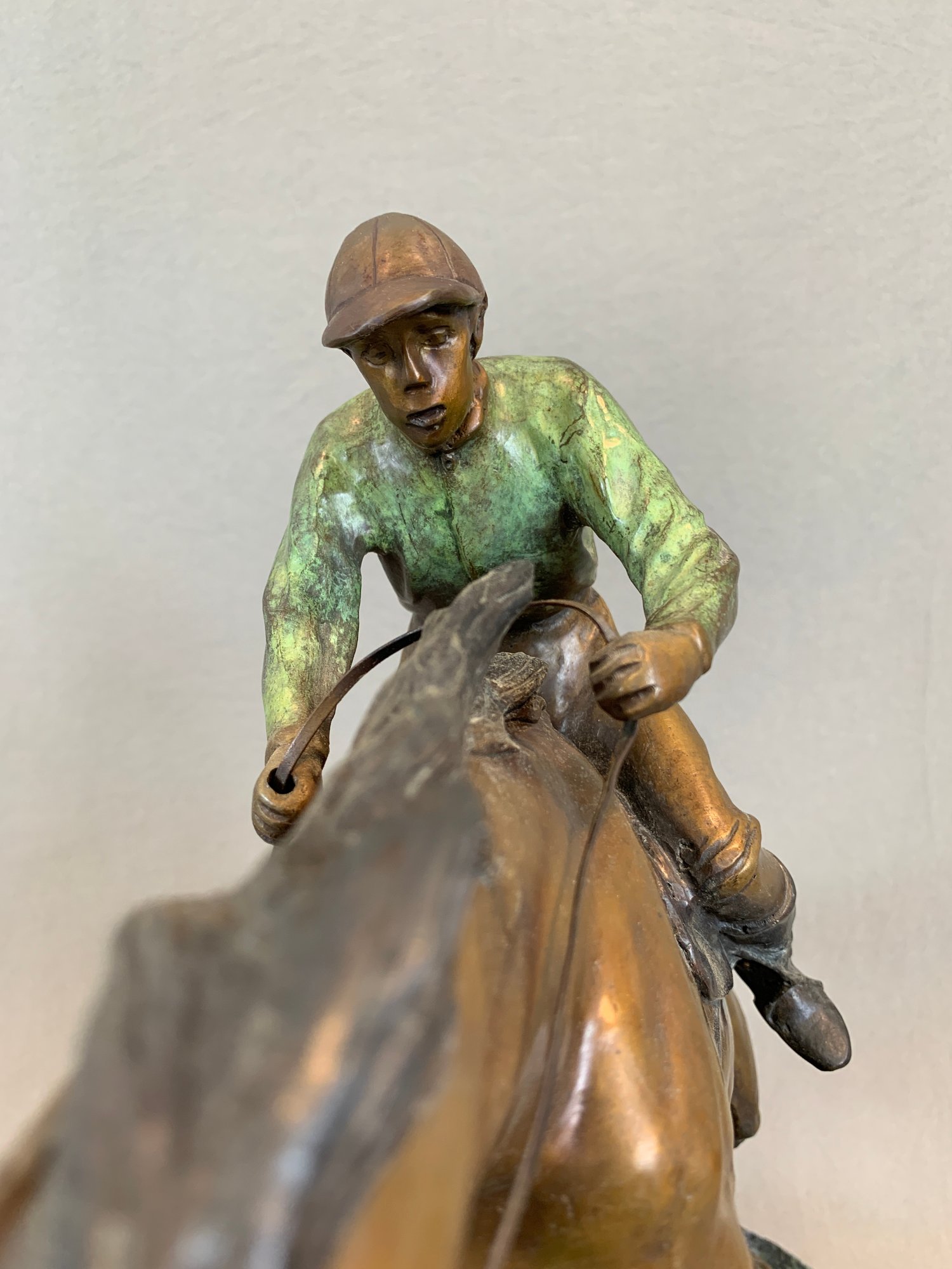 Bronze sculpture of a horse and jockey clearing a jump, after Spanish sculptor Antoine Bofill (1875-1921), signed on the base and mounted on a green marble base with brass title plaque.