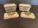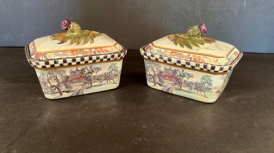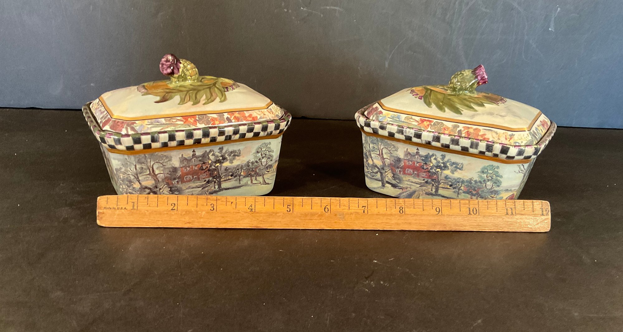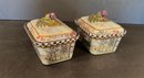 Hand paint decorated ceramic boxes, second edition. Signed on bottom and additional paper label inside.