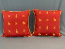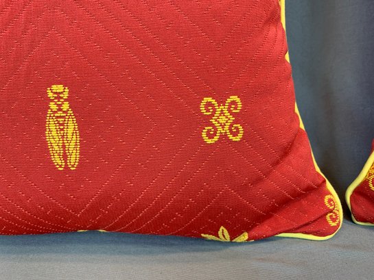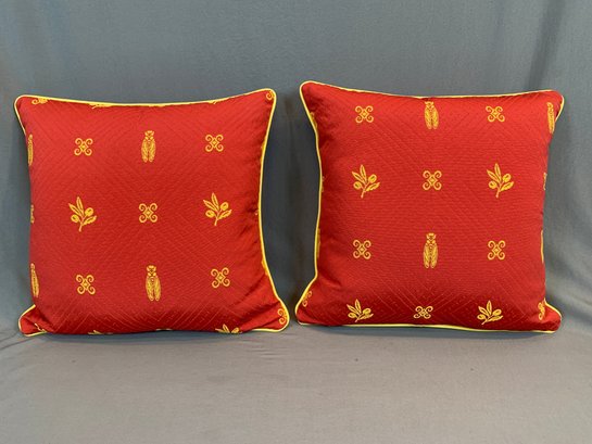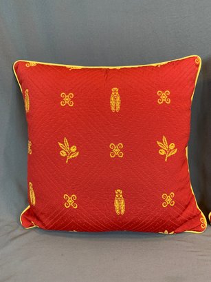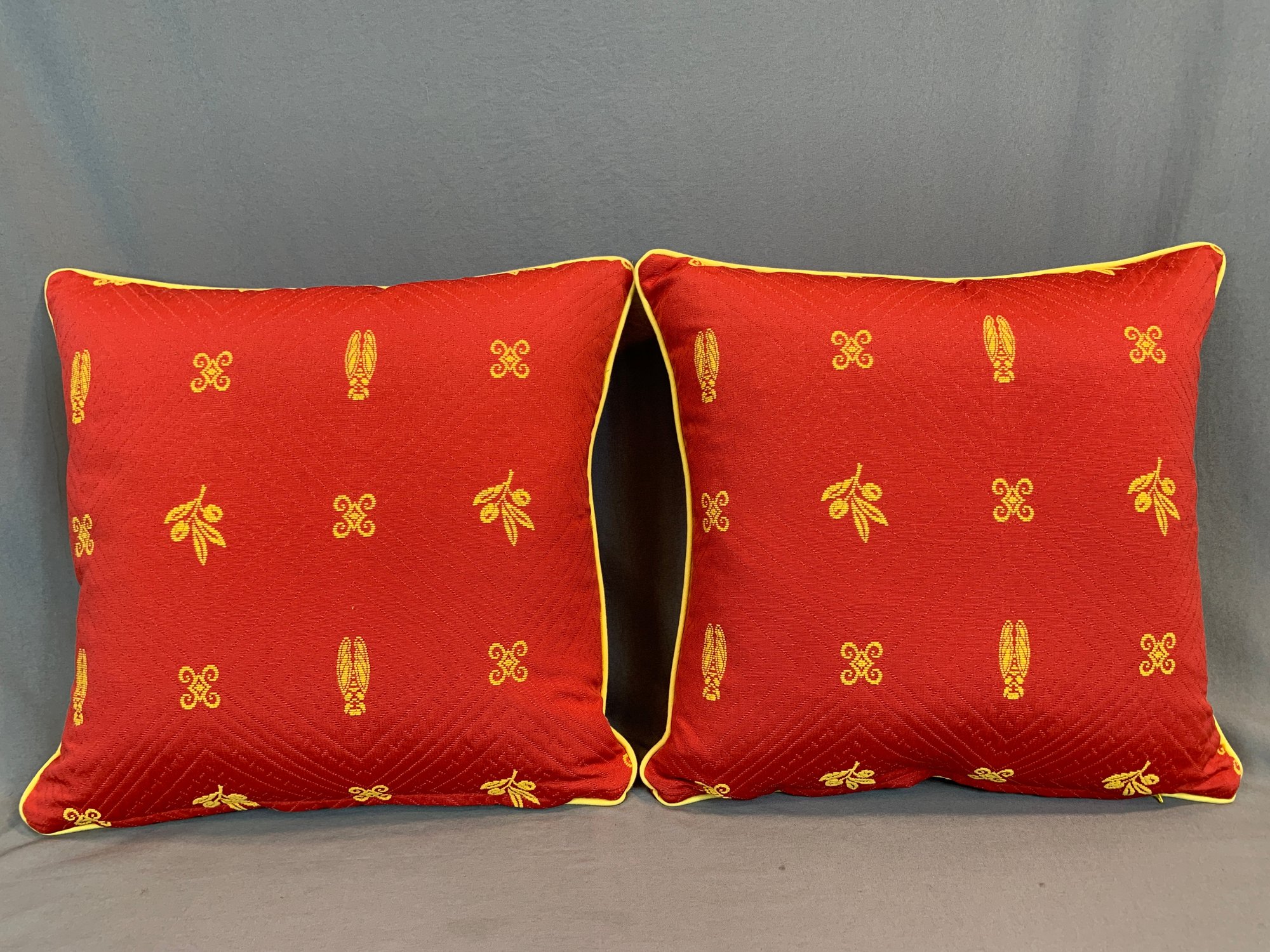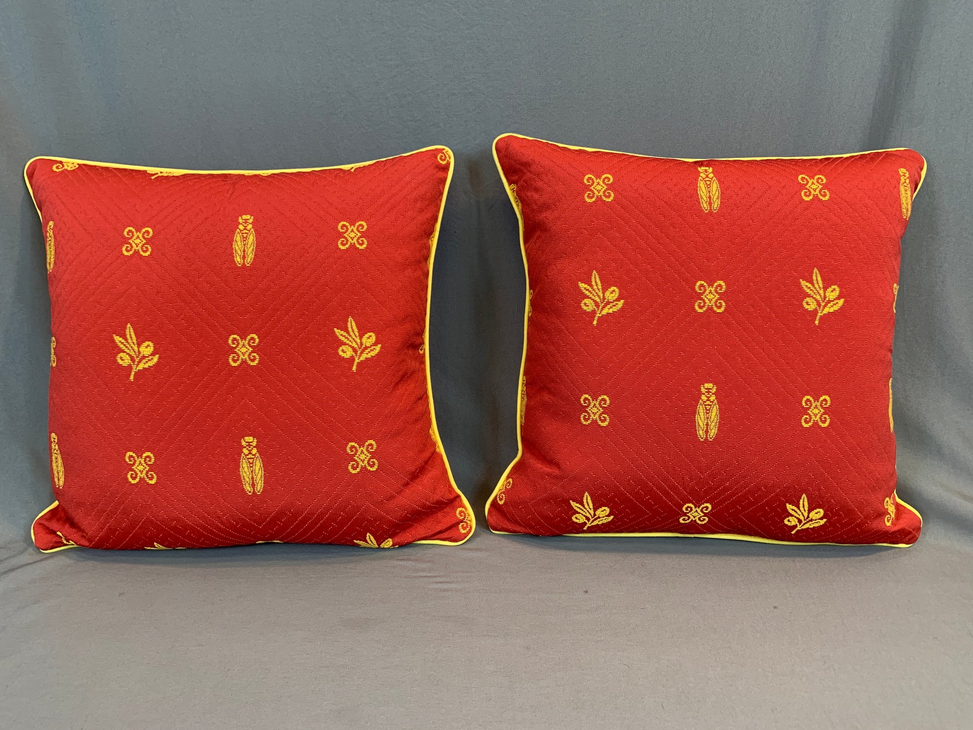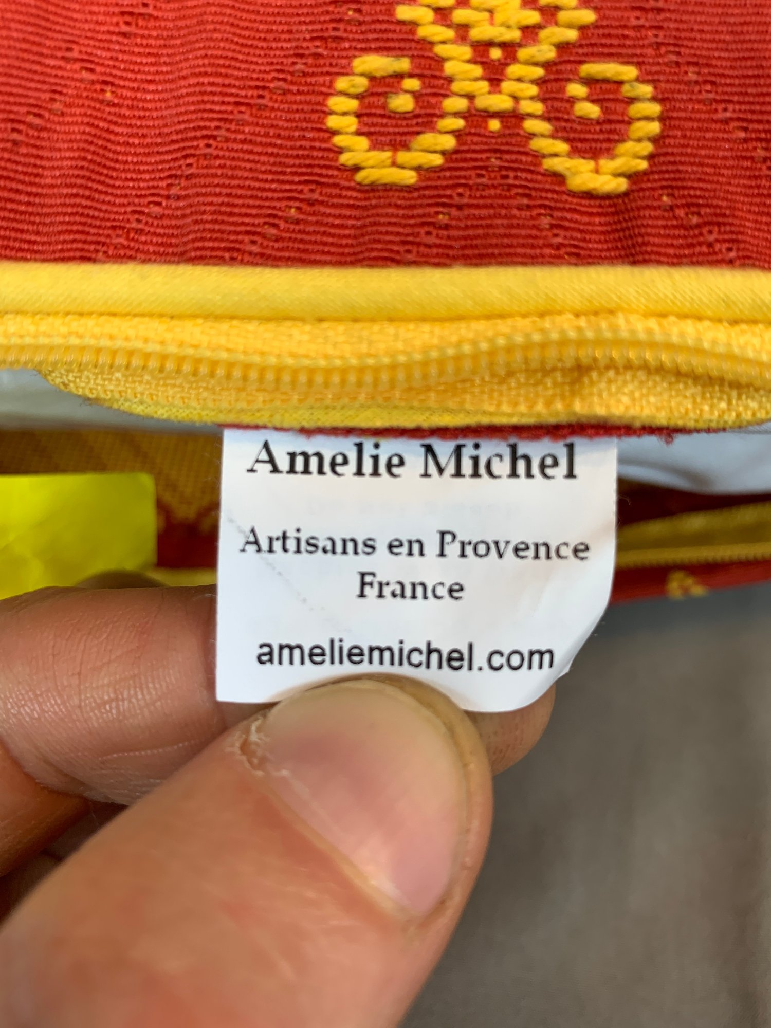 A quilted red cover with yellow stitched designs of bees and olives branches trimmed in yellow banding. Amelie Michel label inside cover.