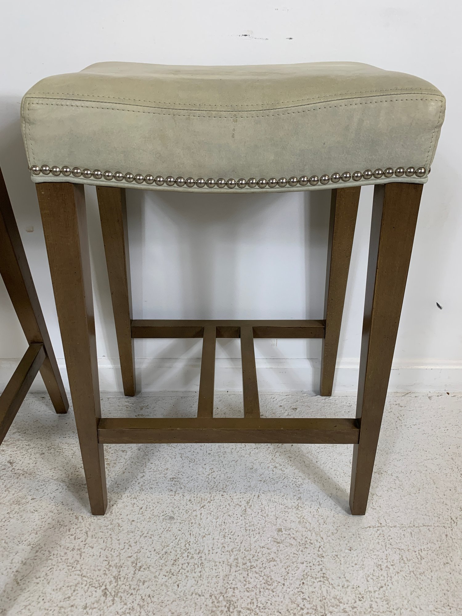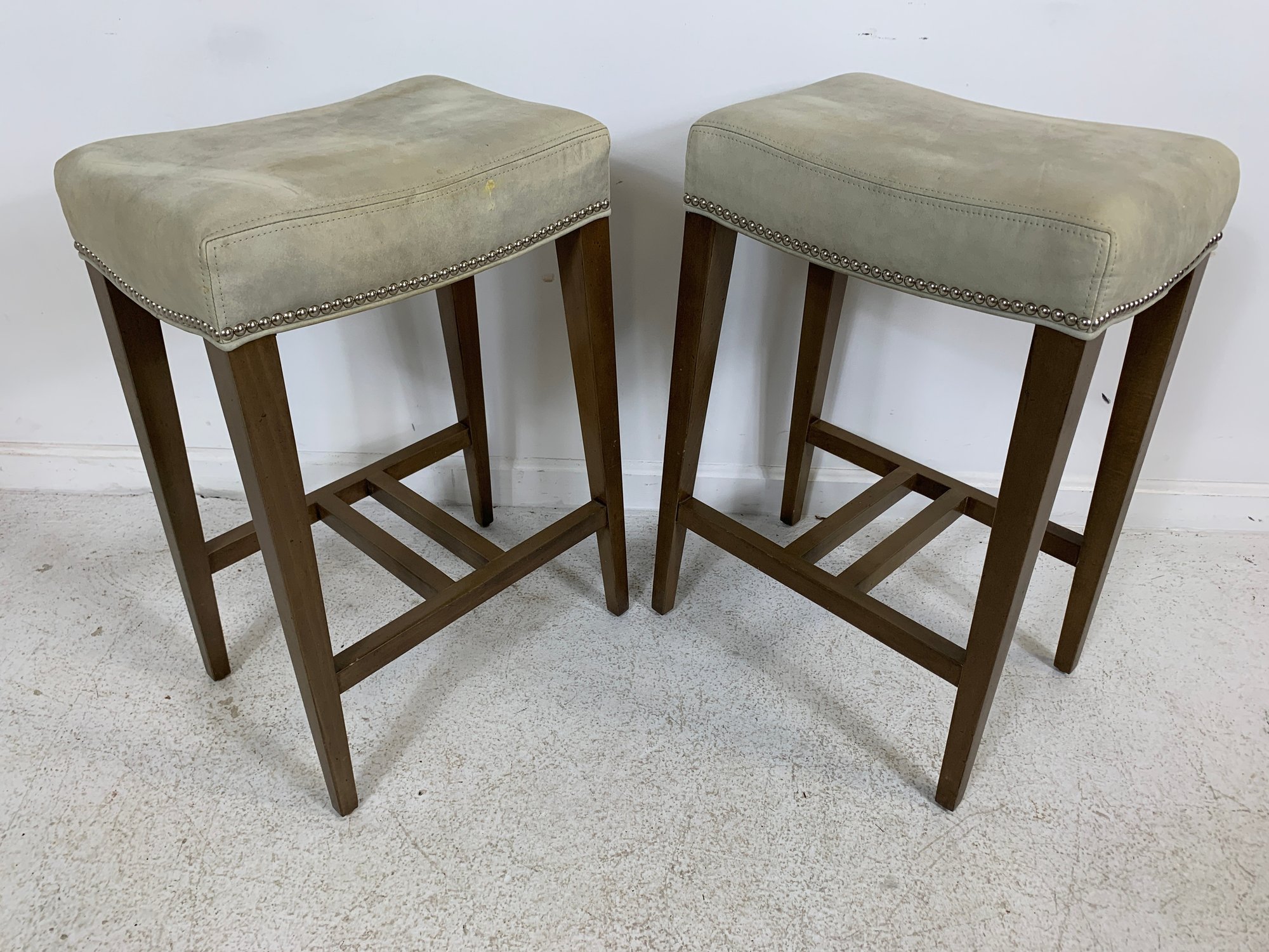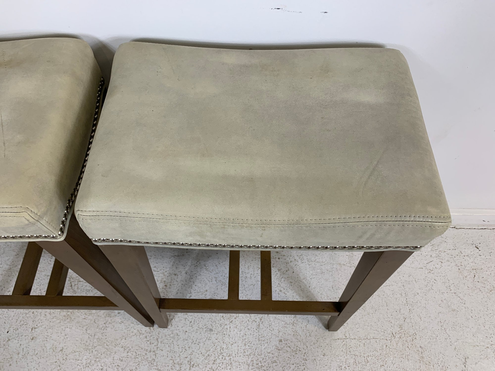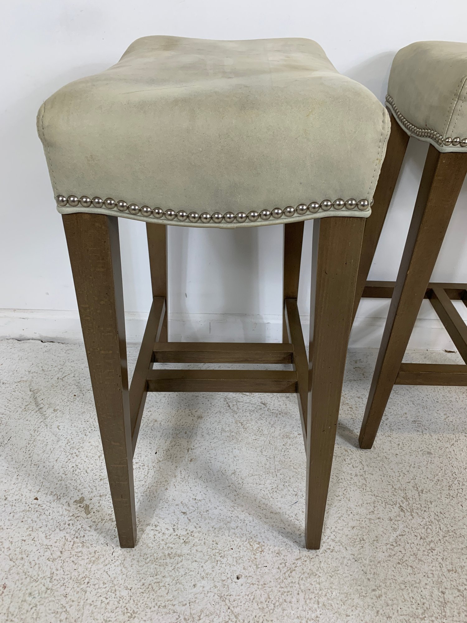 Pair of Ethan Allen backless bar stools with saddle-shaped suede upholstered seats trimmed with silver nailhead detail, on tapered wood legs with stretchers.