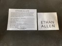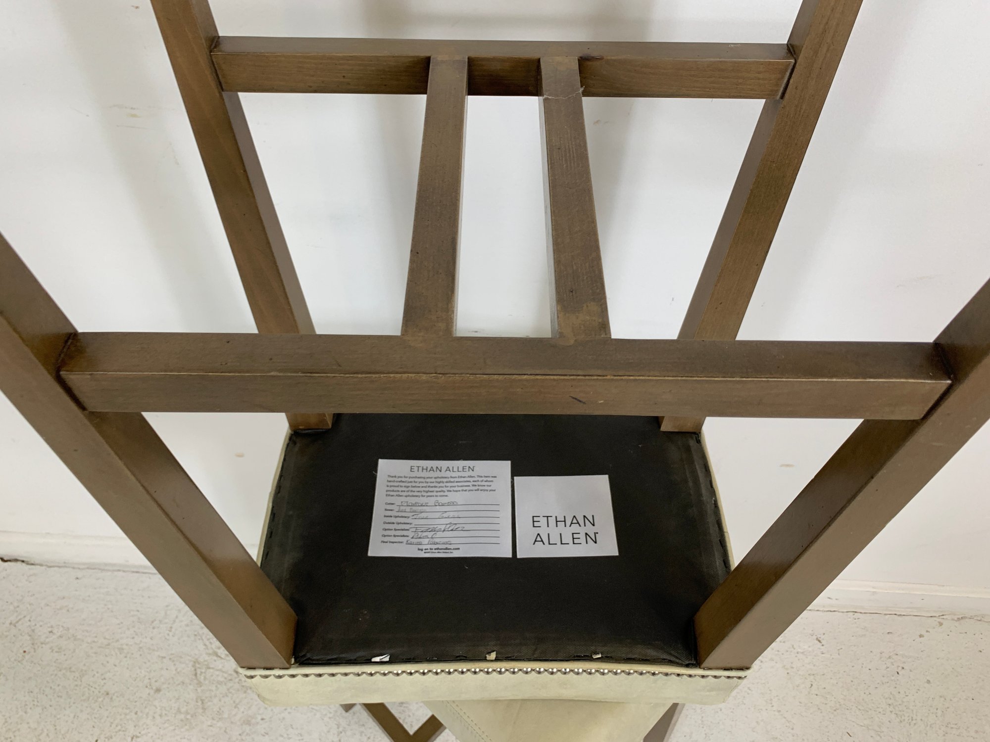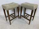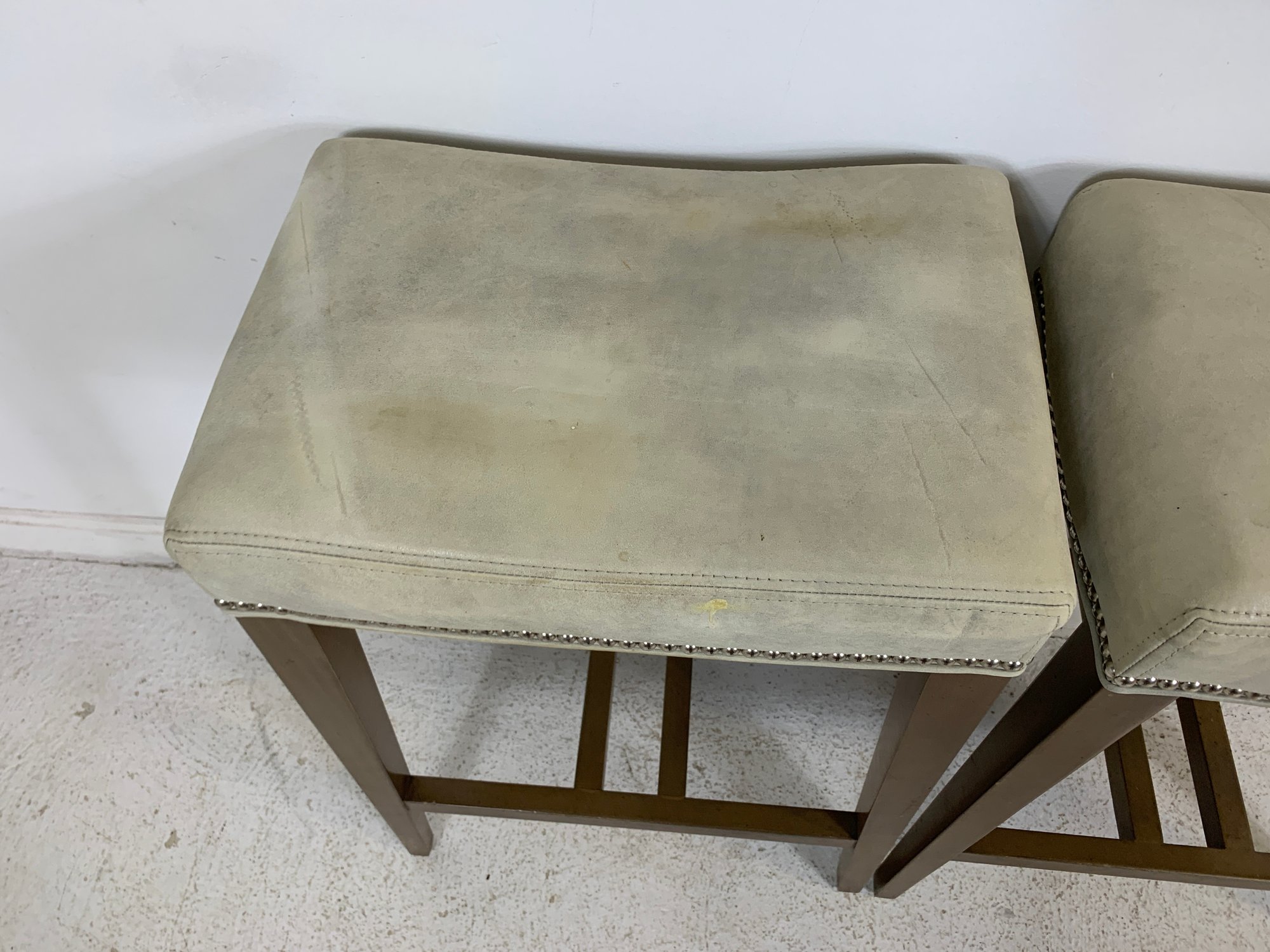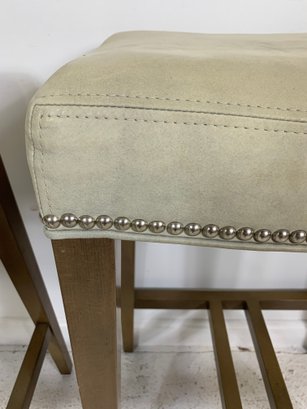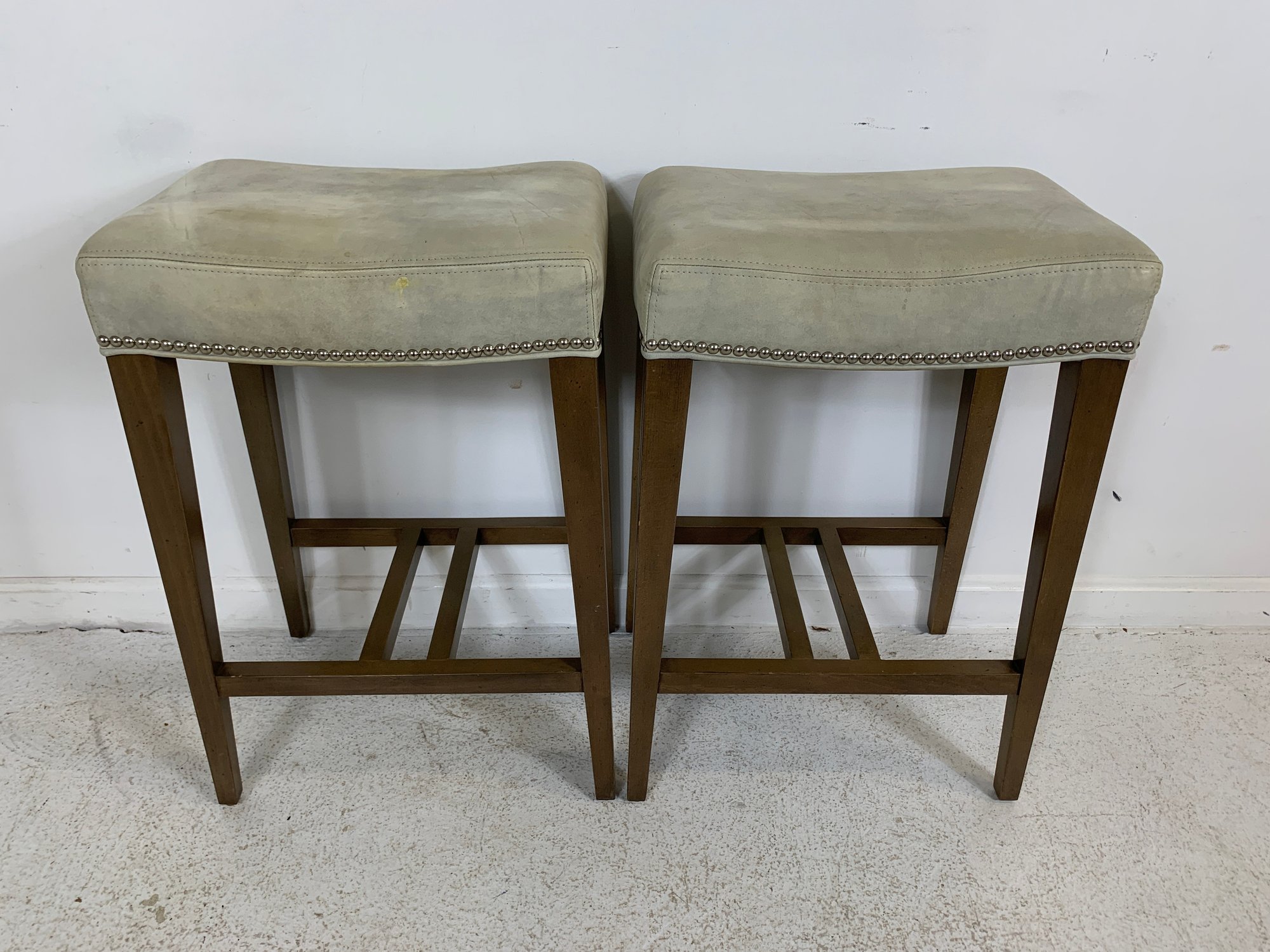 Pair of Ethan Allen backless bar stools with saddle-shaped suede upholstered seats trimmed with silver nailhead detail, on tapered wood legs with stretchers.
